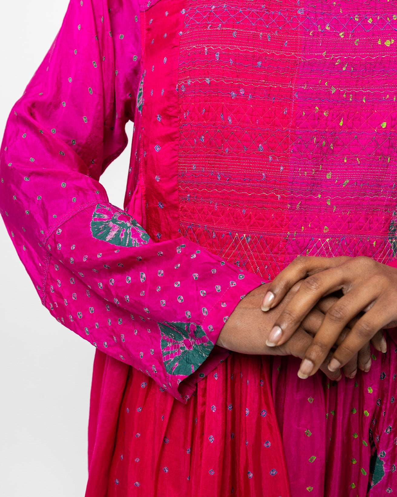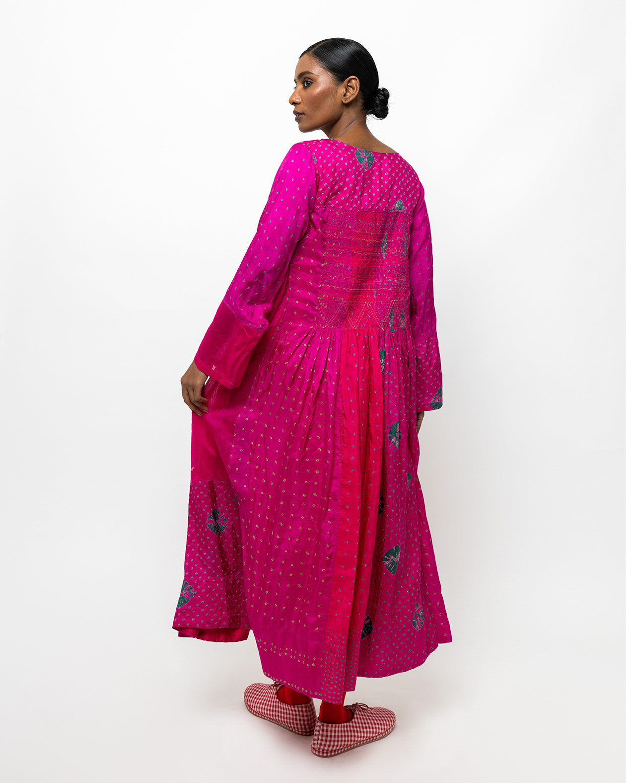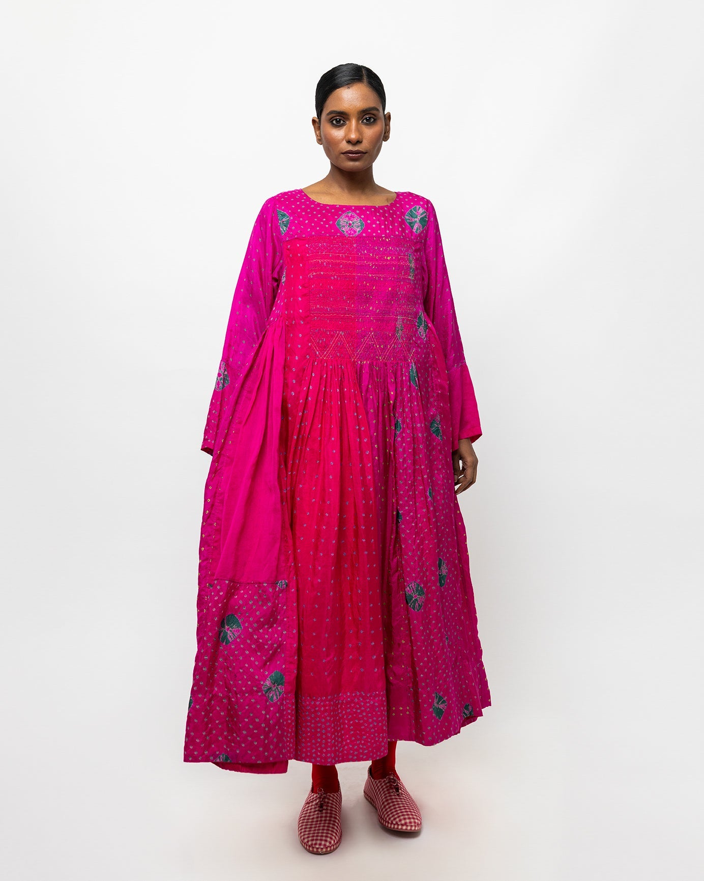 The Aabha dress, crafted in tie-dyed silk, is marked by a vibrant fuchsia ground animated with fine resist-dyed dots. The gathered silhouette opens into generous volume, allowing colour and pattern to unfold with movement. Lightweight and fluid, this dress is designed for a relaxed fit that drapes effortlessly on the body.
