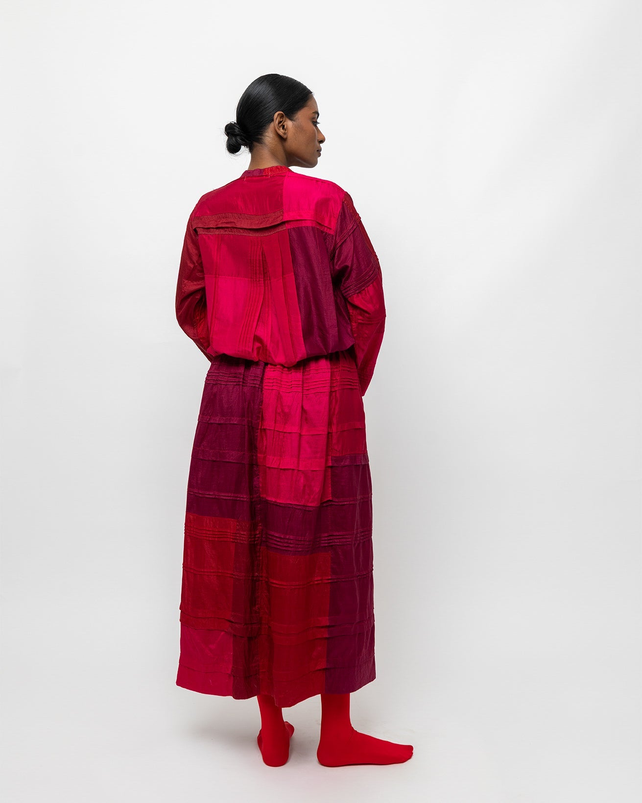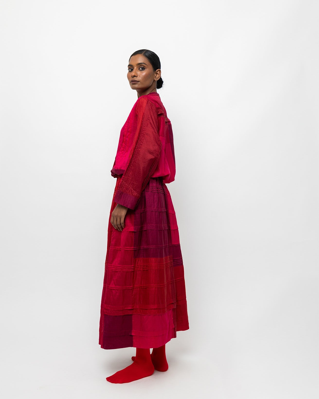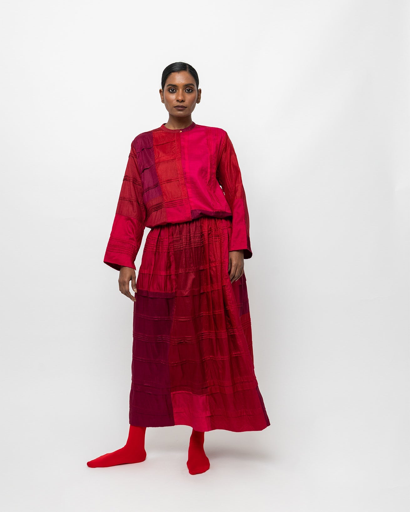 The Anandi shirt is crafted in dyed silk, featuring rich crimson and rose panels that create subtle tonal depth. Designed with a clean neckline, relaxed silhouette, and full-length sleeves, it drapes softly with an easy, fluid fall. Lightweight and refined, Raktima pairs effortlessly with matching skirts or understated separates for a quiet, confident look.
