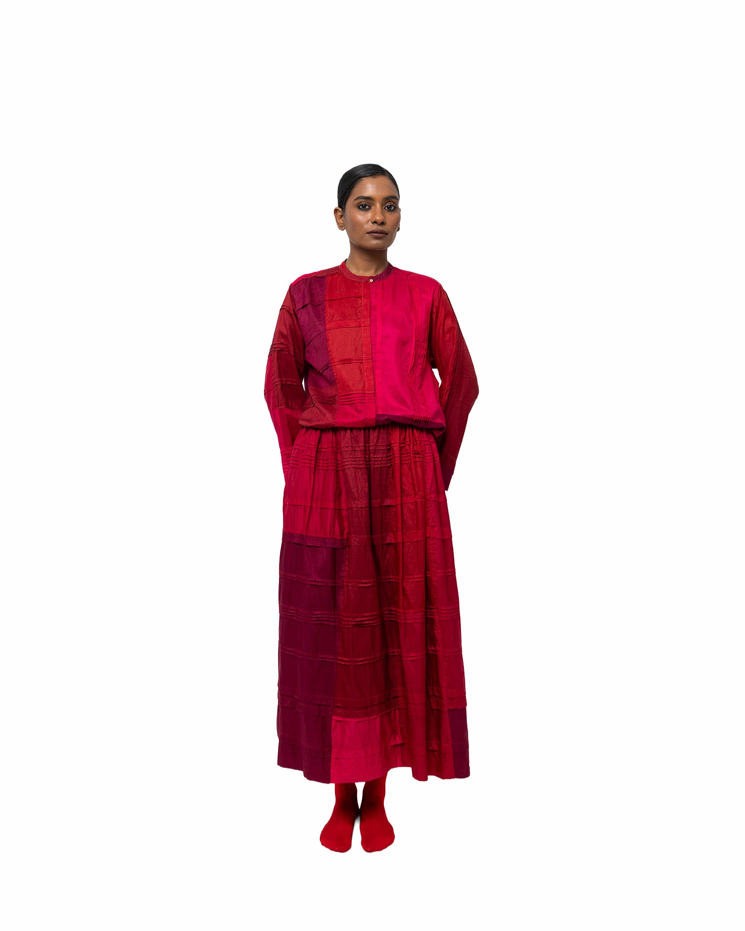 Ridhima skirt in layered crimson and rose cotton-silk. Light and flowing, it is made for an effortless, fluid silhouette
