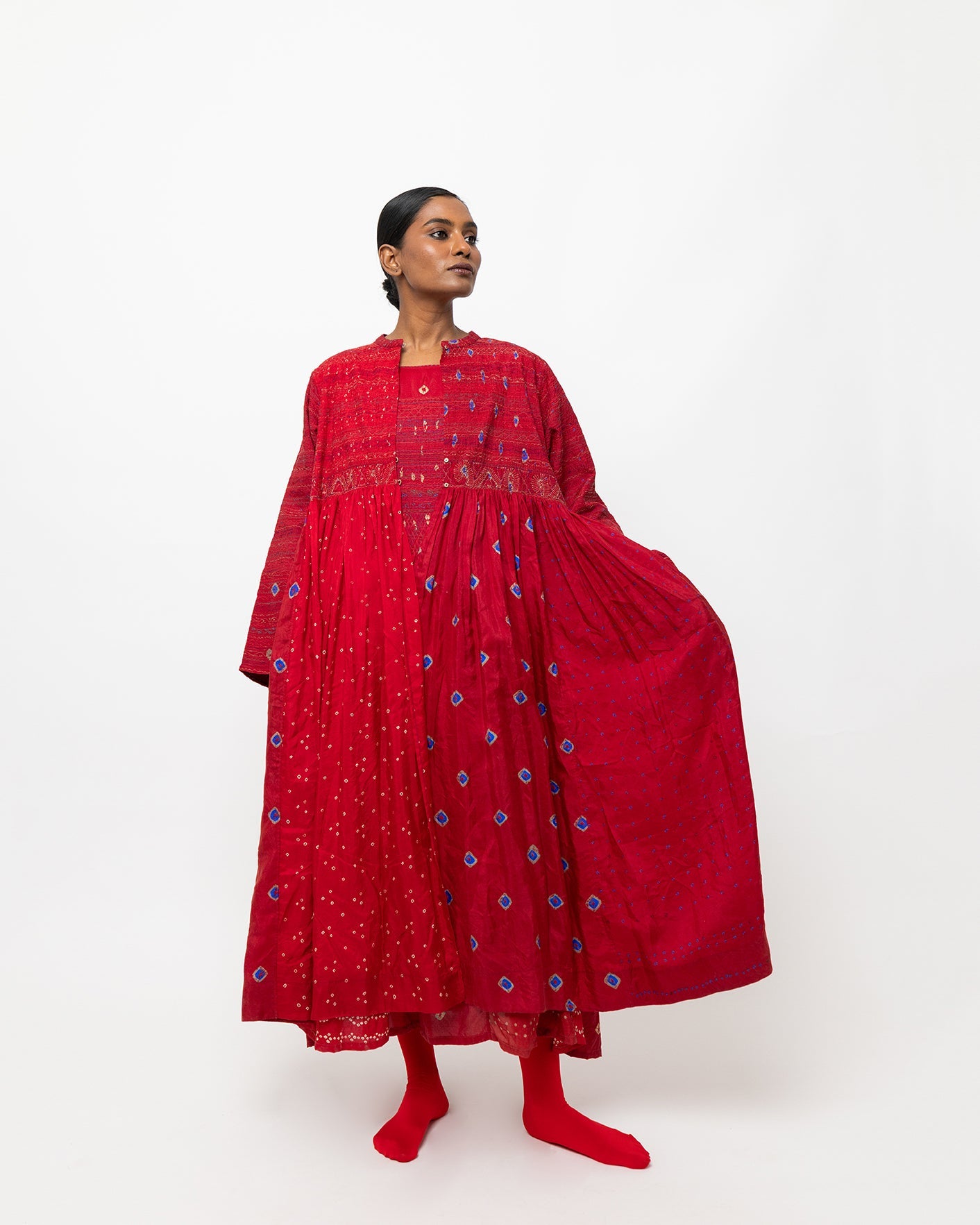 Crafted in tie-dyed silk, the Arc jacket is defined by saturated crimson tones layered with precise resist-dyed motifs. Designed with a structured yoke and a voluminous, gathered silhouette, it creates a bold interplay of form, movement, and colour for expressive, lightweight layering.