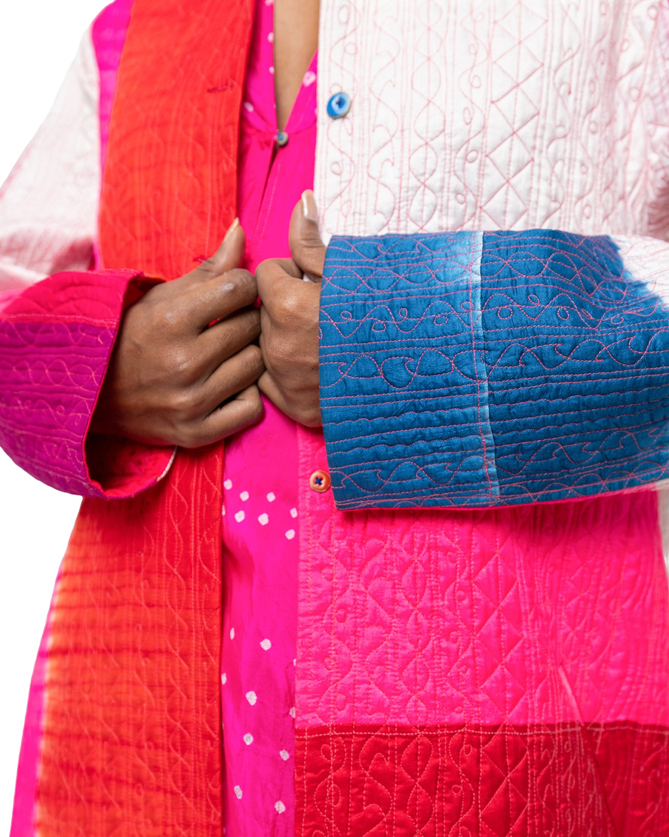 The textile is tie-dyed in Gujarat using Bandhani technique
