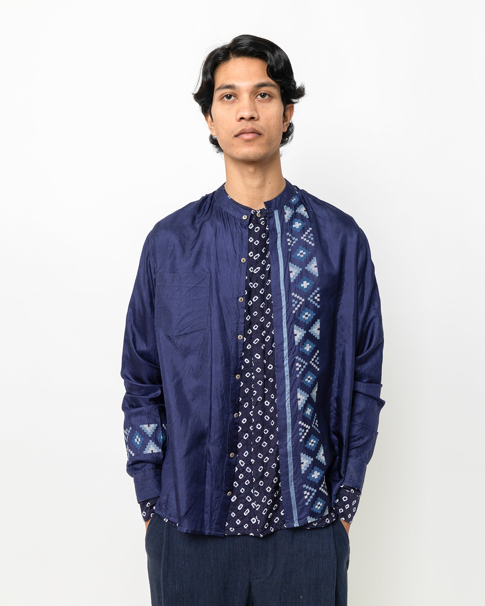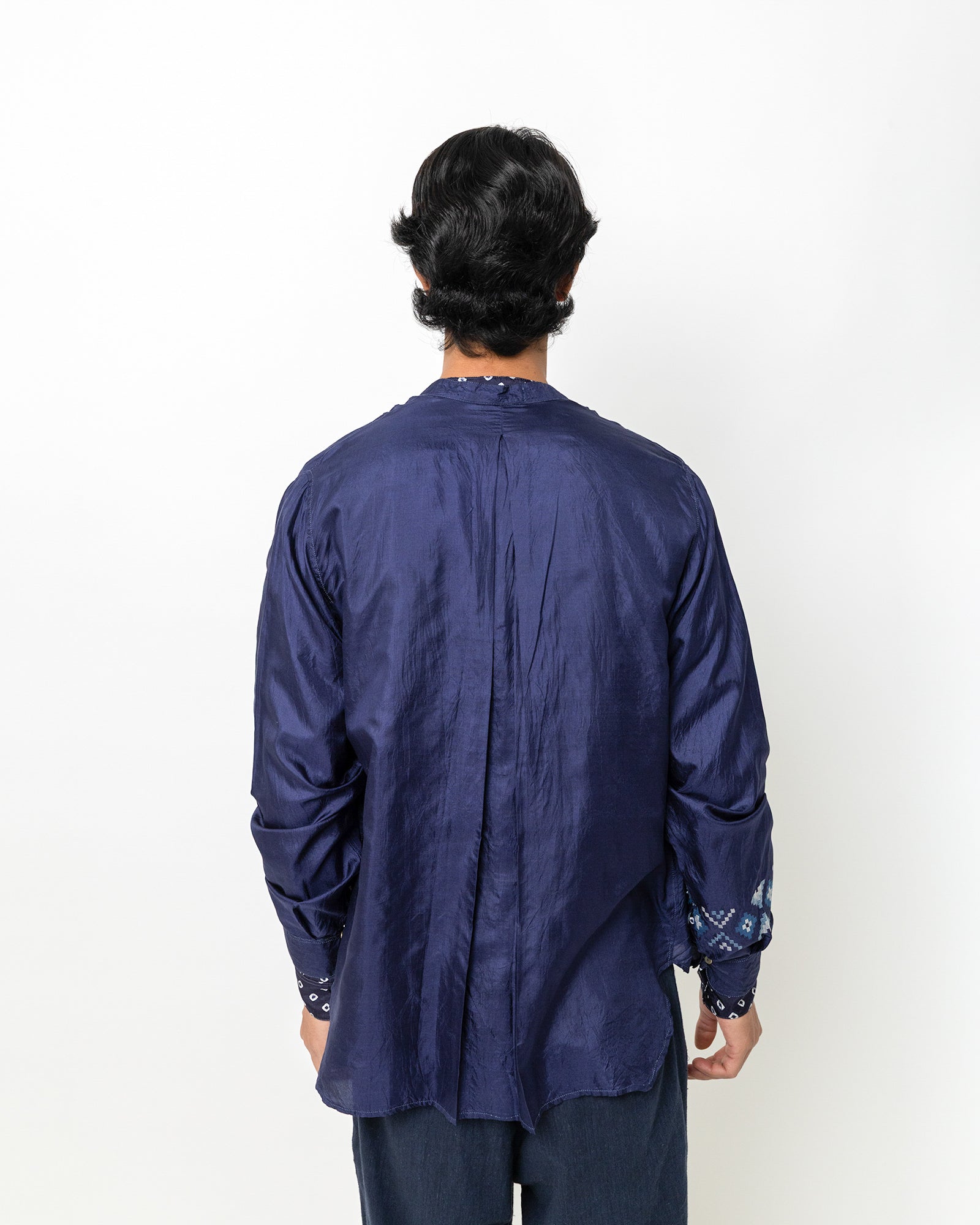 The Ashok Silk Shirt is crafted in handwoven silk with extra-weft detailing from Bengal. Designed with full-length sleeves and a band collar, it features a regular fit and a striking woven panel along the placket and cuff.