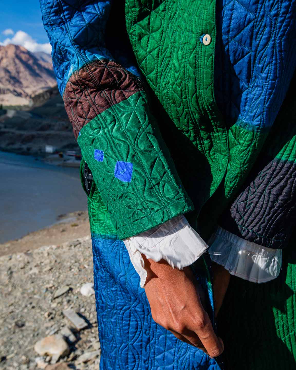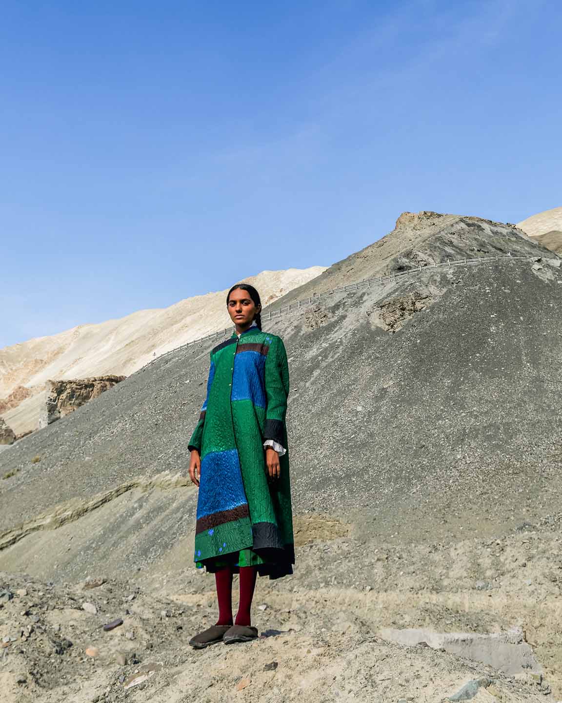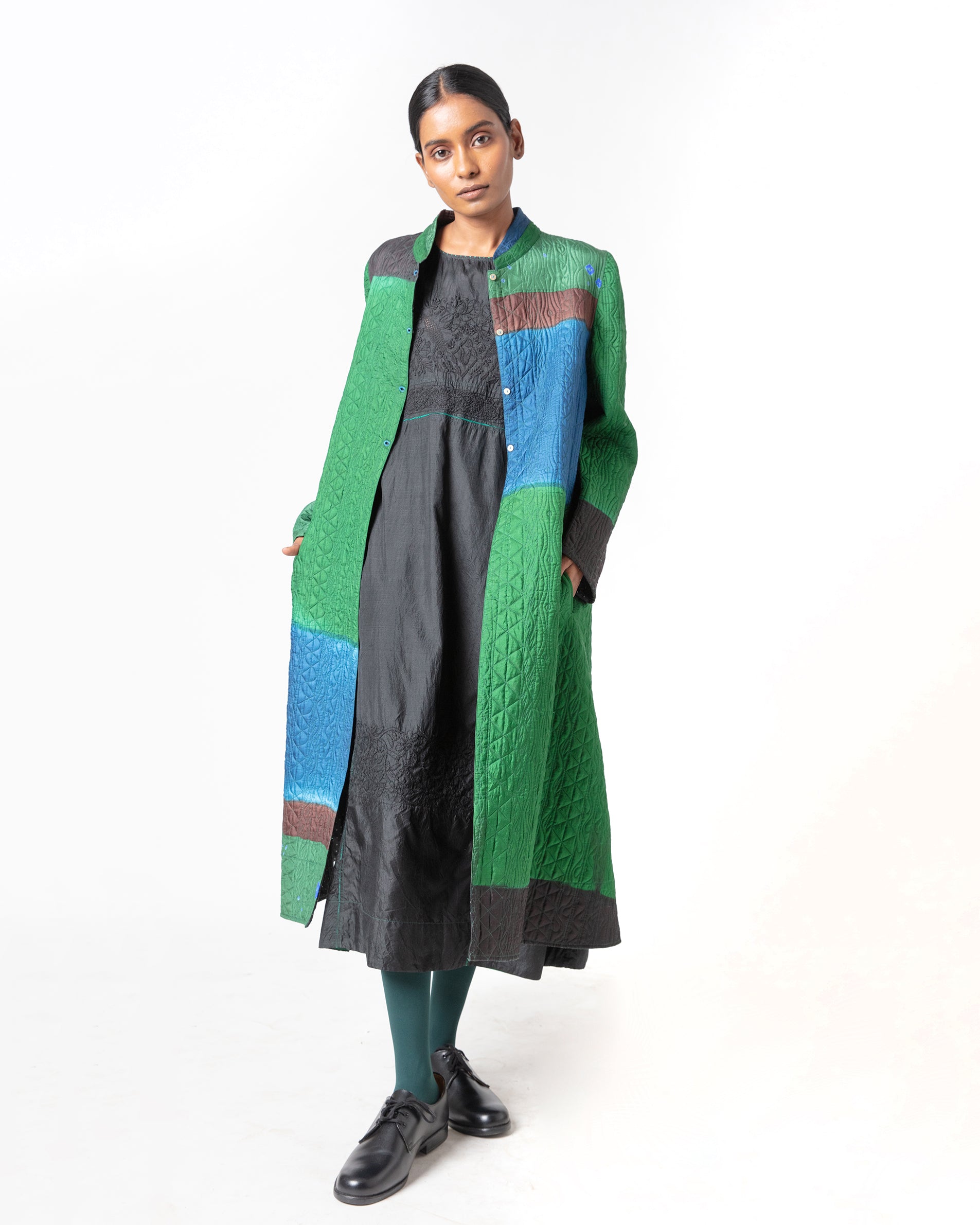 Indus Jacket in soft wool, handwoven in Gujarat, in blue, black, and red stripes. It features a closed neckline with buttons, a gathered waist, and embroidered yoke detailing. The structured yet relaxed design makes it suitable for early winter and ideal for layering.