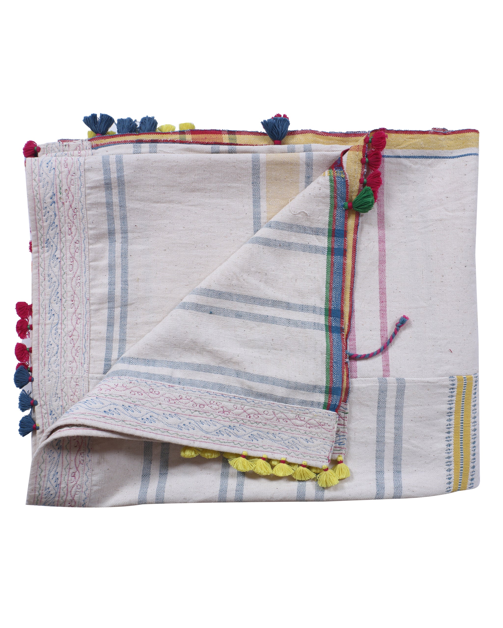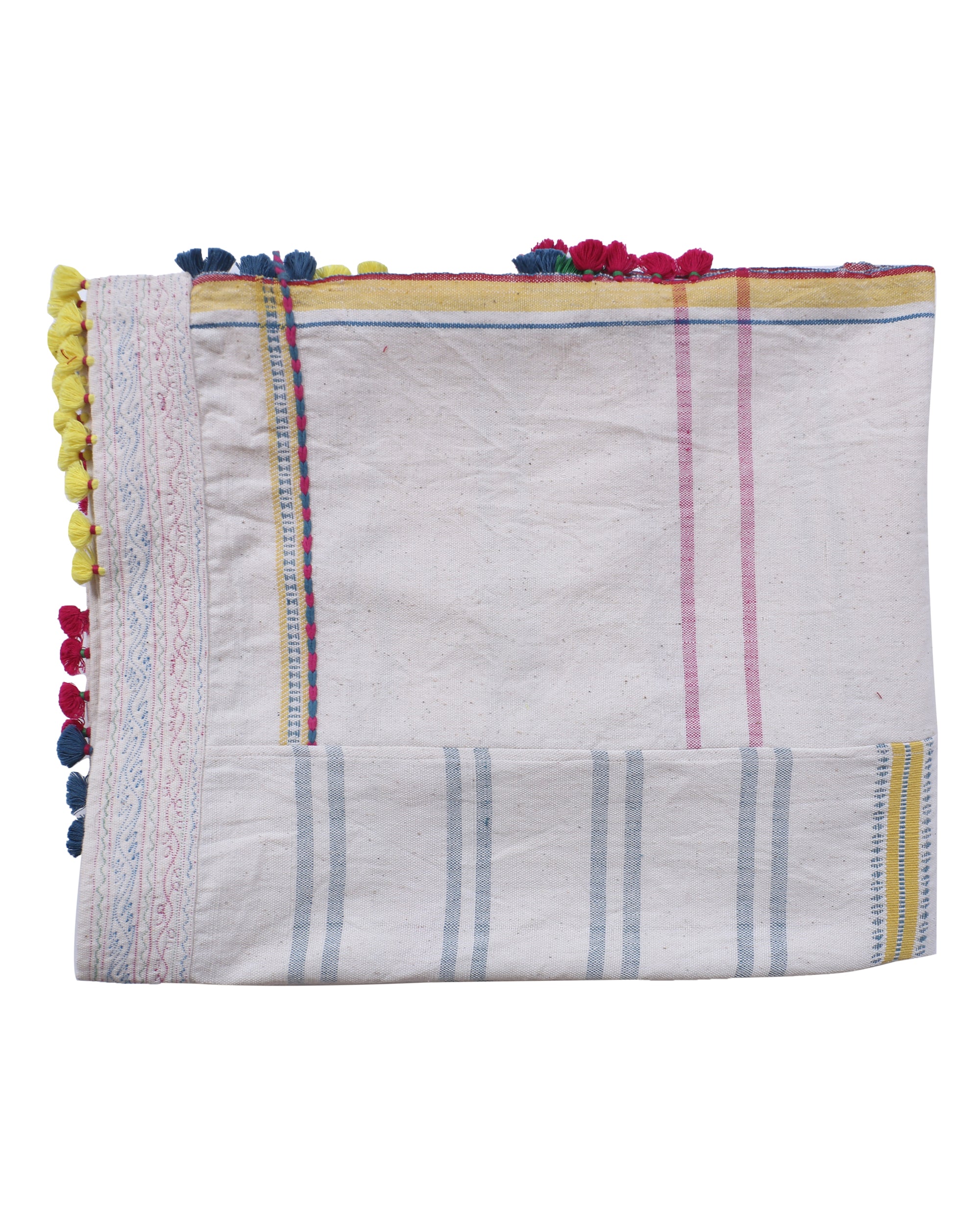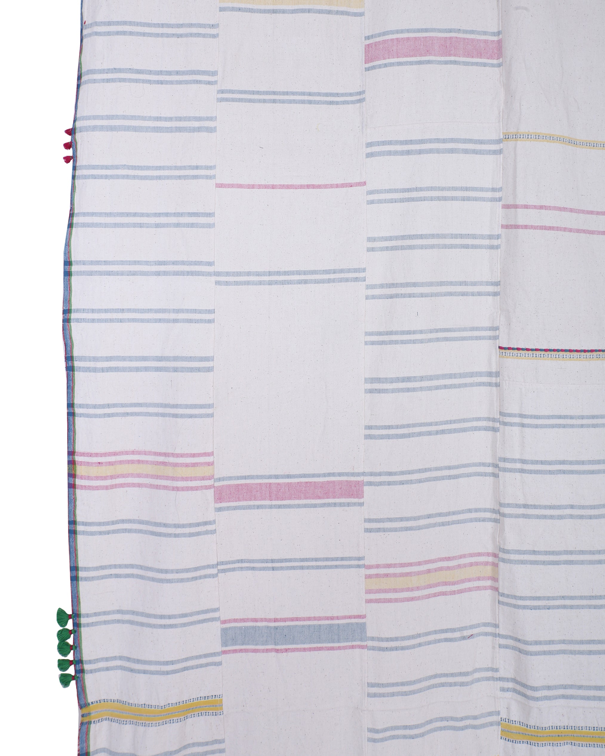 With rhythmic soft horizontal stripes and finely handcrafted tassels, this 'Bedi' Bhujodi bedcover reflects the quiet beauty of traditional weaving. A versatile addition to any home.