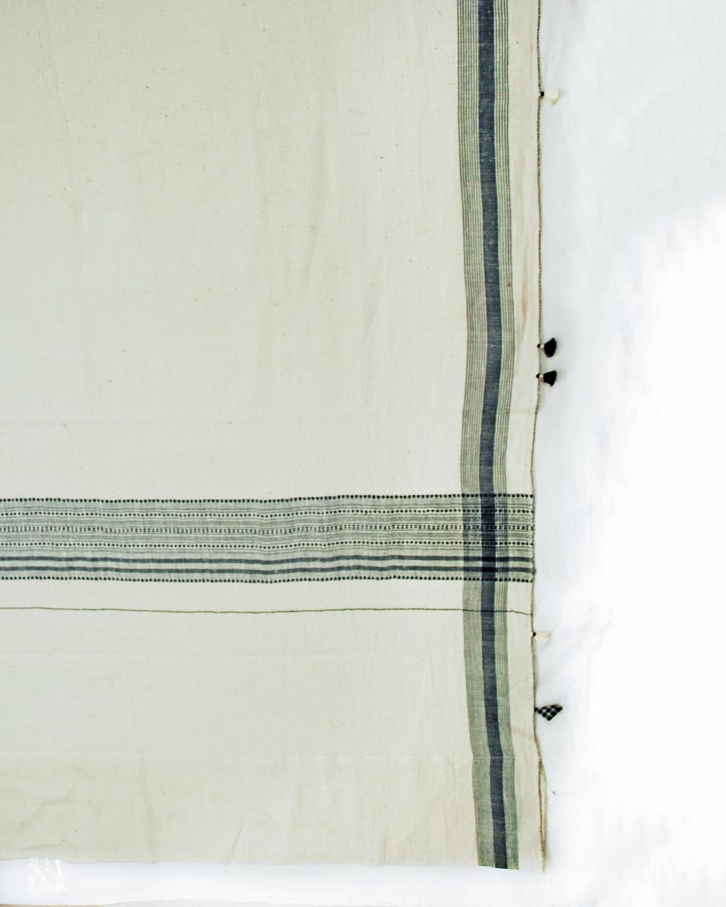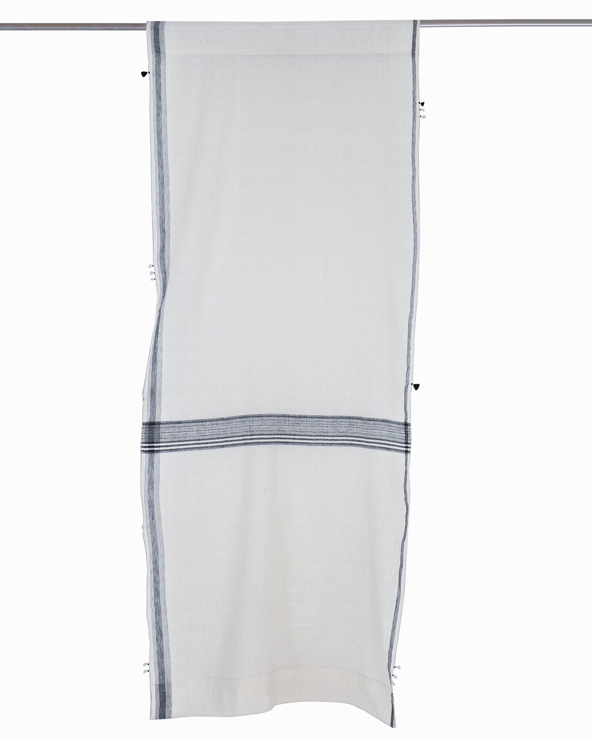 The Bhim Curtain stands as a bold yet minimal homage to Bhujodi weaving. With a soft beige kala cotton base, its charm lies in the intricate detailing on the lower edge, crafted in a striking black-and-white palette. Striped accents on both sides add a graphic rhythm, framing the design with clean, modern lines. Finished with playful tassels, the Bhim Curtain seamlessly blends simplicity with tradition, creating a grounded yet stylish addition to any space.