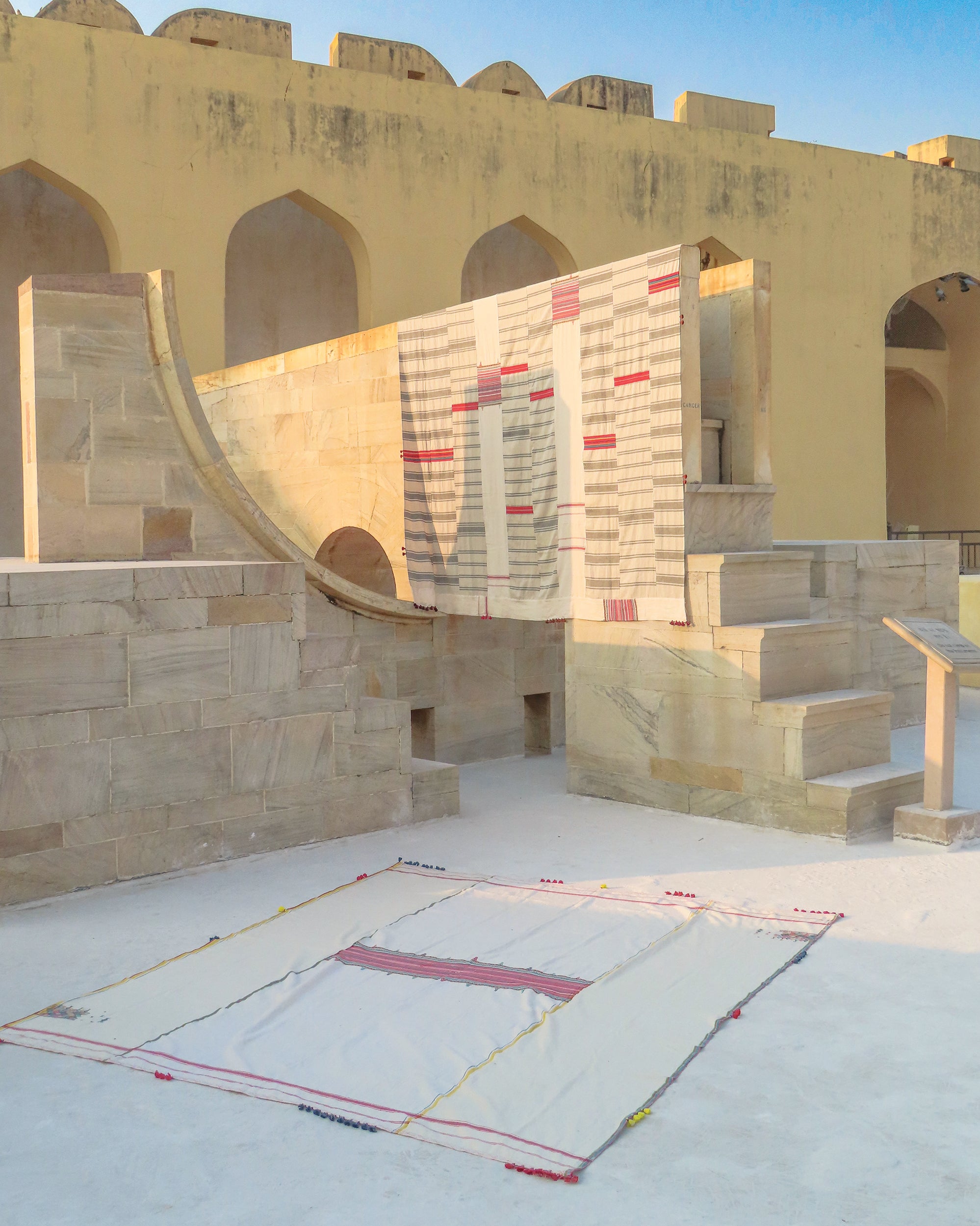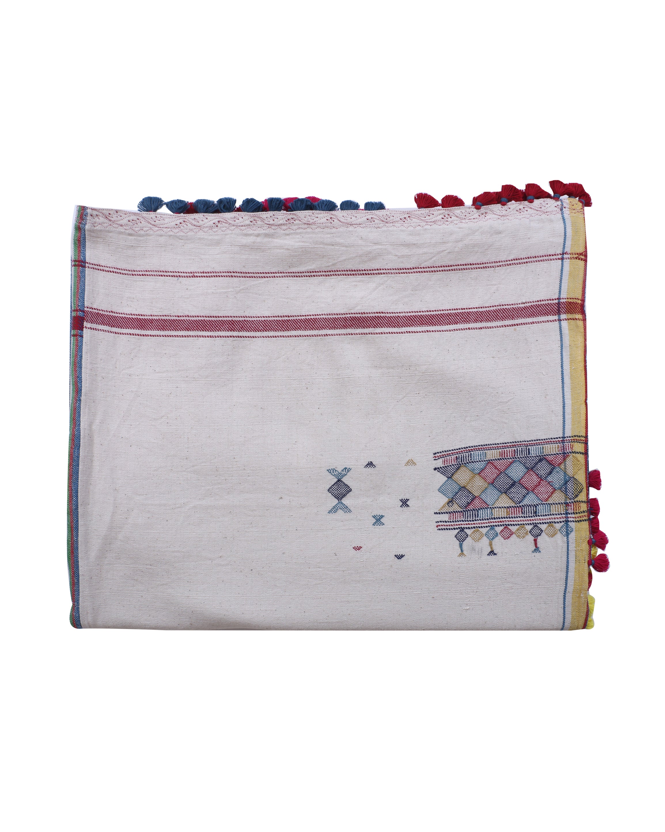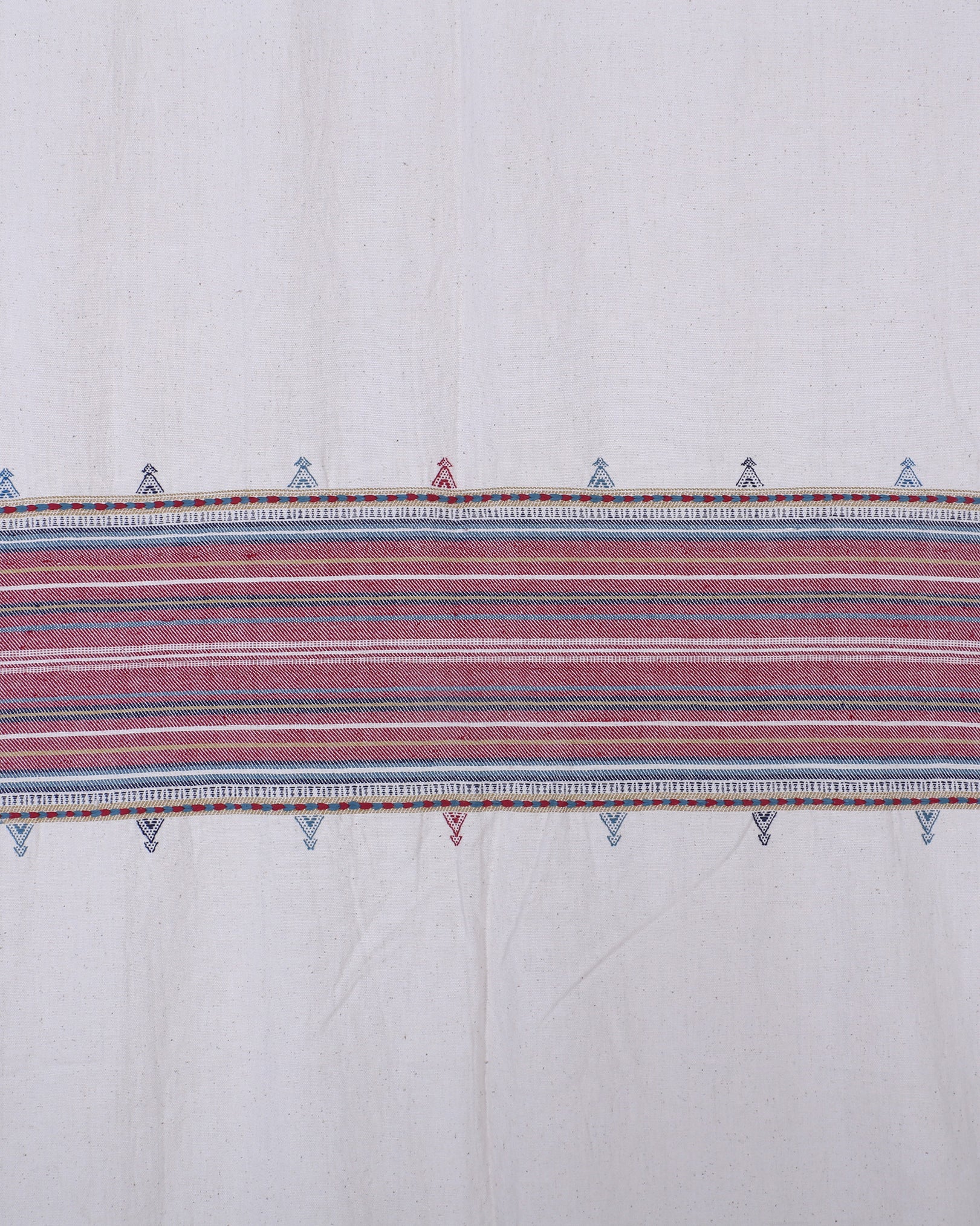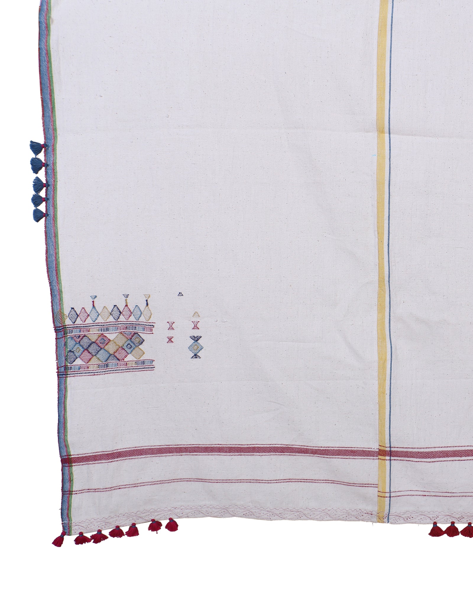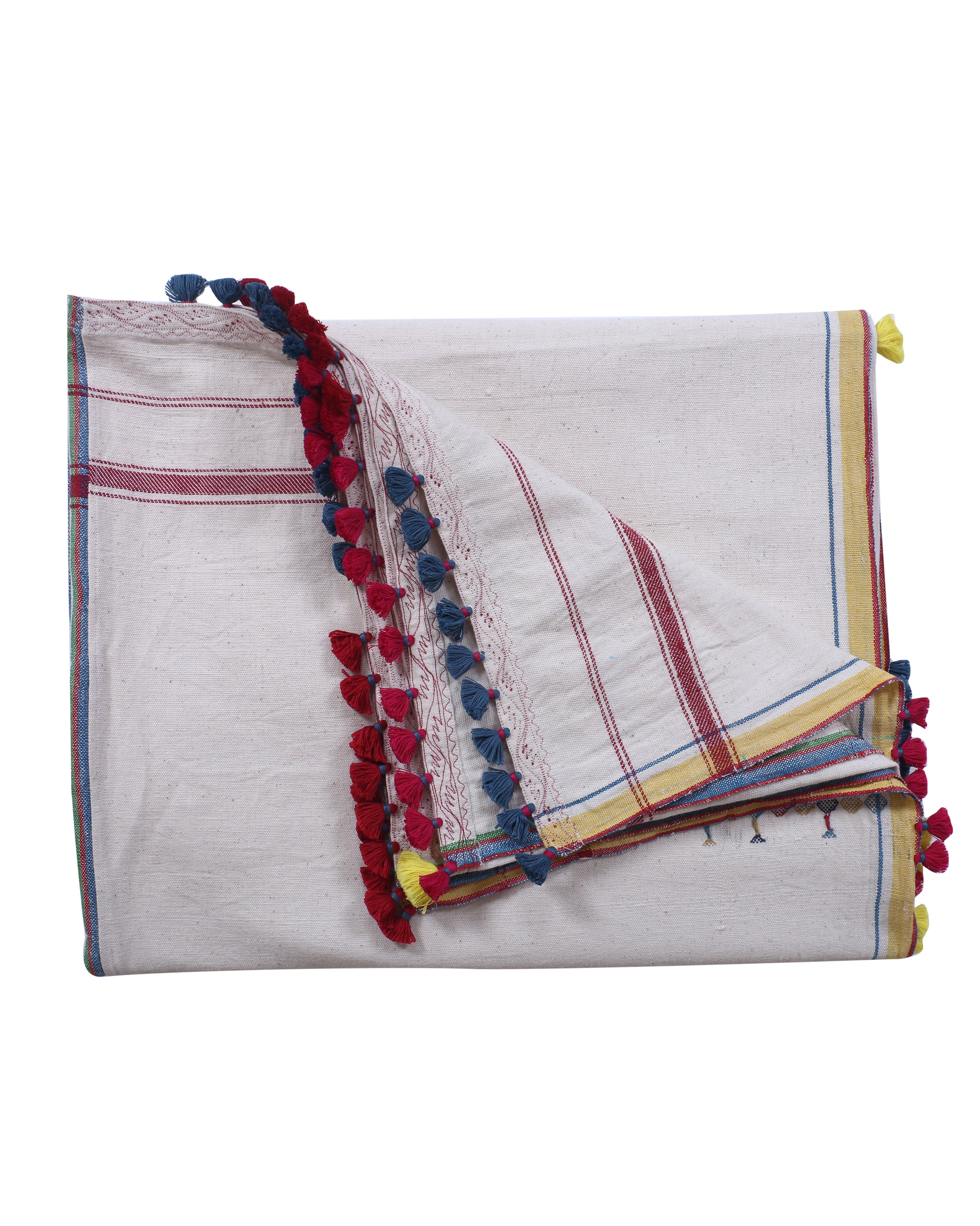 Defined by intricate striped detailing and soft tassels, this 'Bhinmal' bhujodi bedcover offers a refined expression of handwoven mastery.