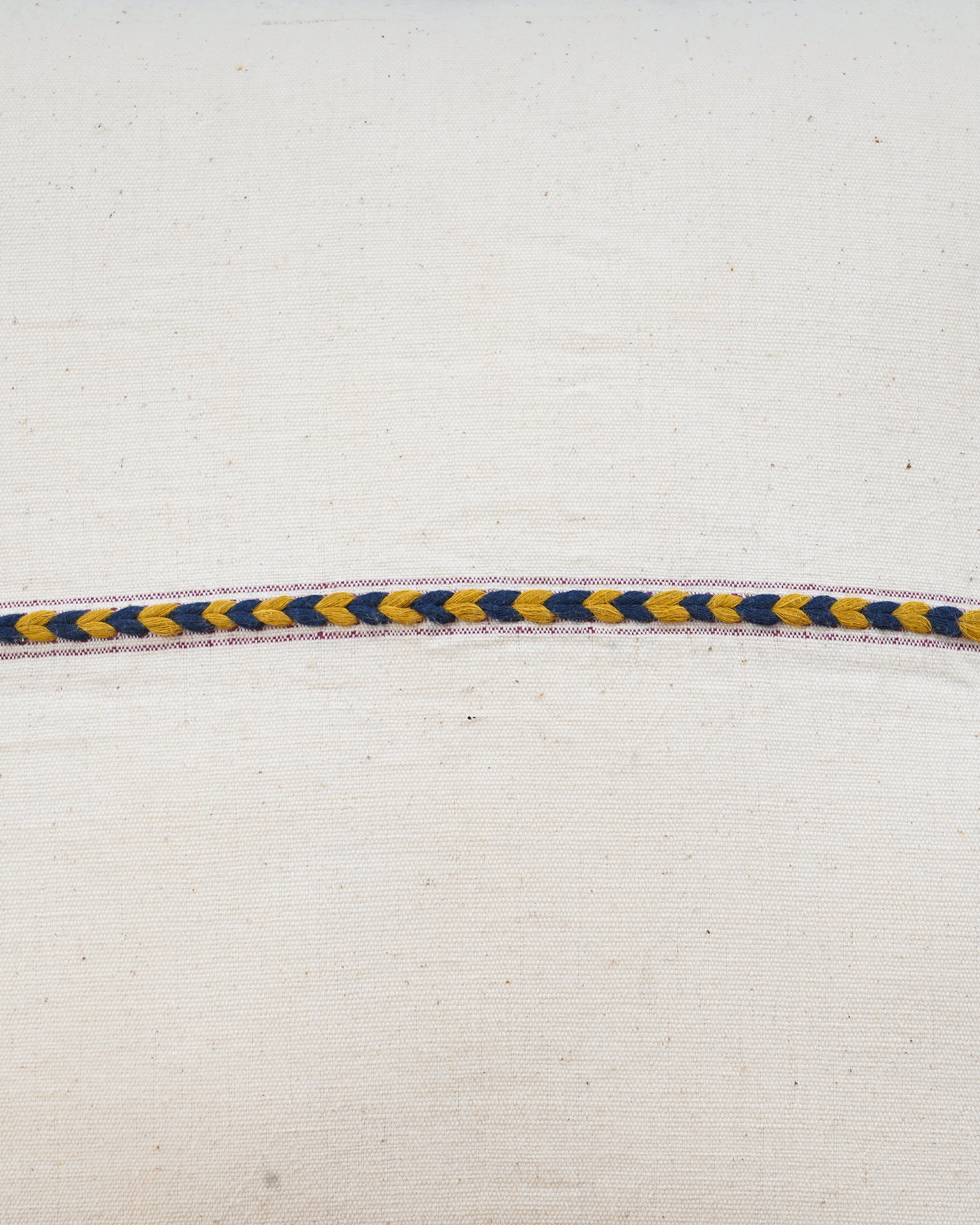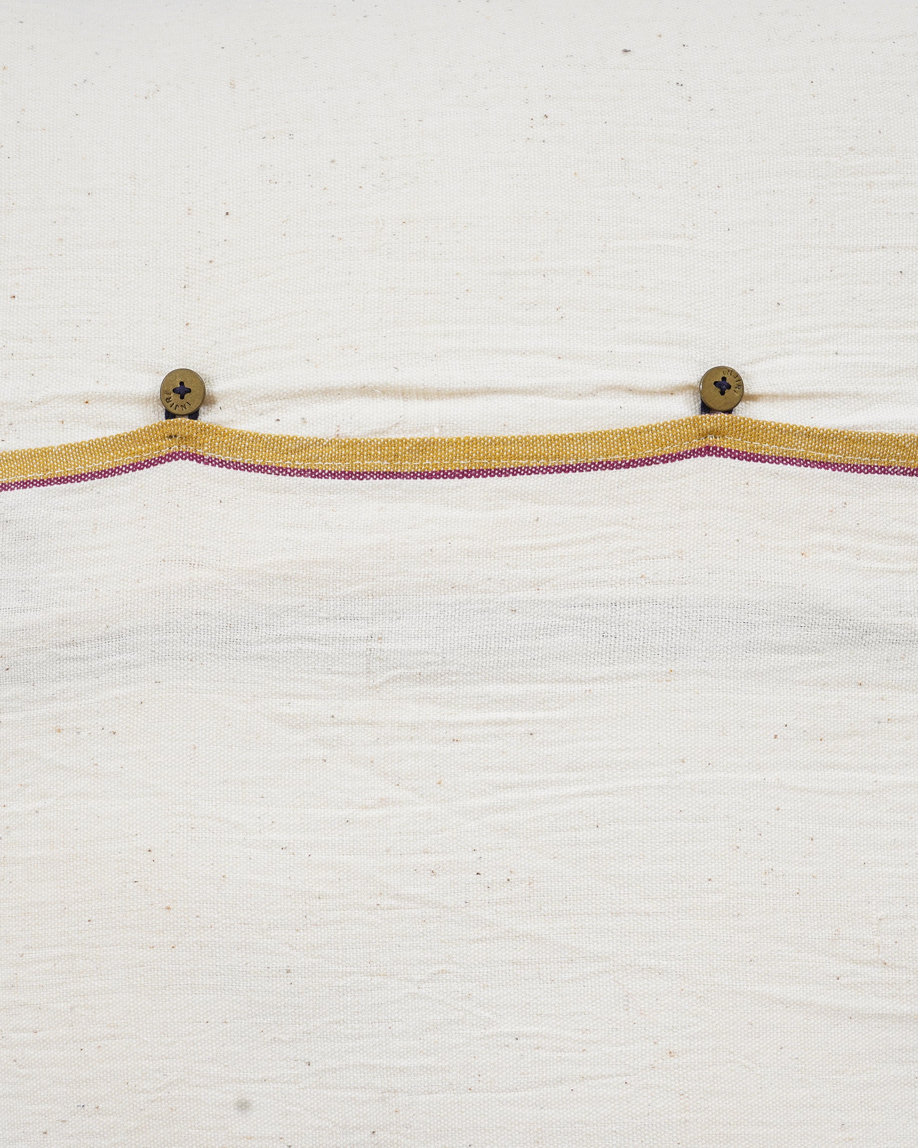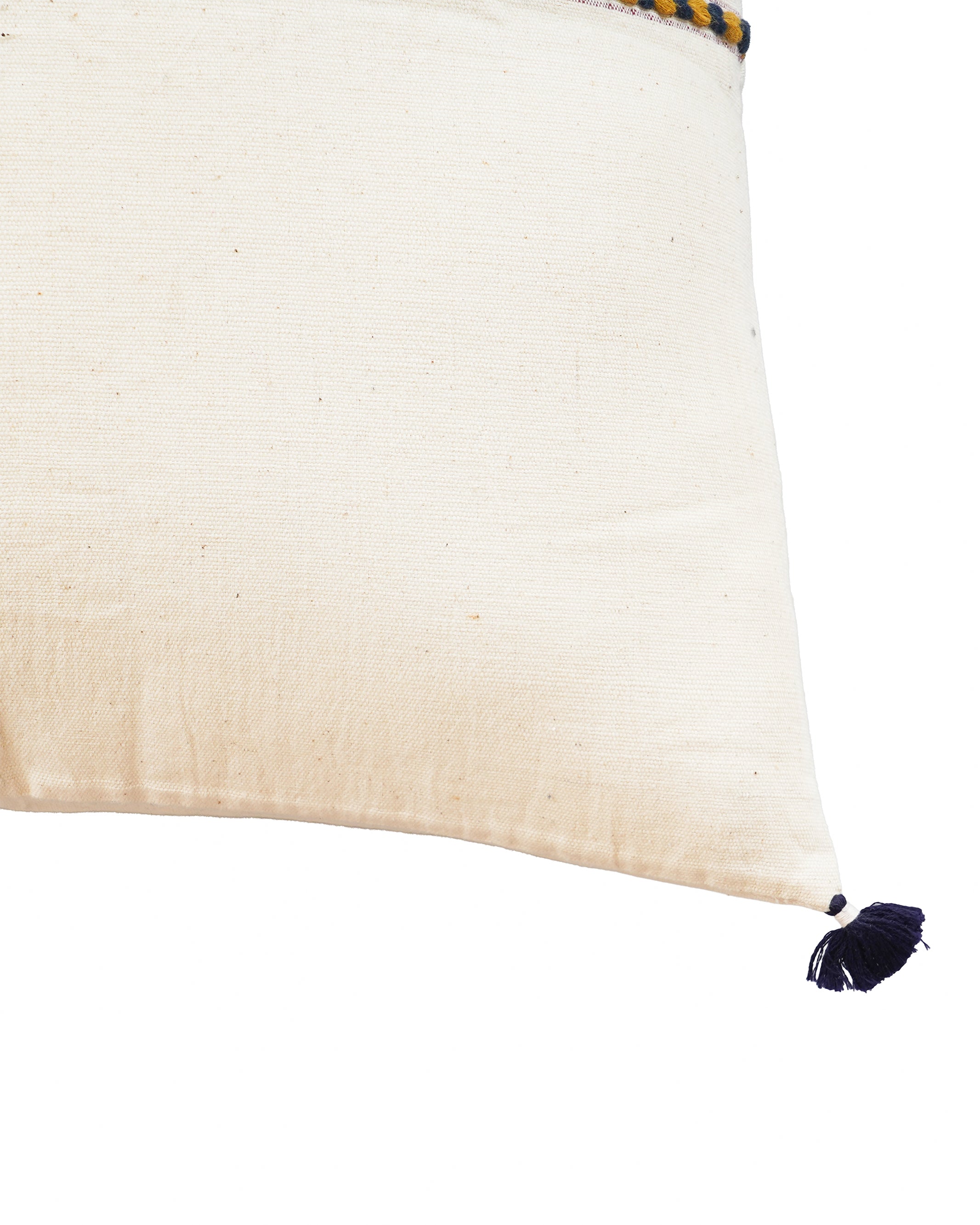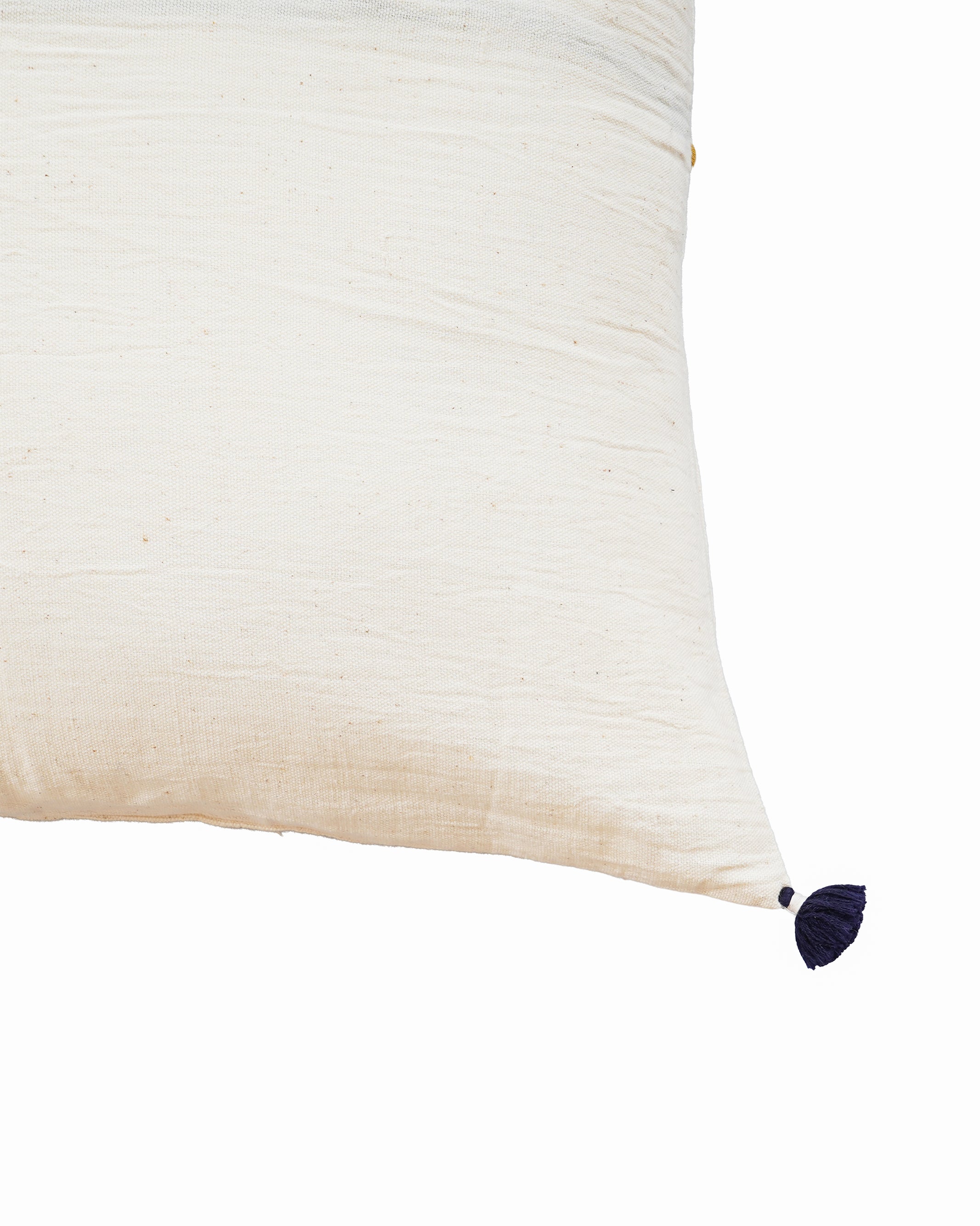 'Bhumi' cushion is the echo of a loom in motion. The subtle woven panel in the centre remind you of the weaver’s hands, creating a piece that’s alive with craft. Its muted beige tones and tassel detailing add warmth and depth, perfect for layering or styling solo.