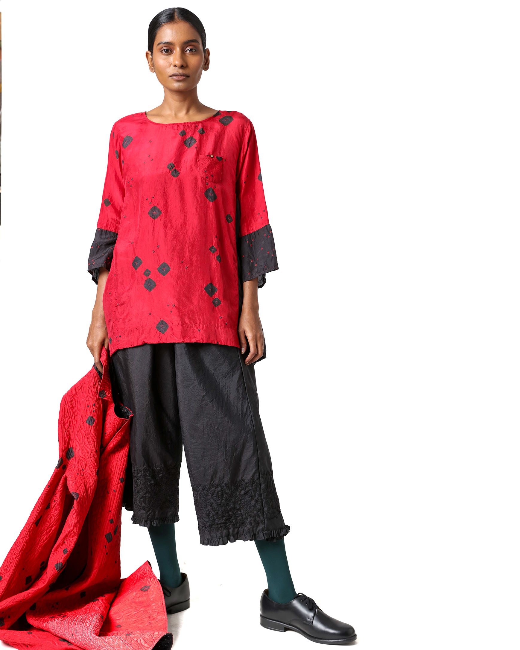 ikkat, extra weft, clamp-dye- are all located in different geographical locations. We monitor quality of these in our capacity but being handmade there do come minor errors which we do not treat as defects, sometimes a Bandhani dot may leave a slight mark or extra weft may cause slight color bleeding . These are not defect for us but features of working with handcrafted products.