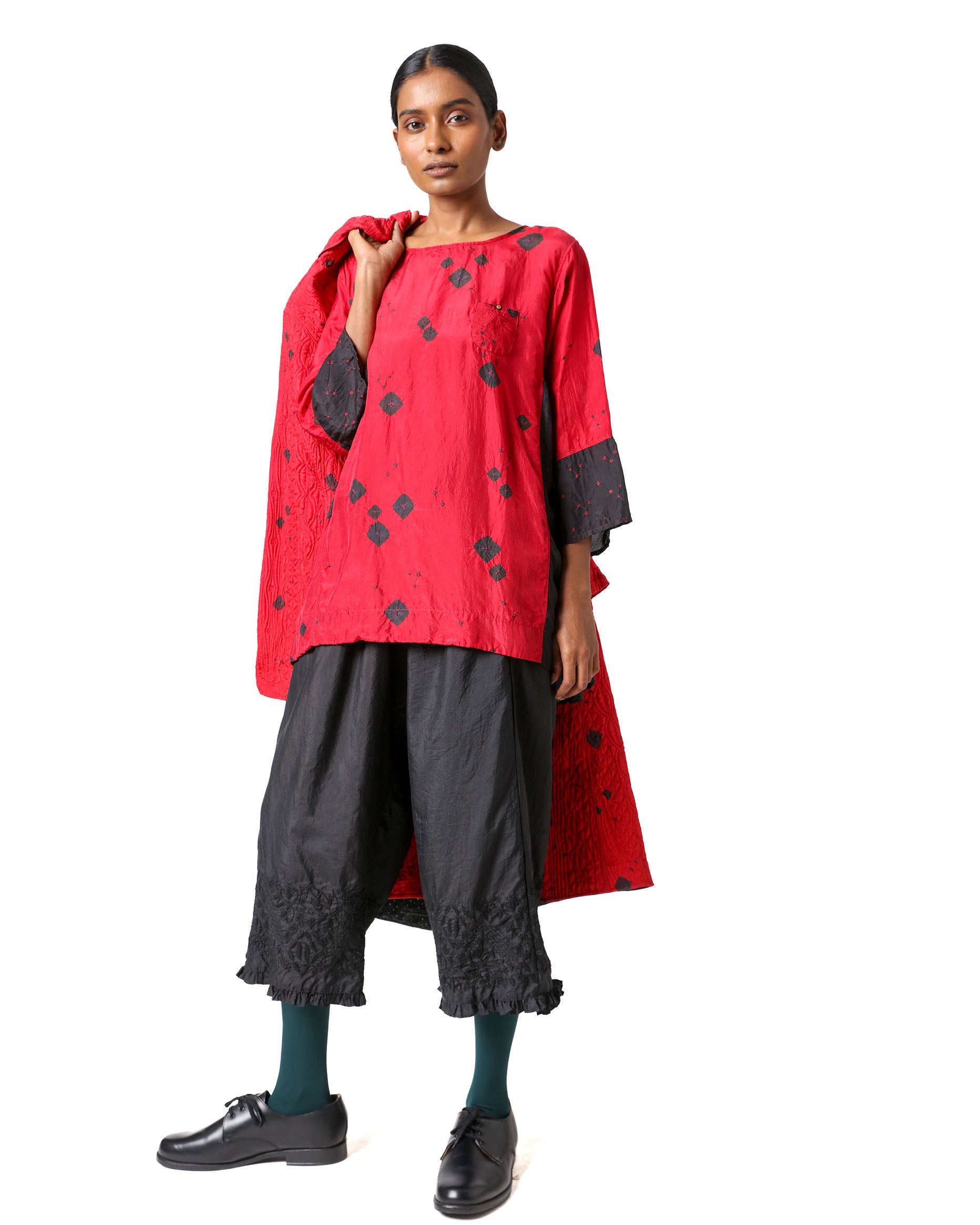 Bokar Culottes in black silk, featuring a wide-leg silhouette for effortless comfort and movement. Detailed with subtle ruffles at the hem and intricate black-on-black Chikankari embroidery.