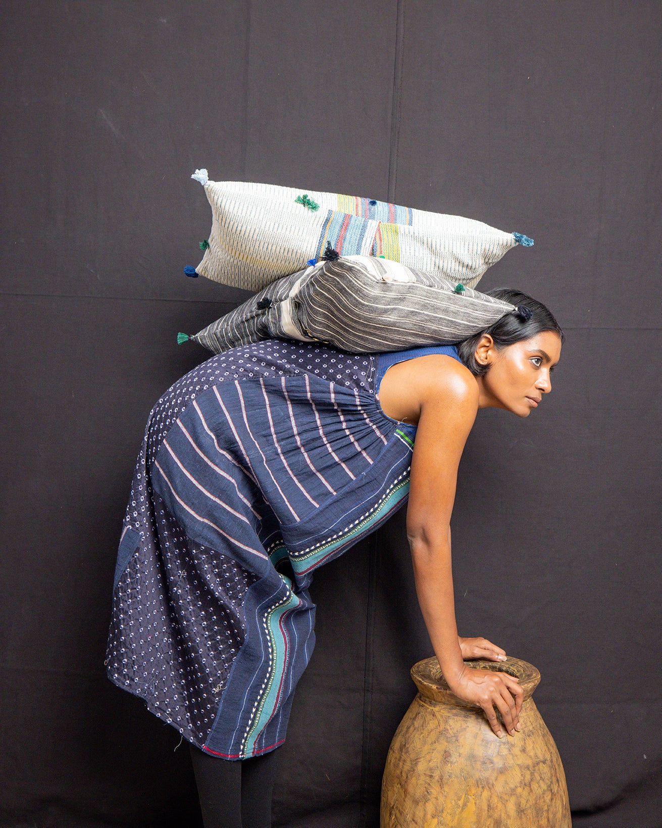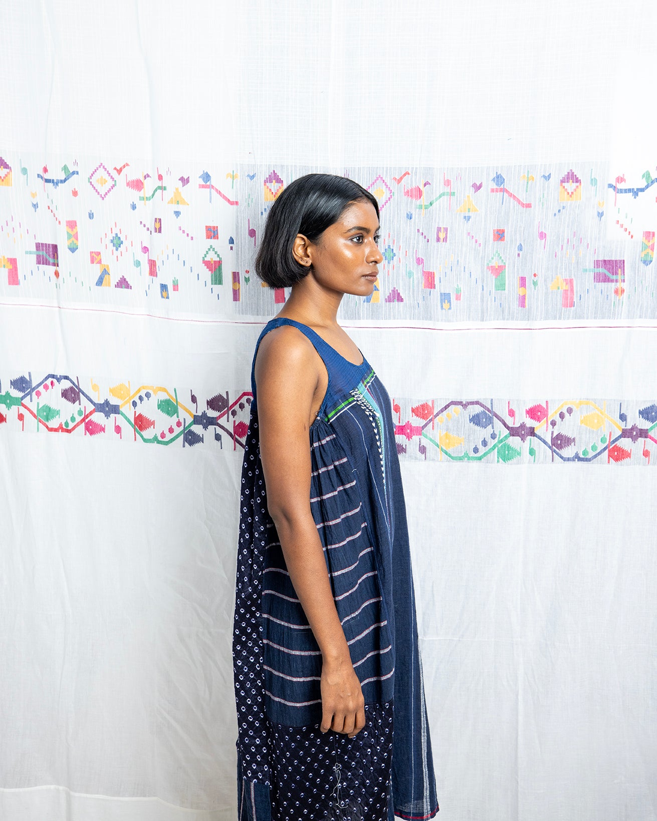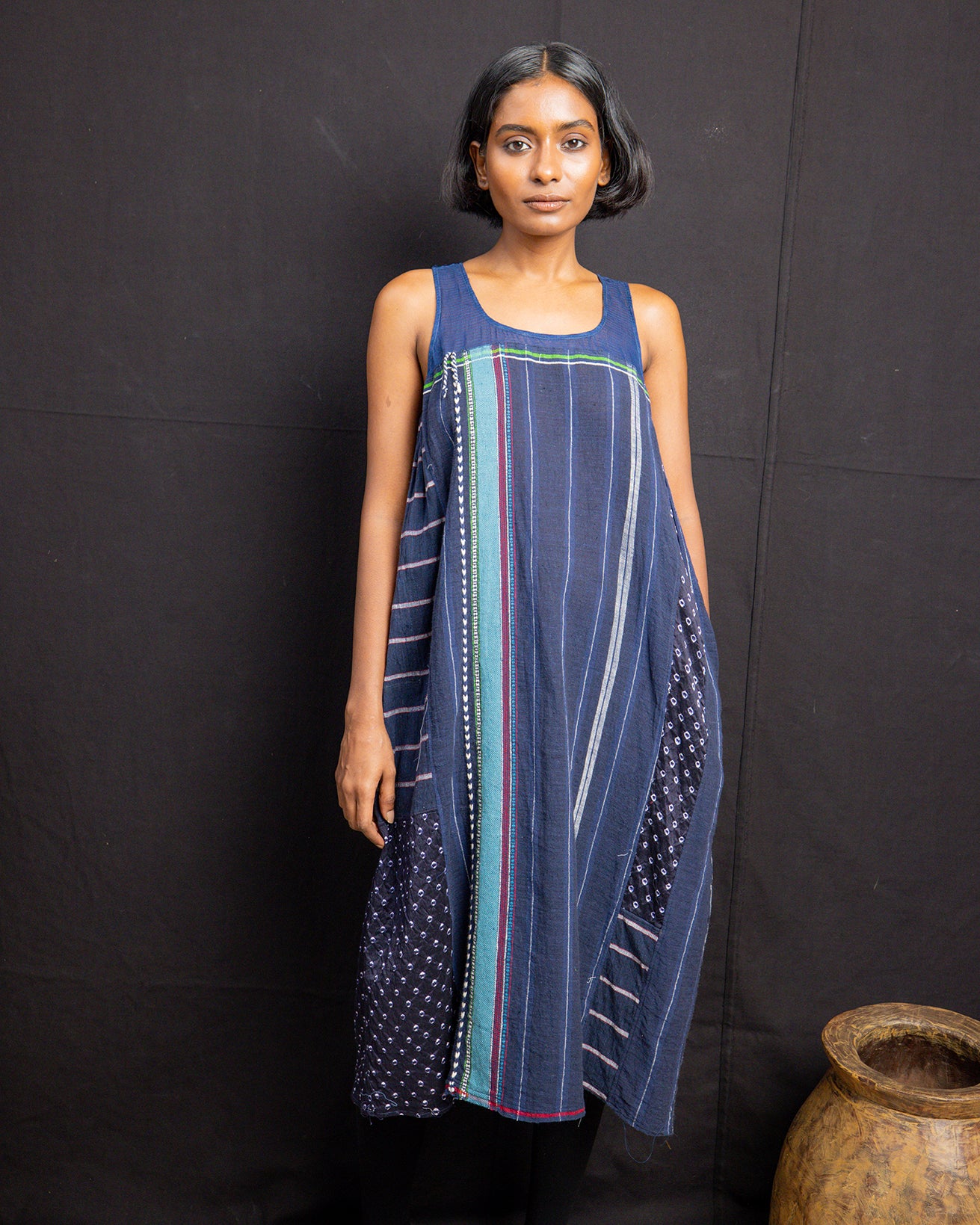 The Camille Indigo Dress, crafted in handwoven cotton from Gujarat, features a sleeveless design and a knee-length silhouette. Lightweight and comfortable, this dress is true to size and perfect for effortless everyday wear during summer.