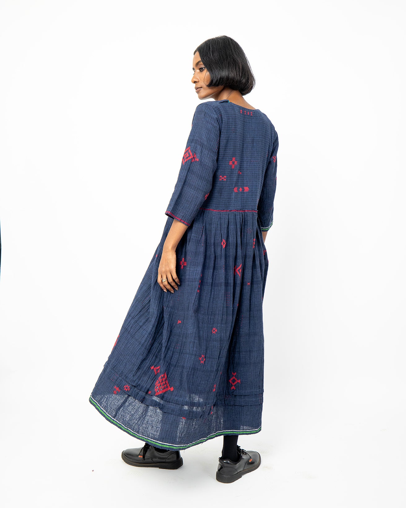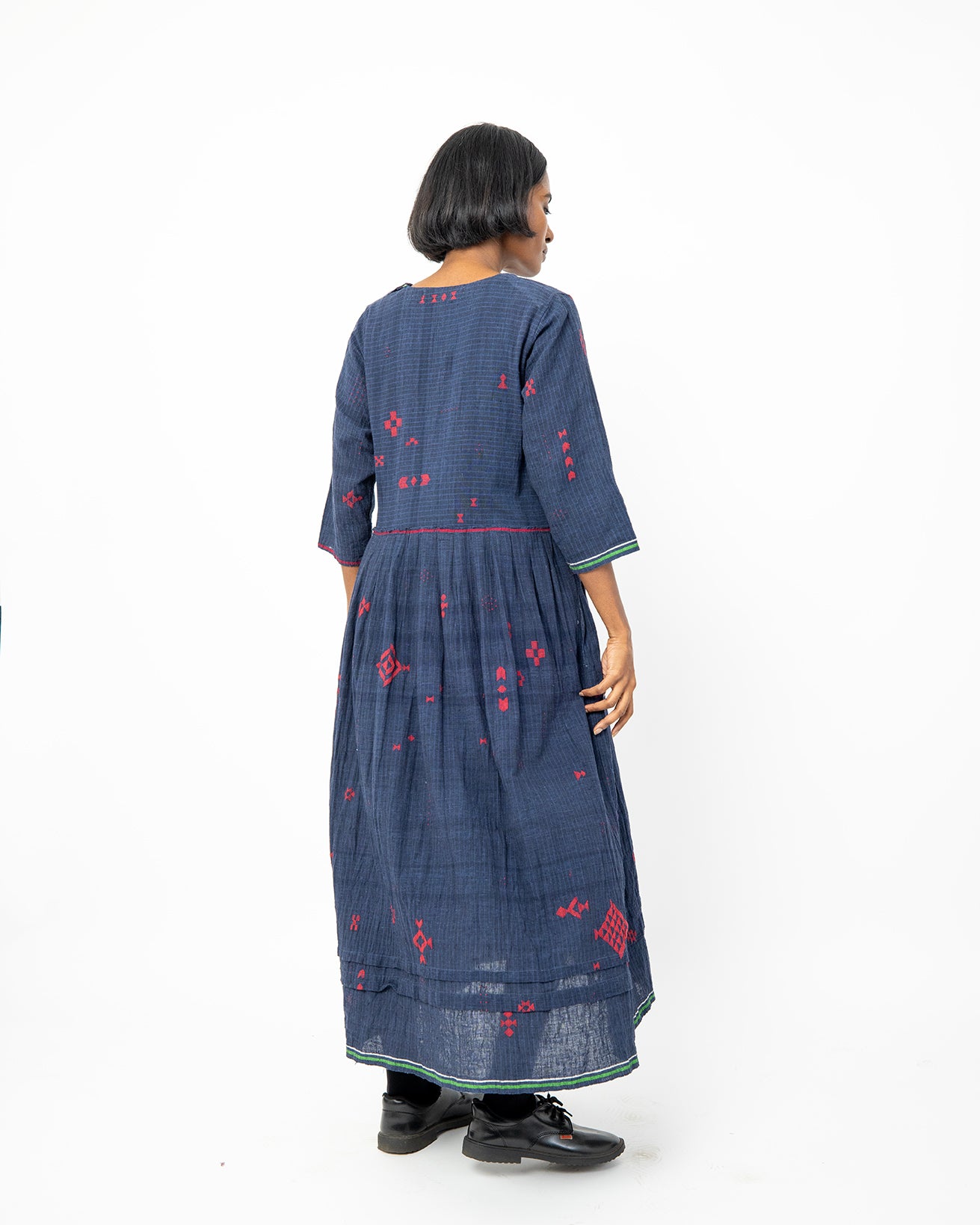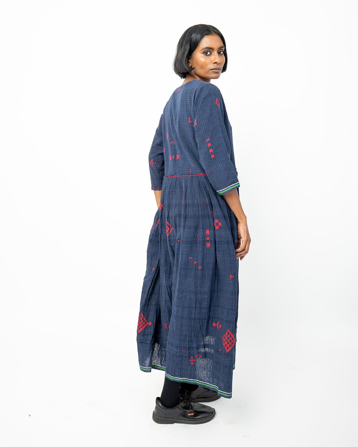 The Camille Indigo Dress, crafted in handwoven cotton from Gujarat, features subtle red woven motifs and a clean V-neckline. Designed for a relaxed fit, this lightweight dress offers effortless everyday comfort.