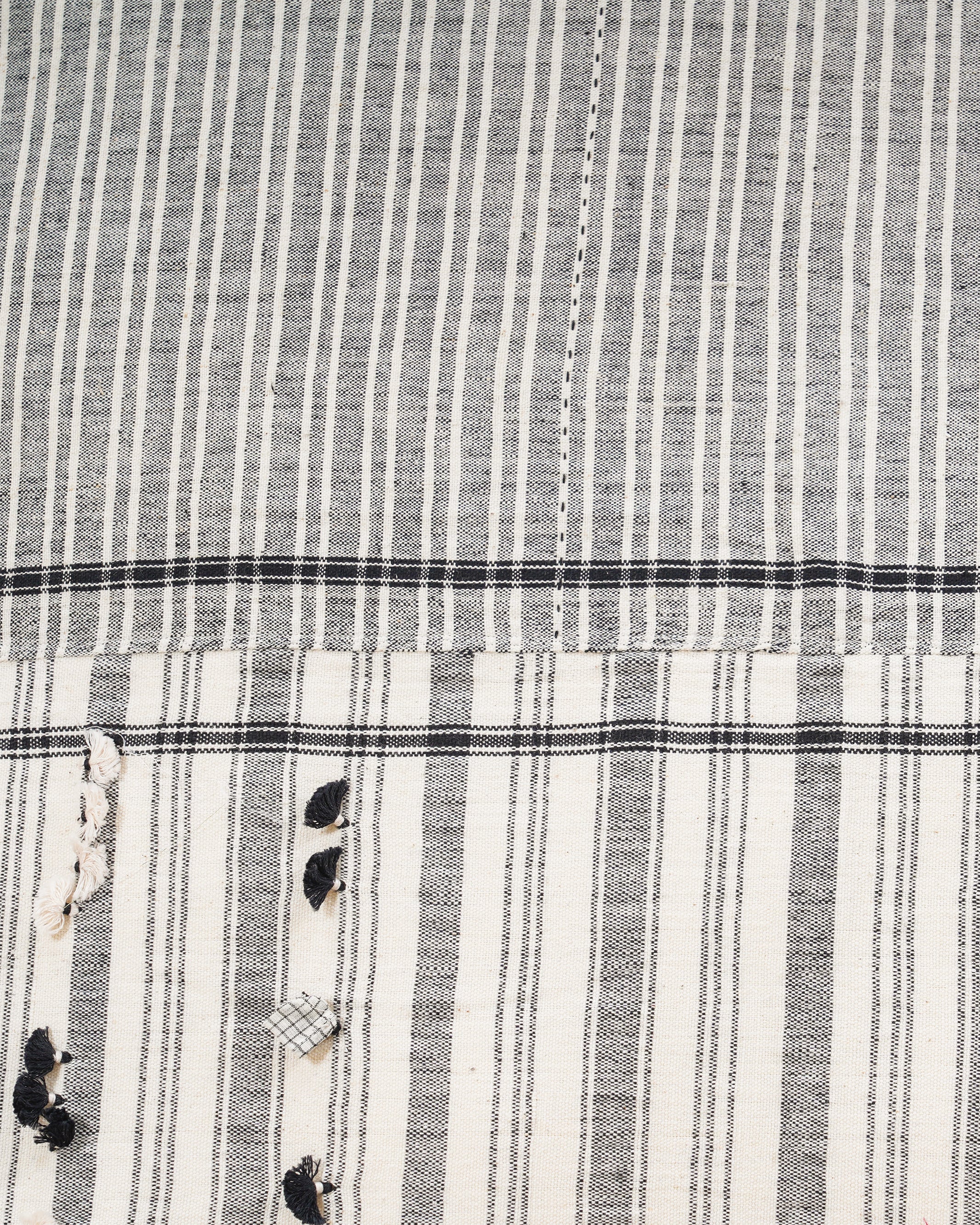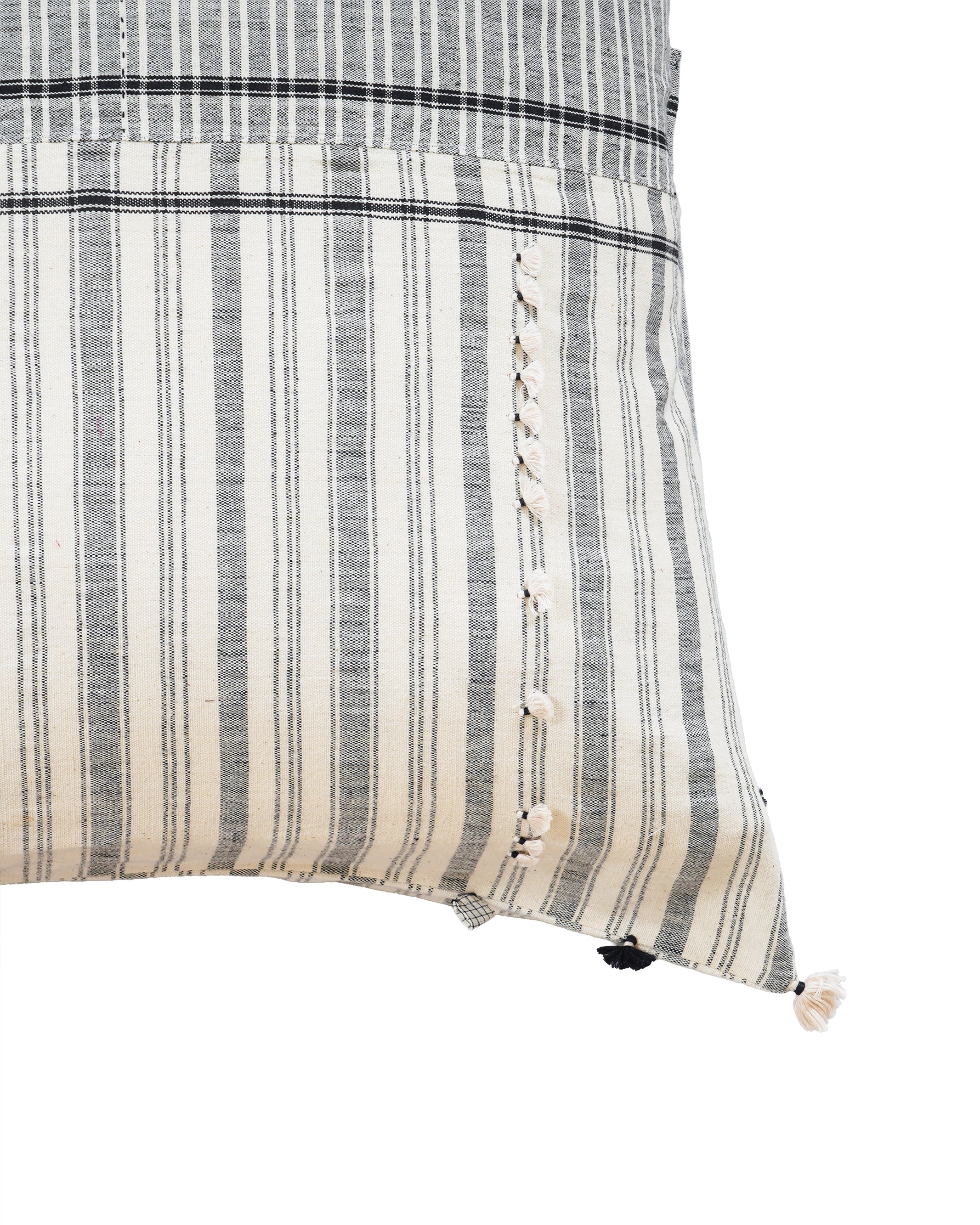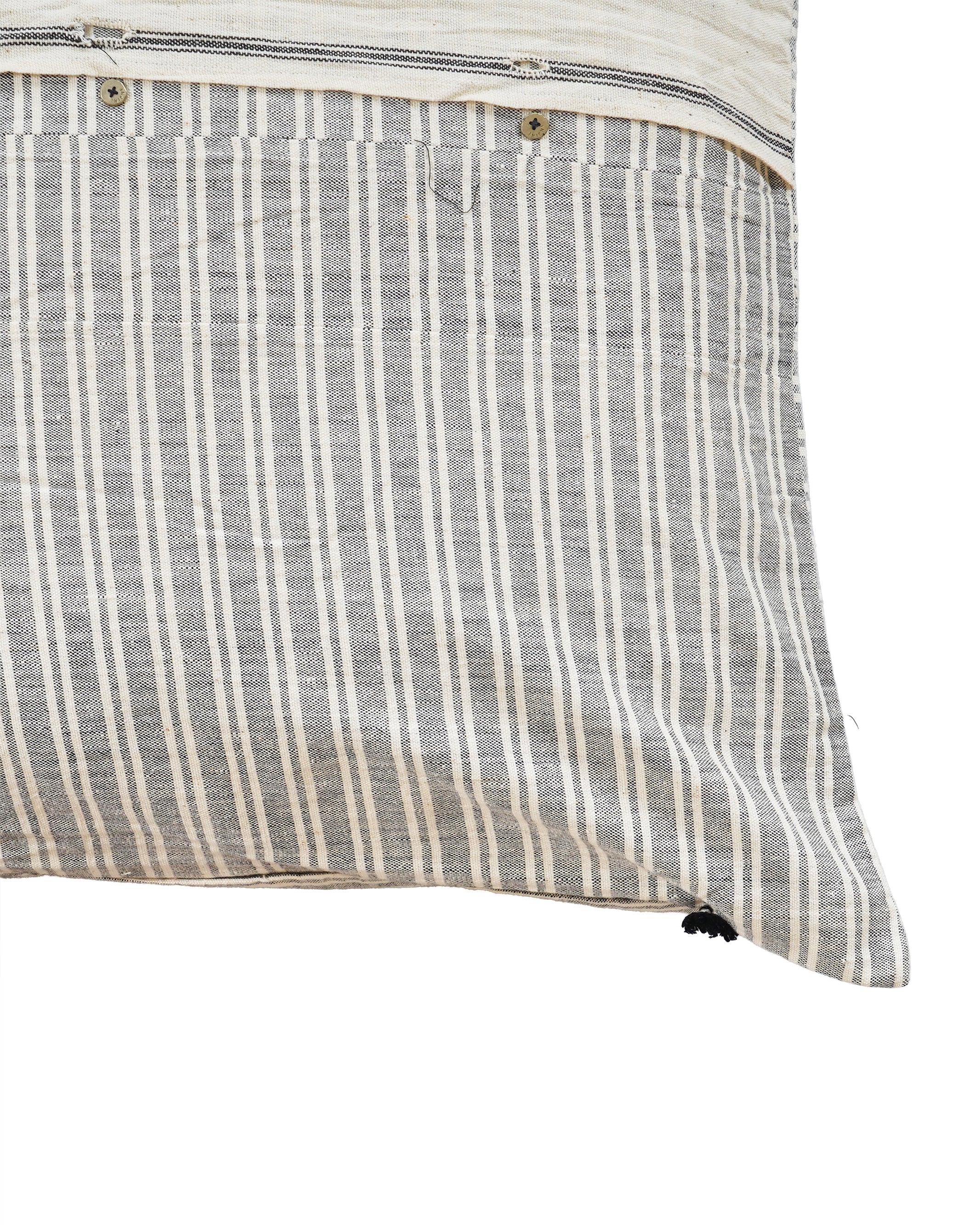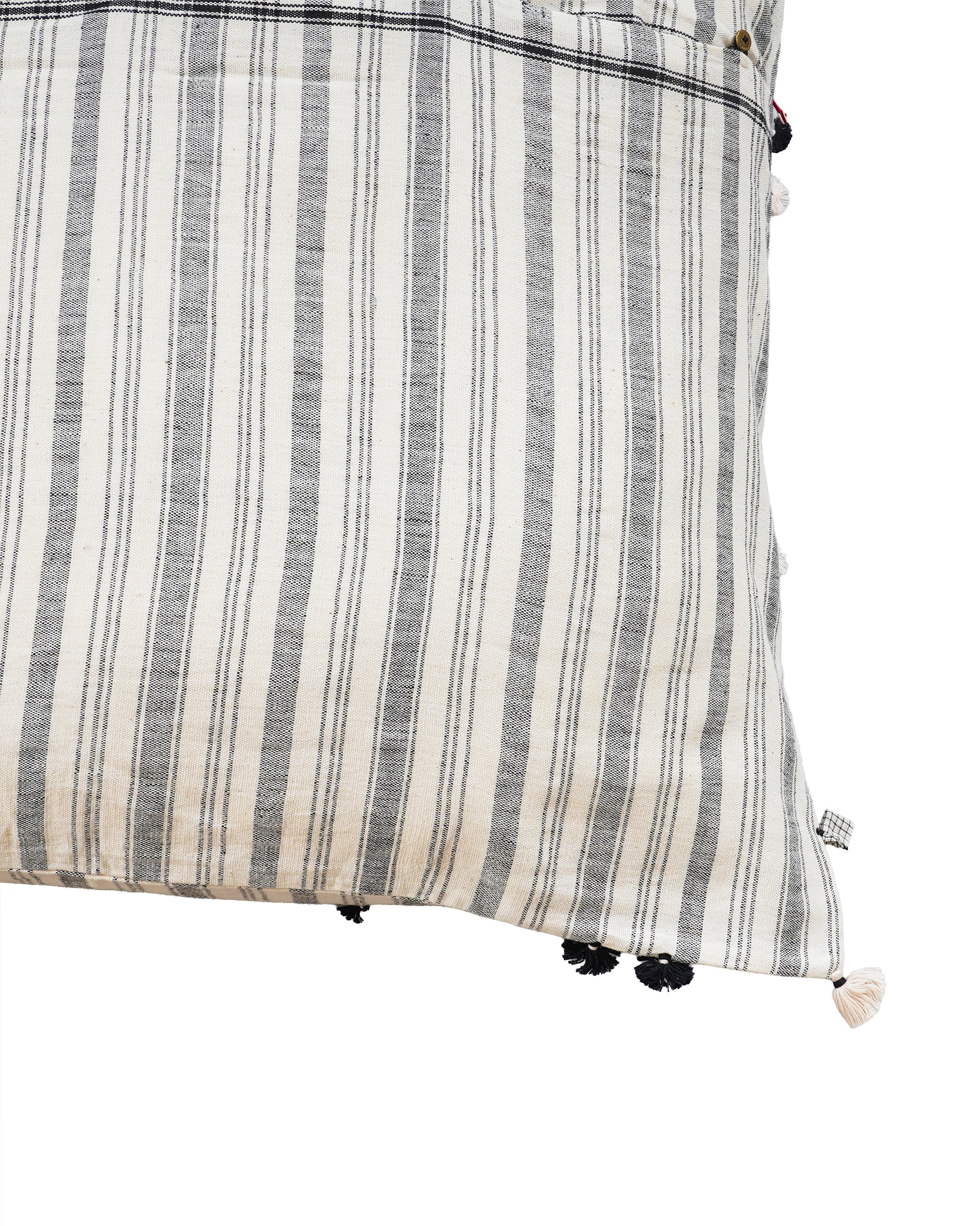 Comfortable & cosy — this 'Chakor' cushion is handwoven with pure cotton fabric, showcasing the bhujodi craft that gives it a rich, adorned with uniform and interesting embroidery pattern with tassels. Its understated elegance complements contemporary and traditional spaces alike. It features gentle stripped detailing along with some tassel detailing in checkered fabric that adds a fun touch to it! Toss it on your favorite armchair or layer it with other cushions for a cozy, inviting setup.