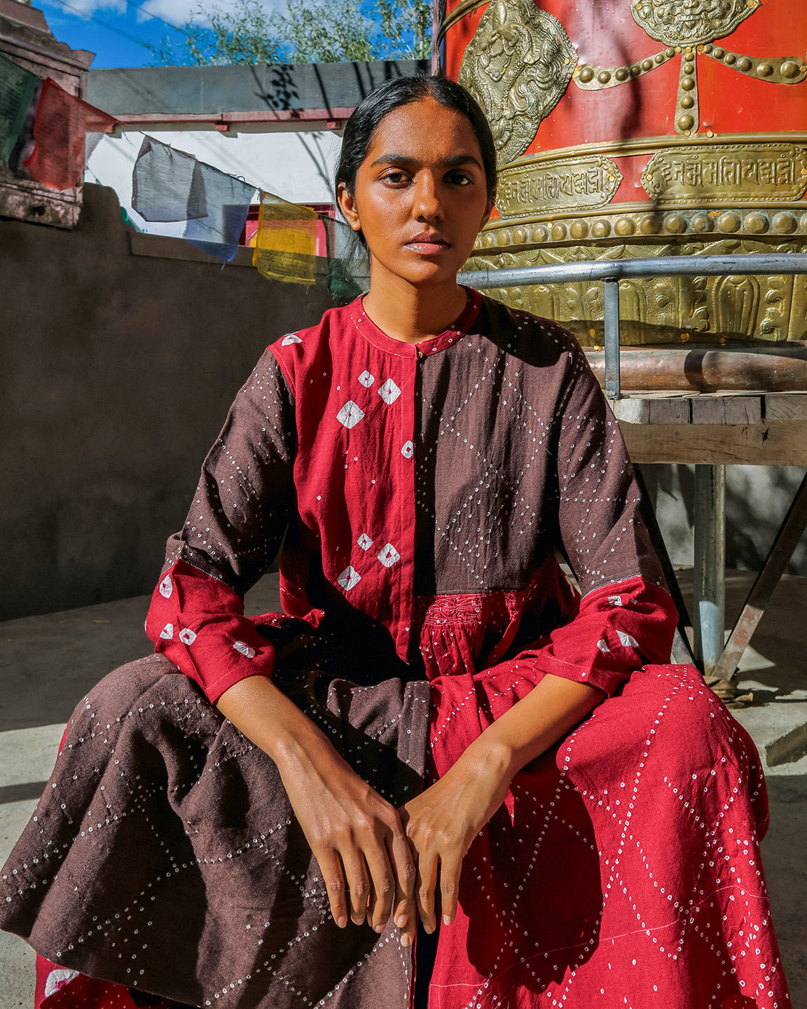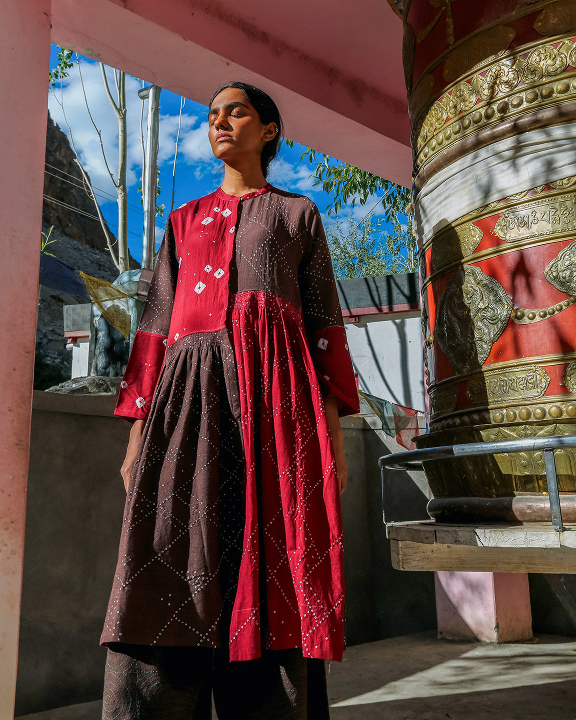 Changtang Dress in wool, featuring alternating red and brown yoke panels adorned with tie-dyed bandhani dots. It has a closed neckline, button detailing, and a gathered asymmetrical waistline for a flowing silhouette. True-to-size and comfortable.