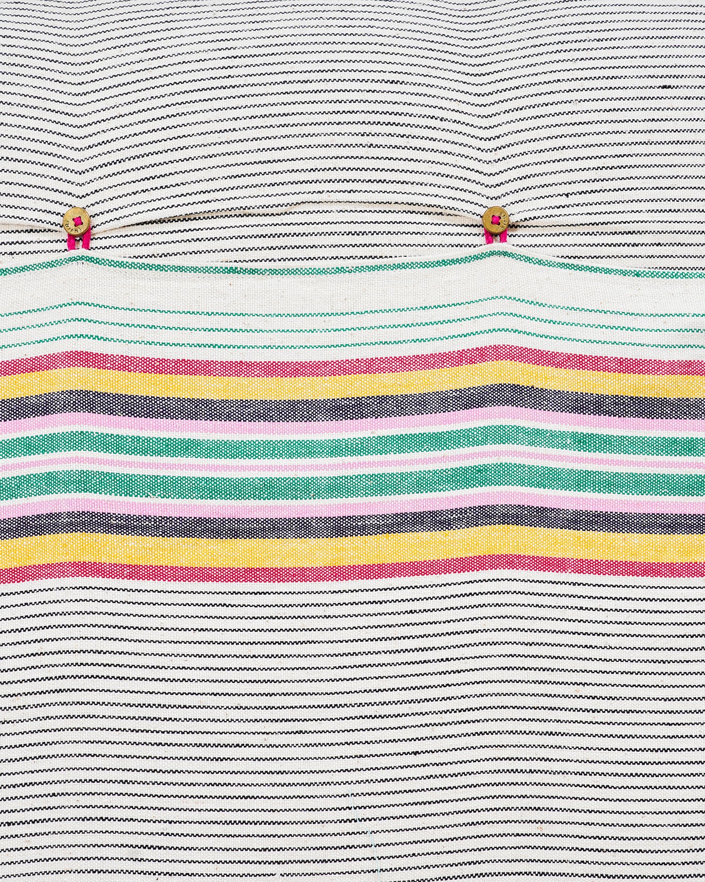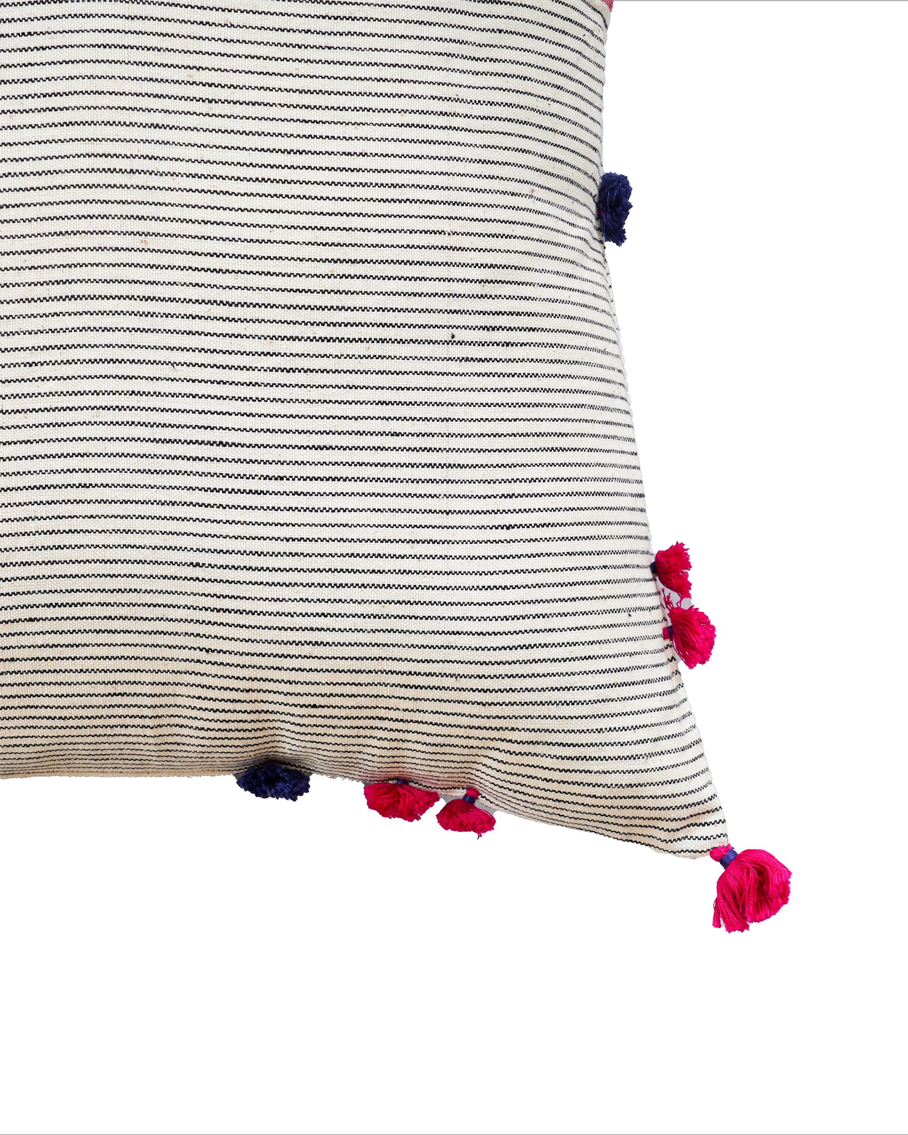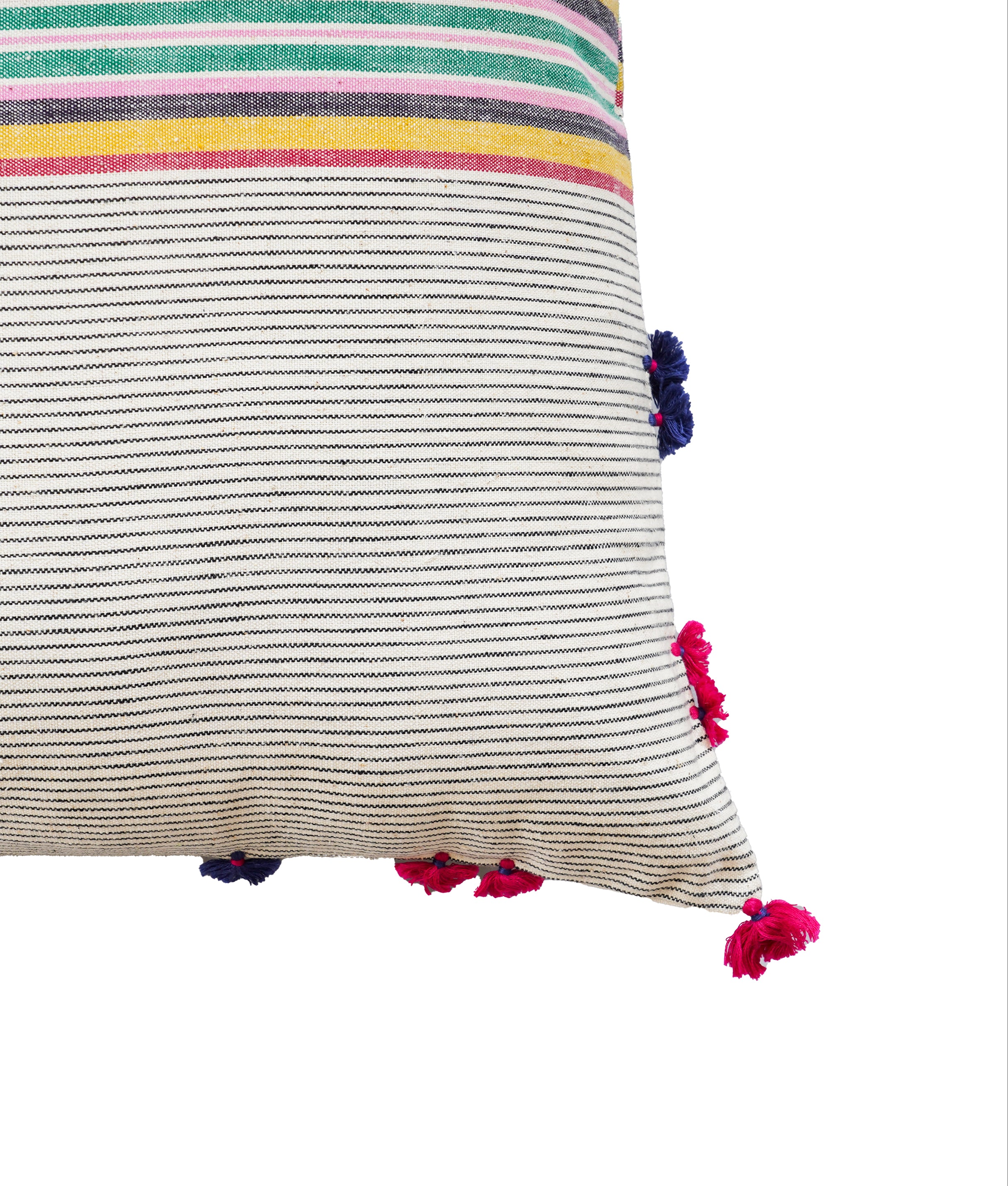 'Charkha' cushion finds the perfect balance between old-world charm and contemporary aesthetics. Handwoven by artisans of Kutch using bhujodi weaving technique, its pure cotton fabric construction offers durability and a soothing texture. The soft strippes detailing along with tassles on the edges add a playful touch. Whether placed on a minimalist sofa or a patterned bedspread, it adds a touch of harmony and grace to your interiors.