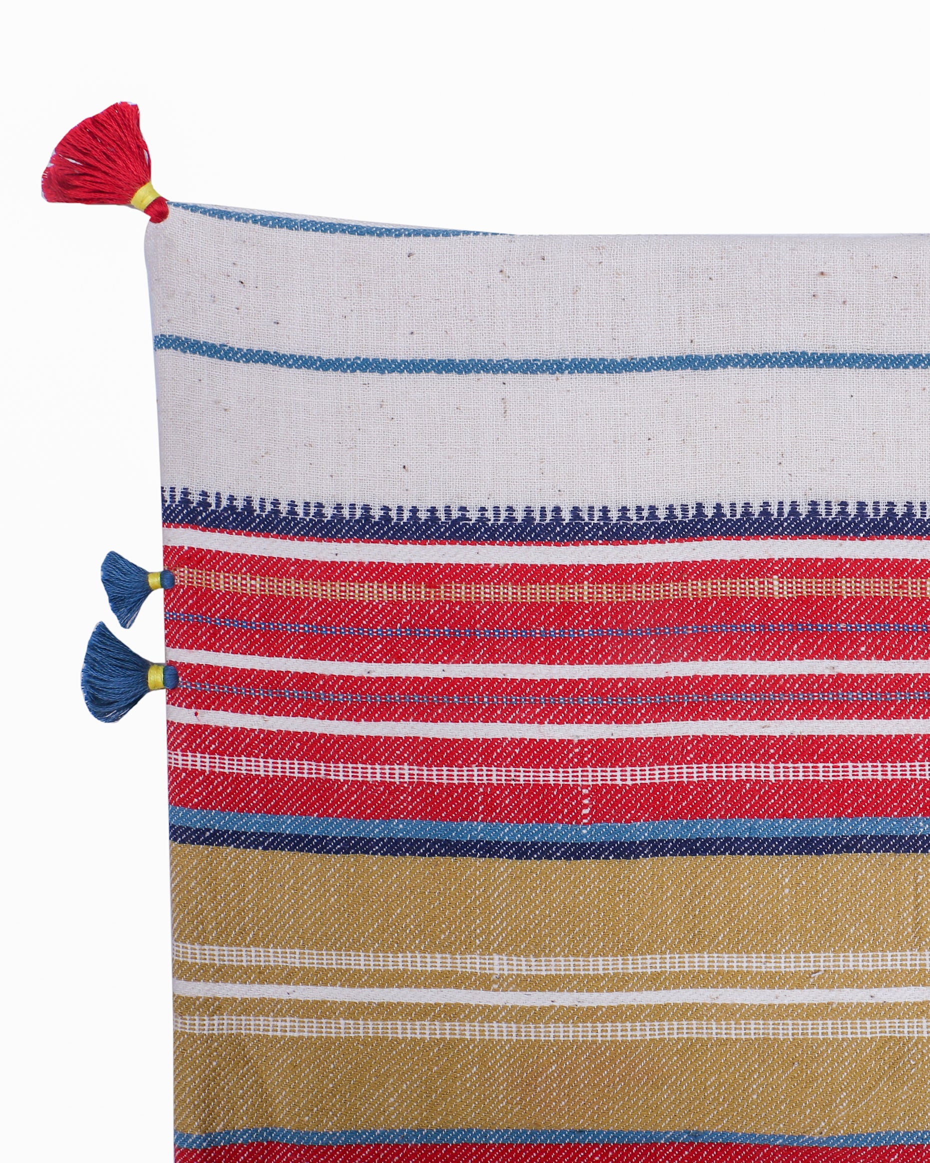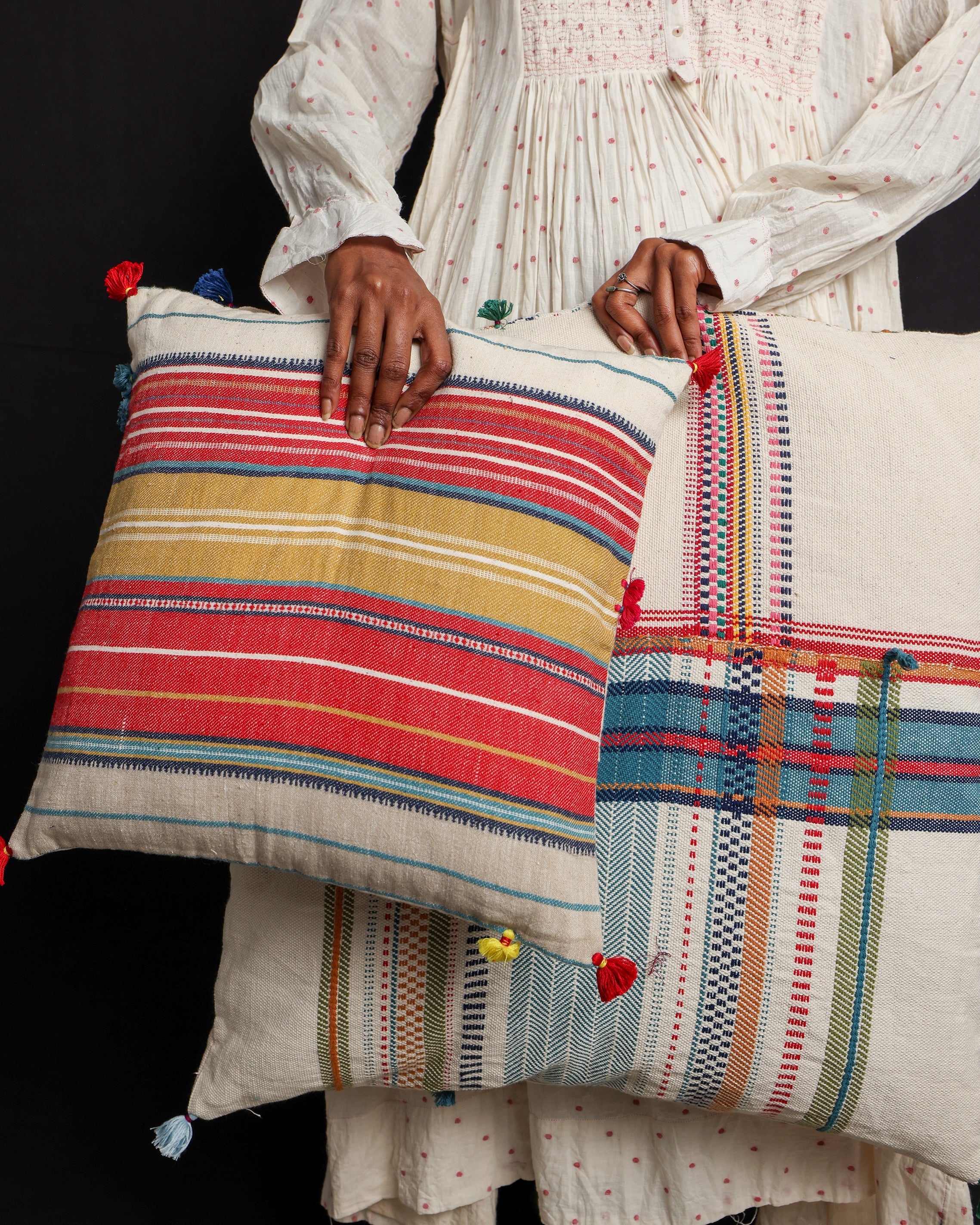 Born on a loom, this 'Chunar' cushion holds the faint whispers of time and toil. The kala cotton fabric feels alive with texture, every stripe placed with intention, while tassel detailing adds an unsual twist to the piece. A refined piece to lend authenticity to your home’s aesthetic.