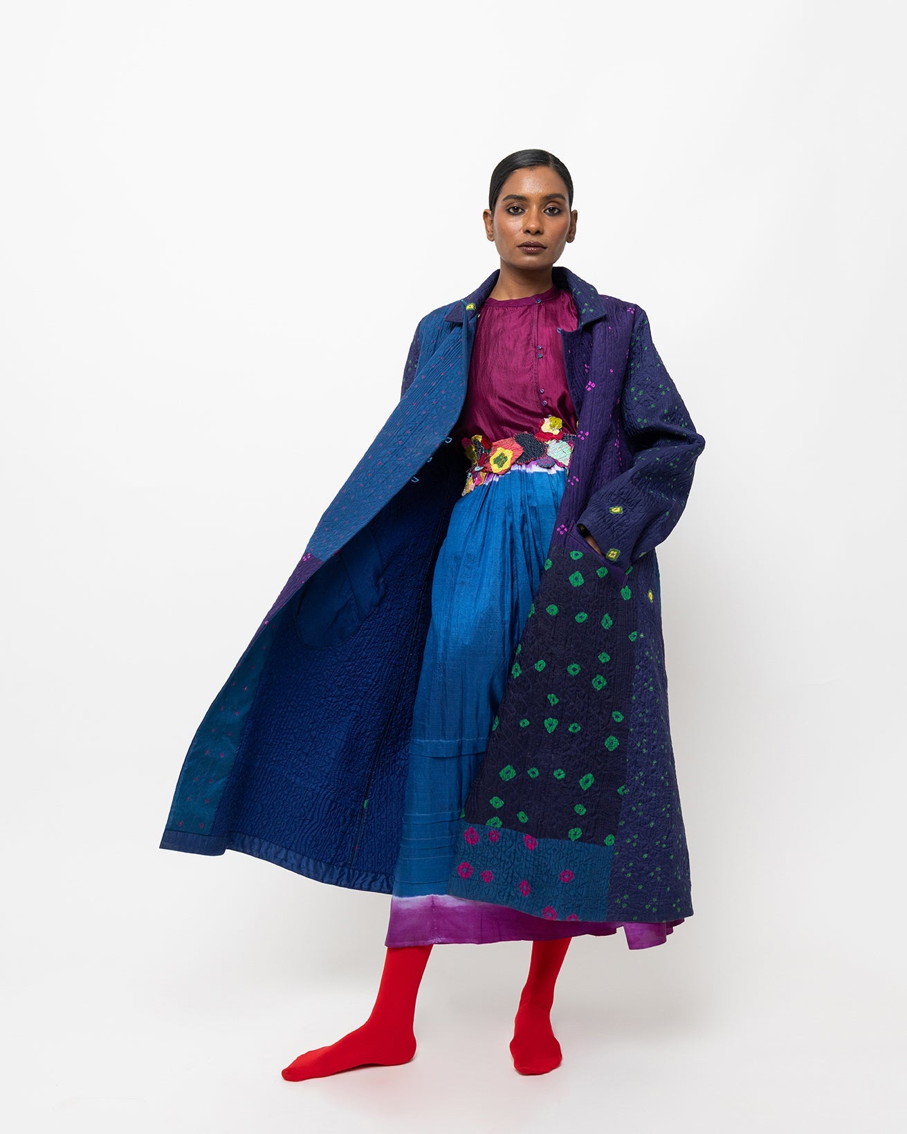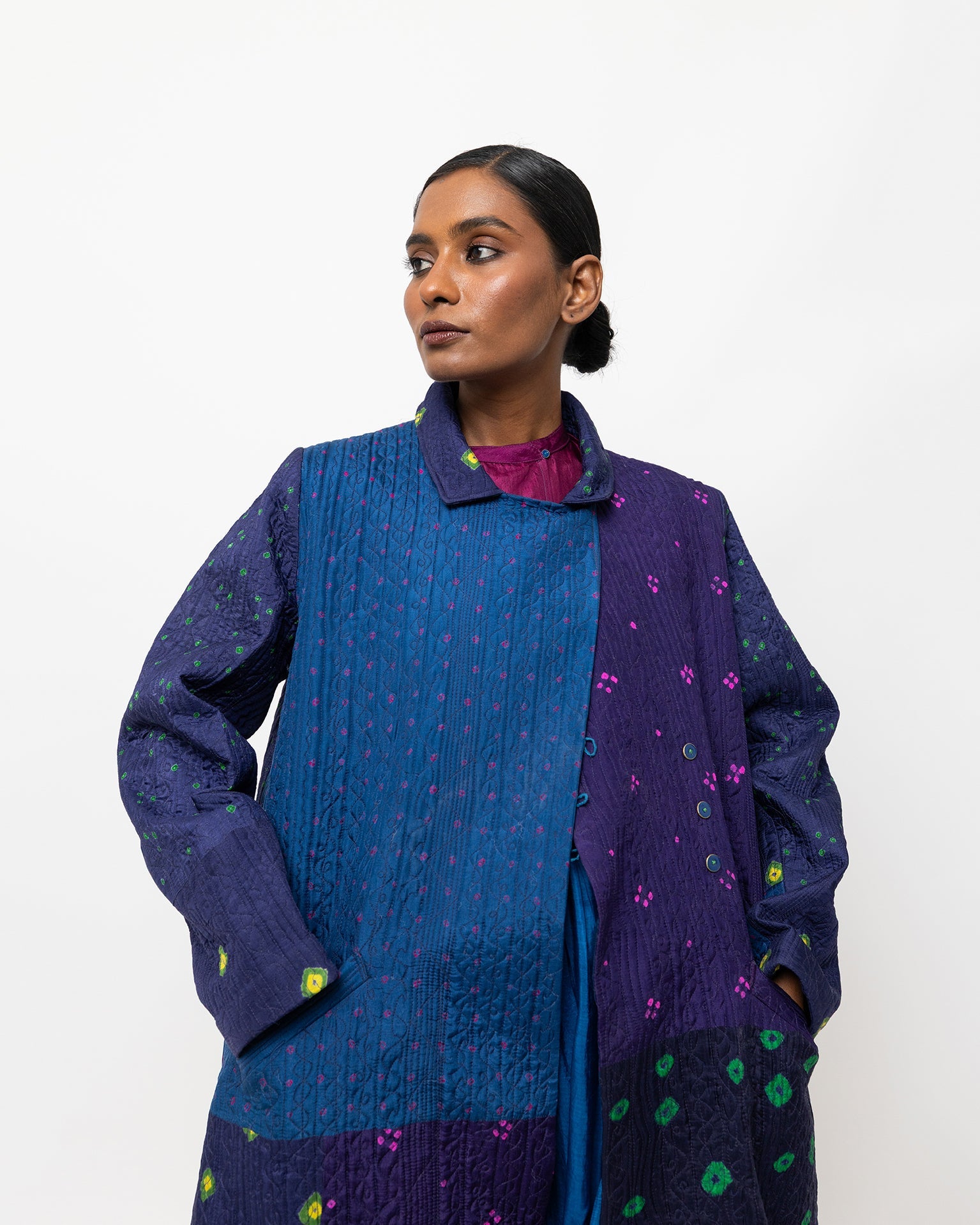 The Delta jacket is crafted in tie-dyed silk and features scattered resist-dyed motifs across deep blue and violet panels. Designed with a soft round neckline, front opening, and a relaxed, straight silhouette, it is lightweight and comfortable for easy layering.