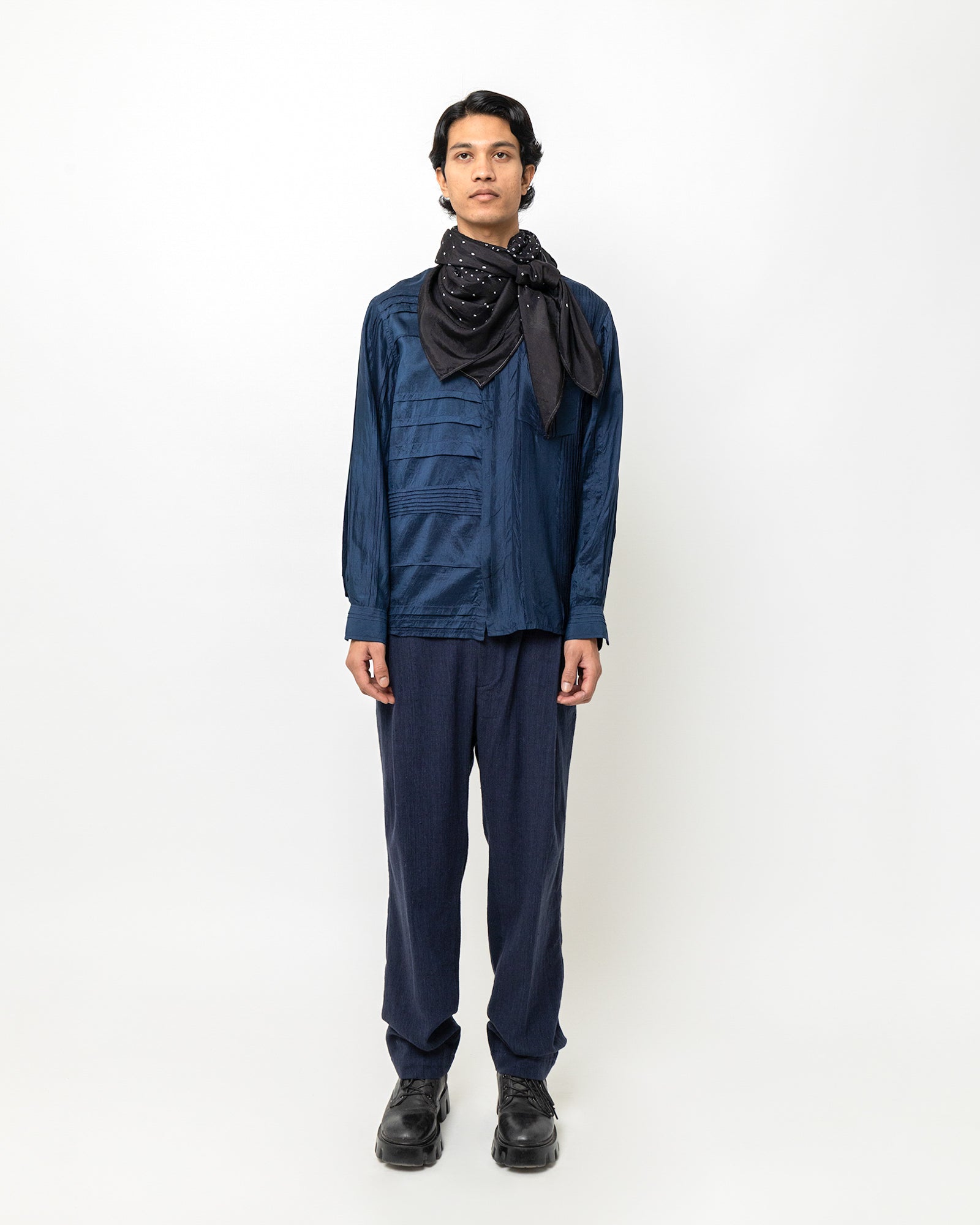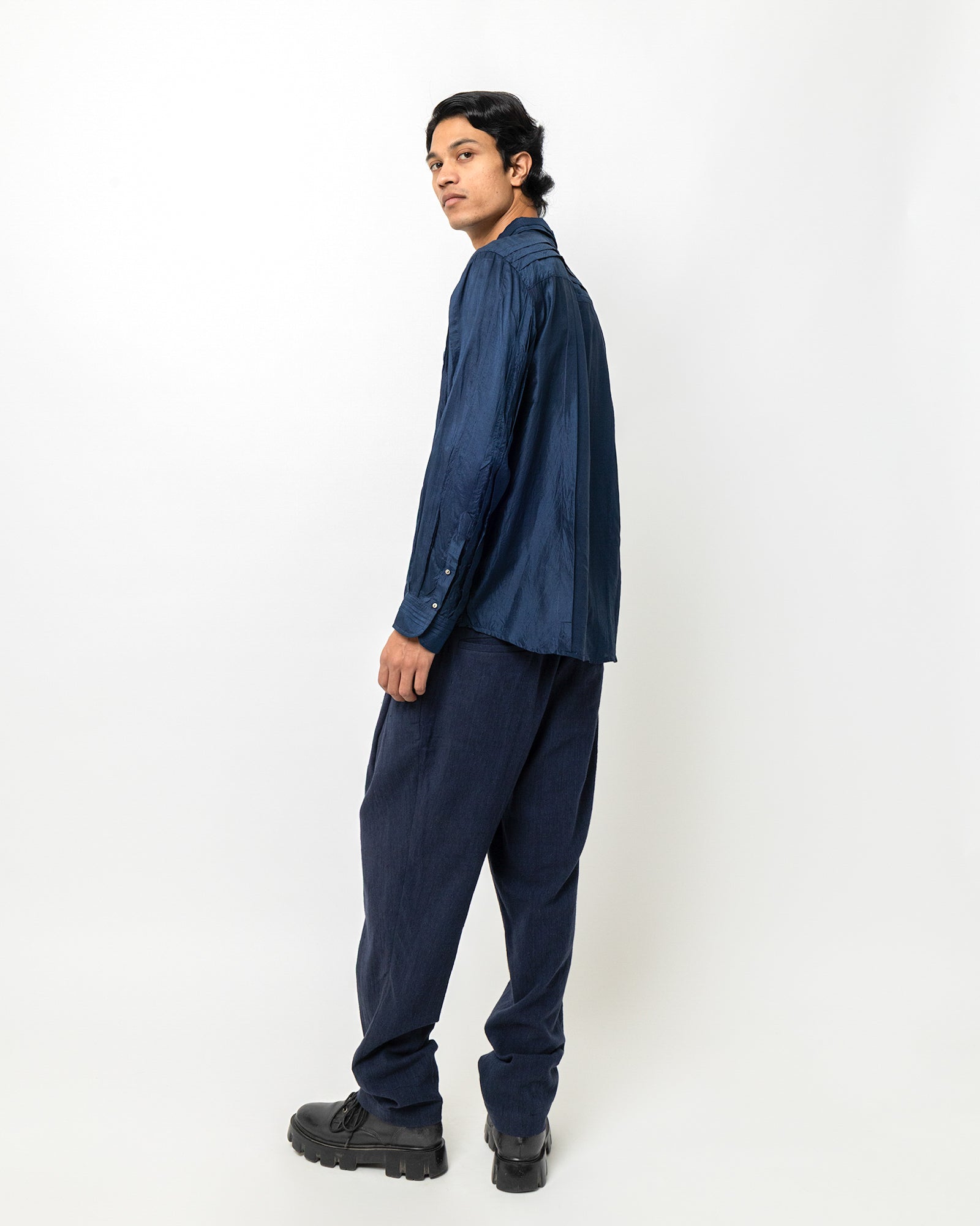 The Dev Shirt is crafted in soft dyed silk and features fine tuck detailing along the right front panel. Designed for a relaxed, easy fit, it includes full-length sleeves, a classic shirt collar, and a full button-down front with a single chest pocket. Tonal tucks add structured texture to the deep navy base, balancing the fluid drape of silk with subtle surface detail. deep navy base, balancing fluid drape with subtle surface detail.