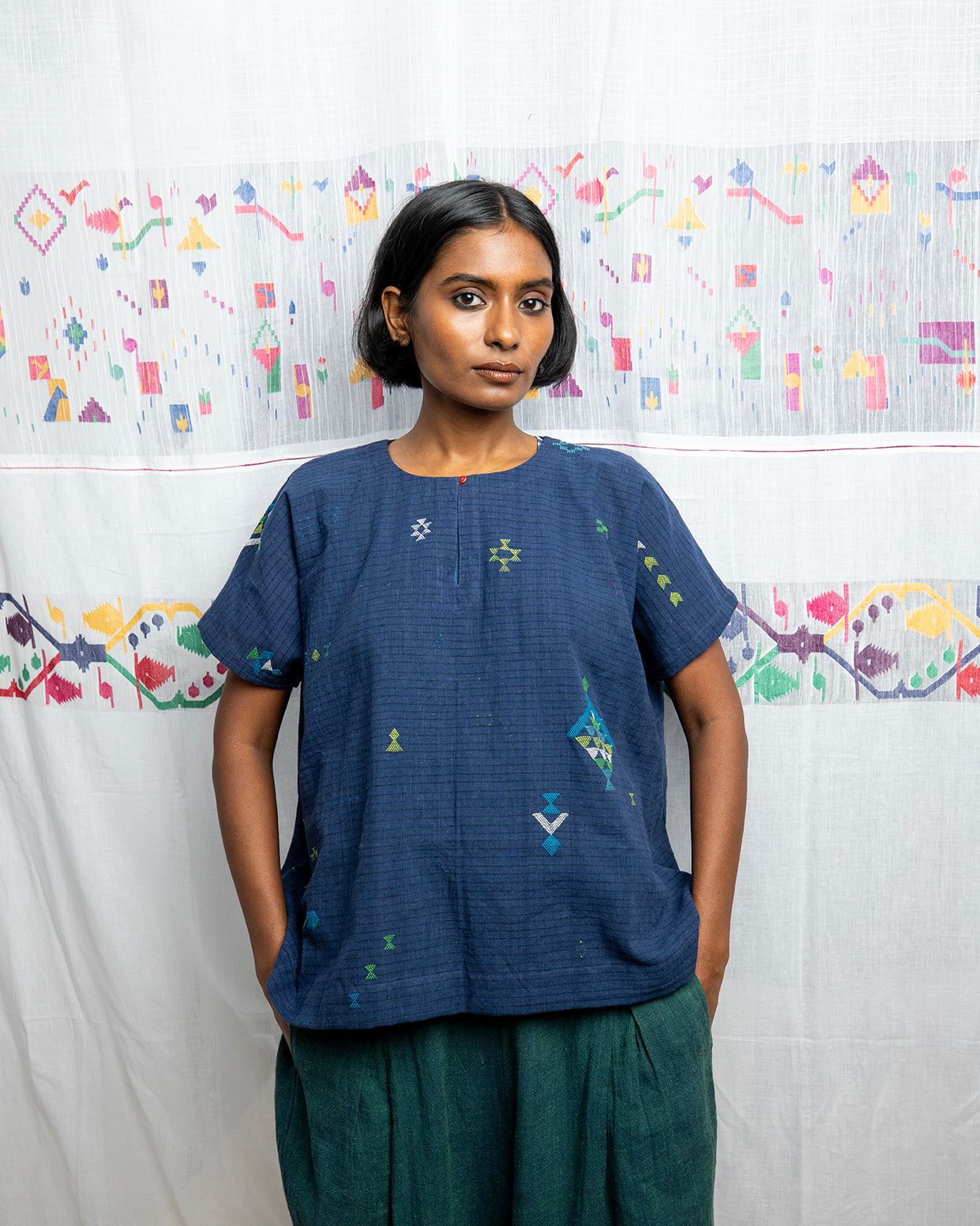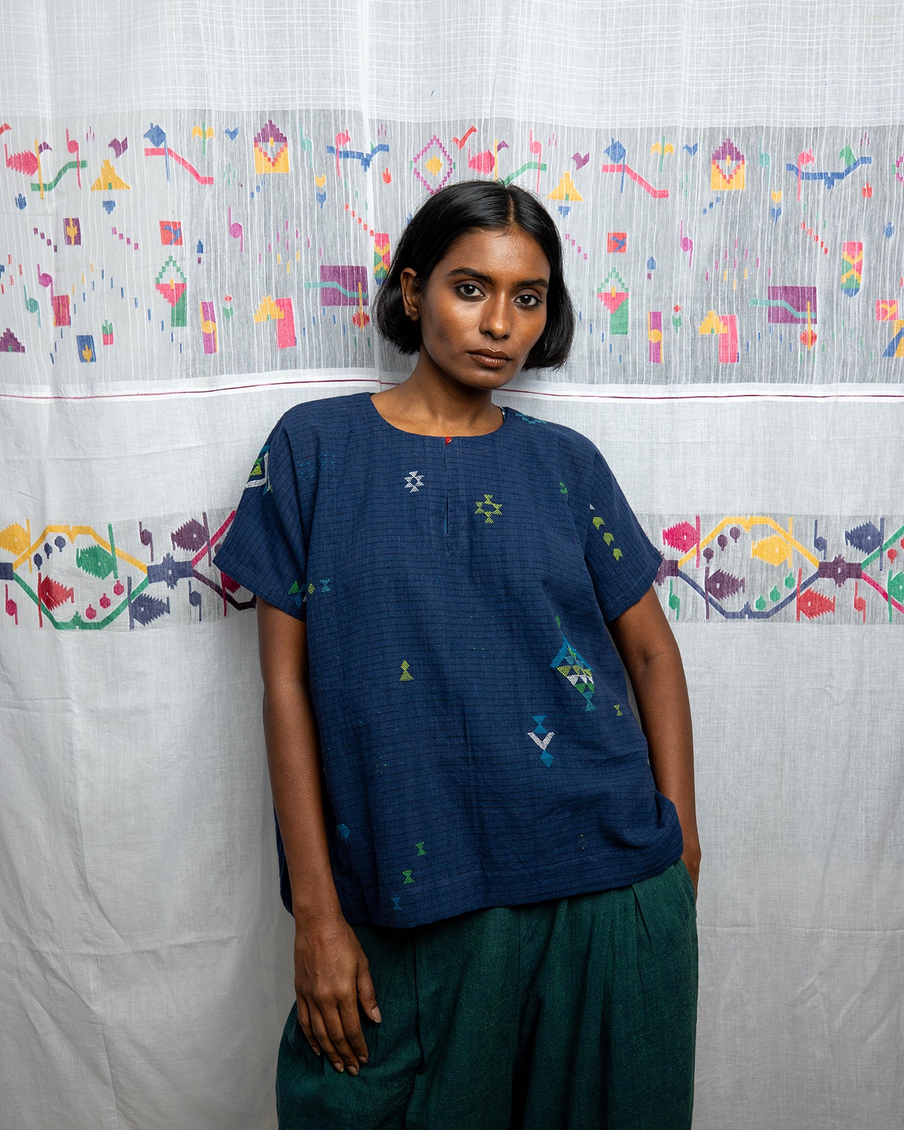The Diya Bhujodi Top, handwoven in indigo cotton from Gujarat, features a half-sleeve design and a boxy silhouette for a relaxed, comfortable fit. Lightweight and easy to wear.