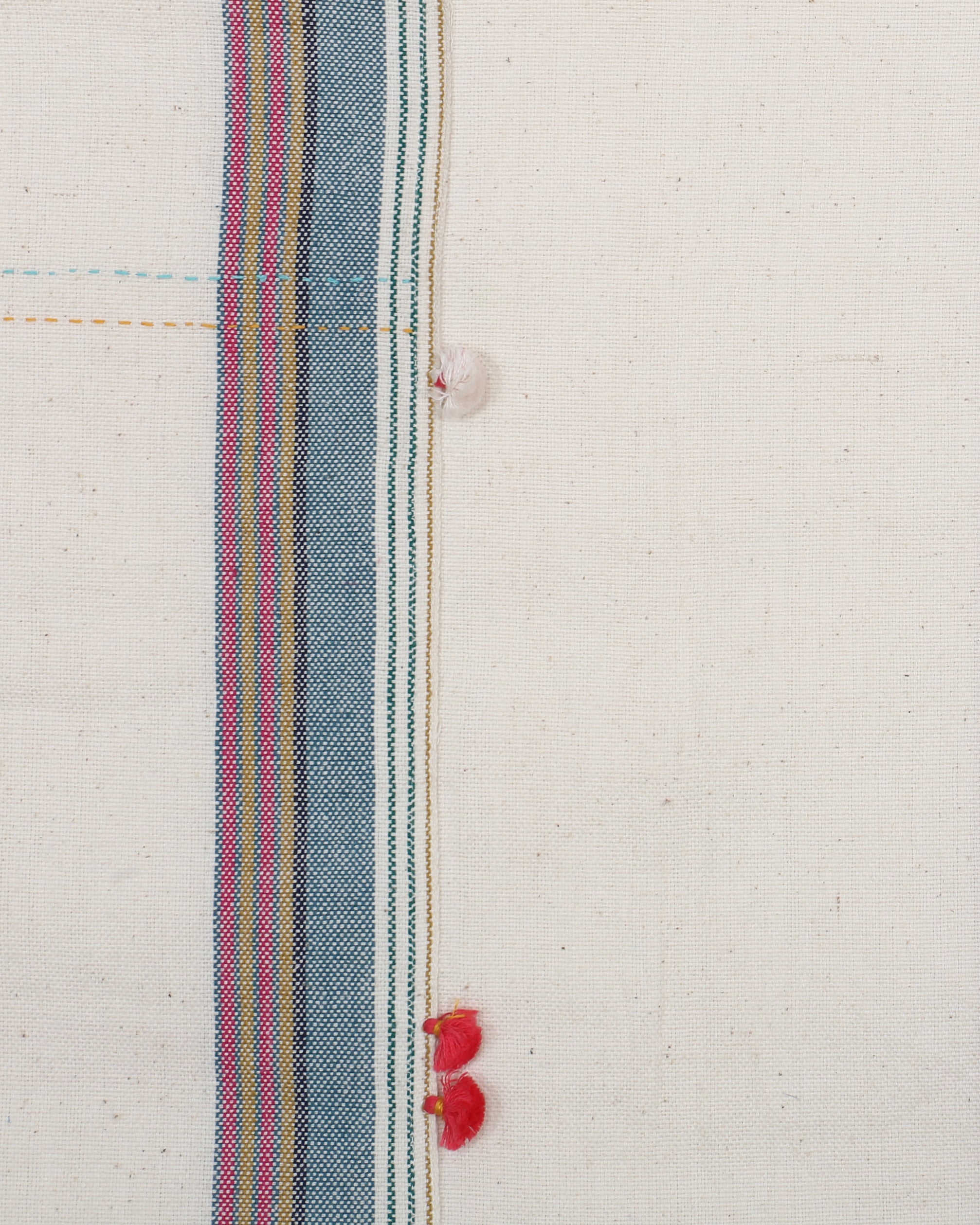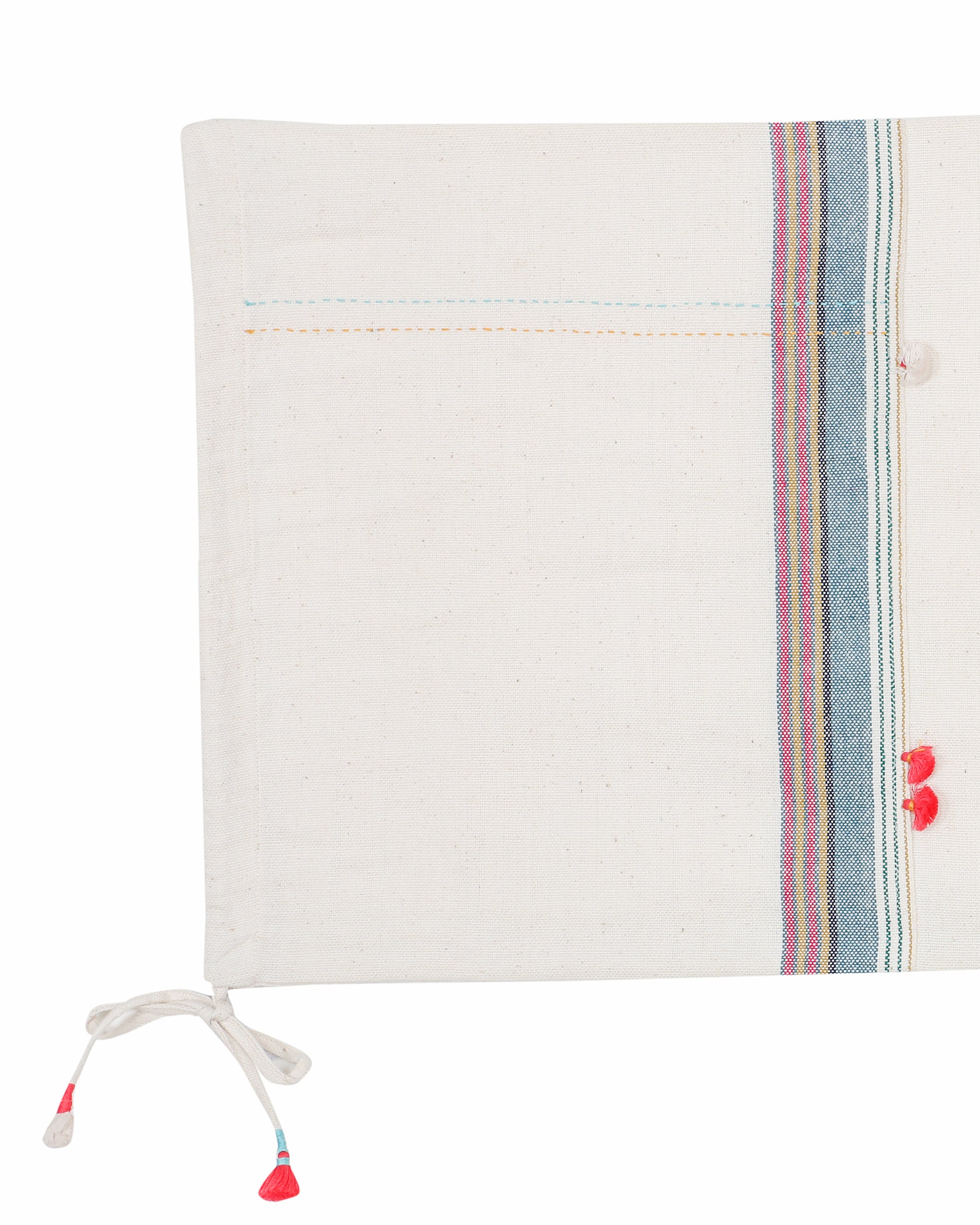 A 'Doha' in fabric form, this cushion distills the wisdom of handcraft. Its intricate textures of bhujodi weaving and muted soft hues with tassels speak of timelessness, while its traditional oval design ensures adaptability. A perfect companion for meditative spaces.
