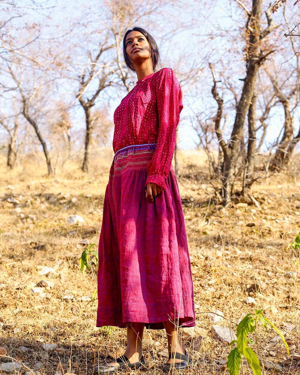 Fatehpur Top in crimson pink, featuring uniform white Bandhani dots crafted with traditional tie-and-dye techniques. It has an enclosed neckline with a single button and subtle gathering near the hem for a soft, fluid finish. The lightweight silk fabric ensures comfort, making it ideal for everyday wear.