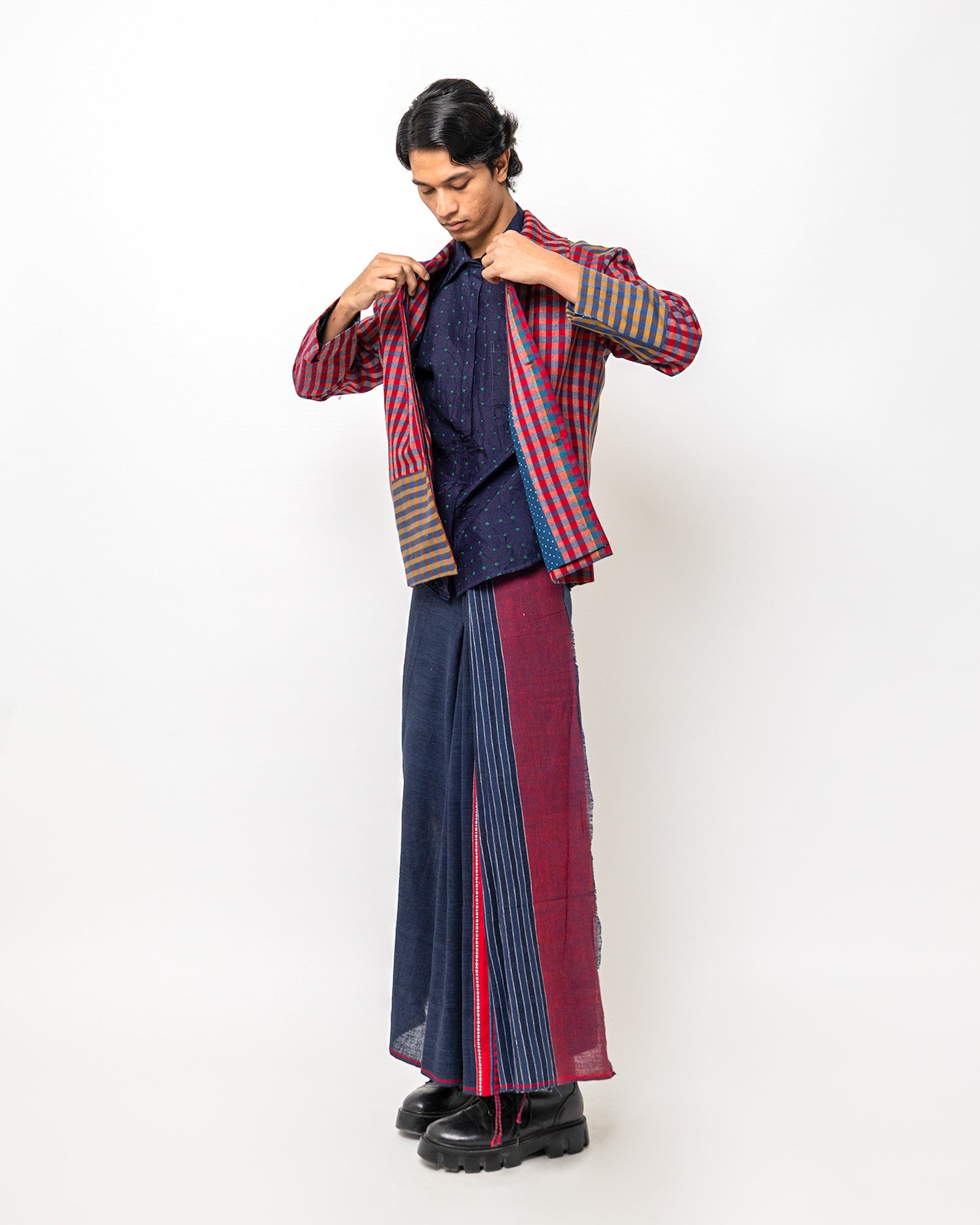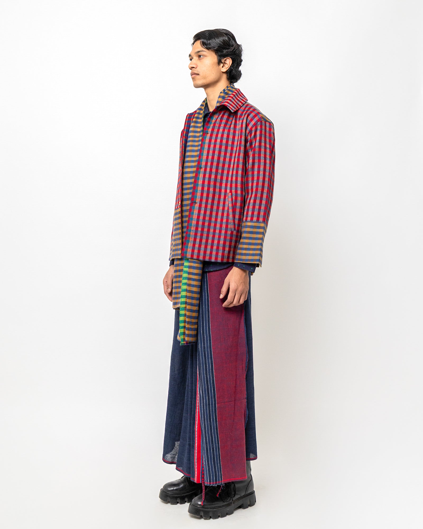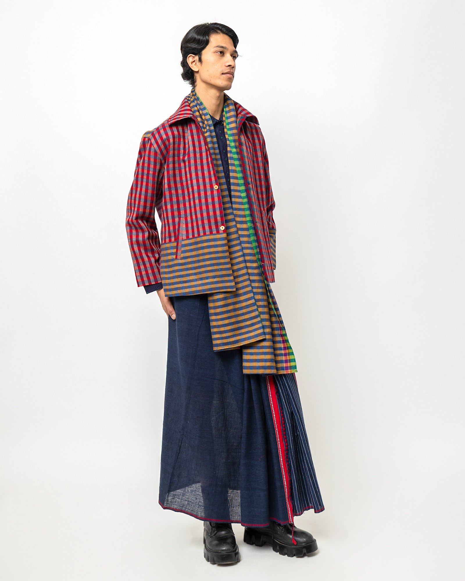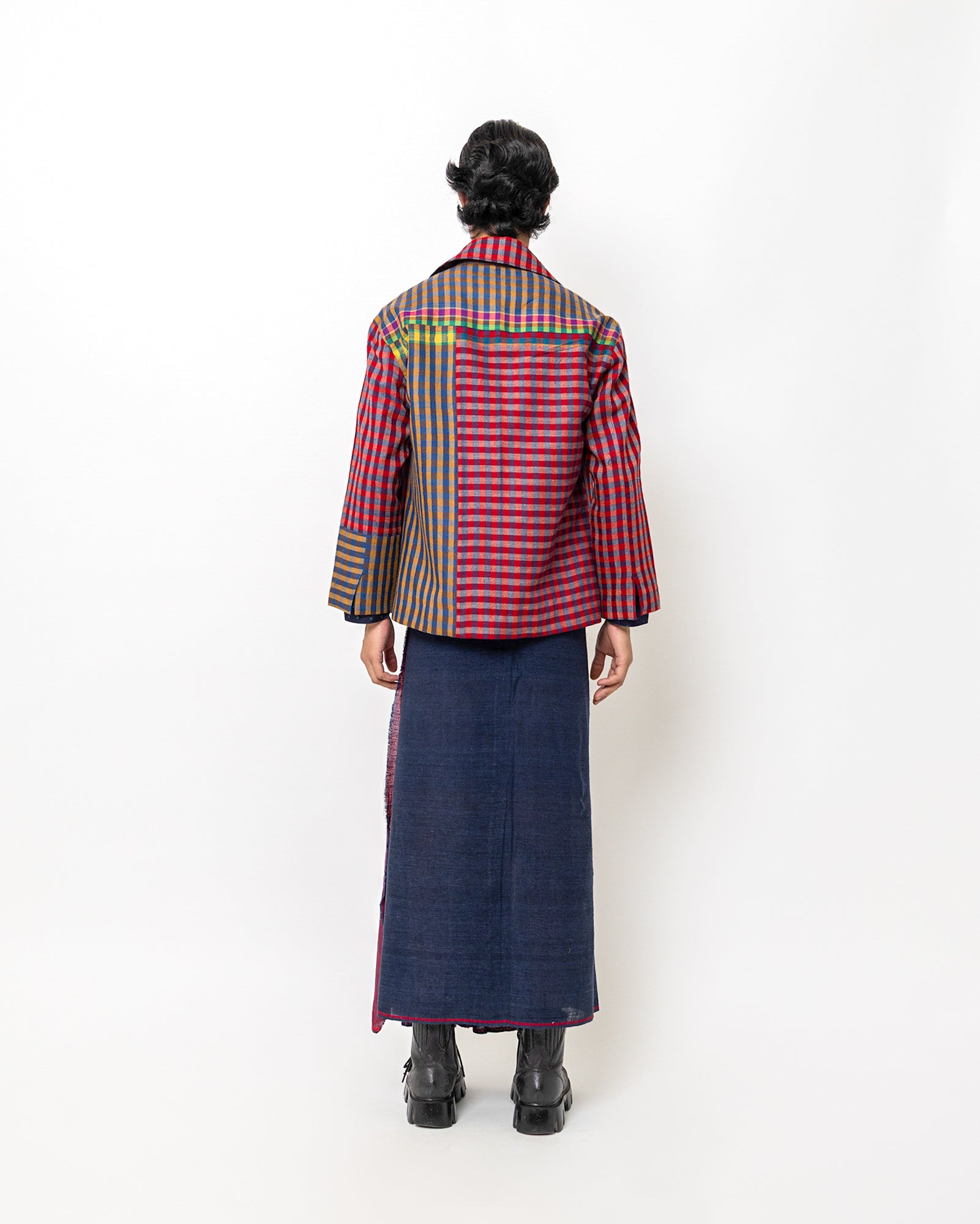 The Harshit Jacket is crafted in handwoven cashmere wool, featuring a vibrant check pattern that brings together deep red, blue, and mustard tones. Lightweight yet warm, it is tailored in a relaxed silhouette with a structured collar, button-down front, and contrast-checked panels at the hem and shoulders. Finished with functional welt pockets and a soft, dotted lining, it offers a refined, easy layer with a playful interplay of colour and weave.