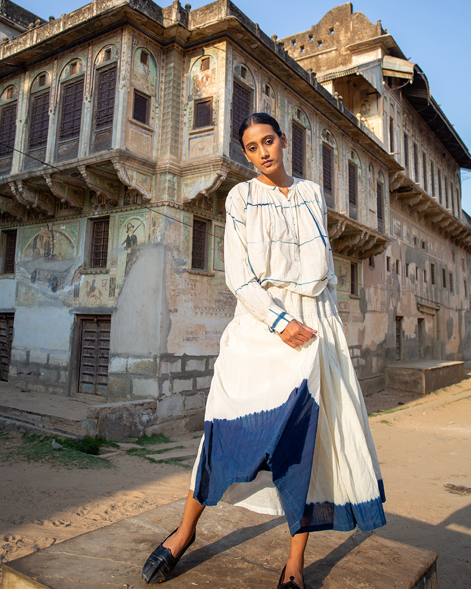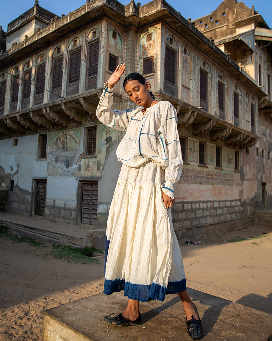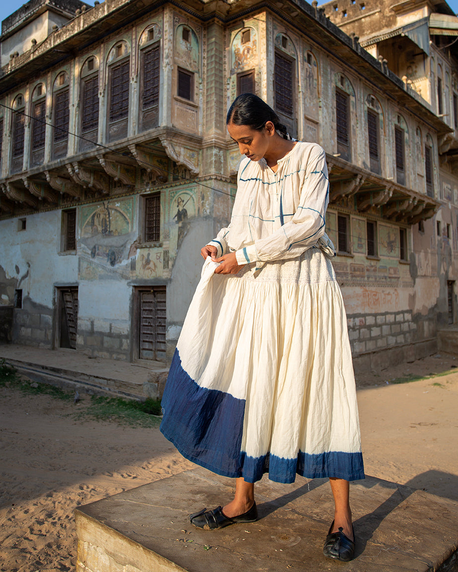 The Indira Skirt, crafted in breathable handwoven cotton, features a paneled design that allows for easy, fluid movement. The naturally dyed indigo border along the hem adds a striking yet minimal detail. With an adjustable waistband for a comfortable fit, this elegant skirt is timeless and versatile.