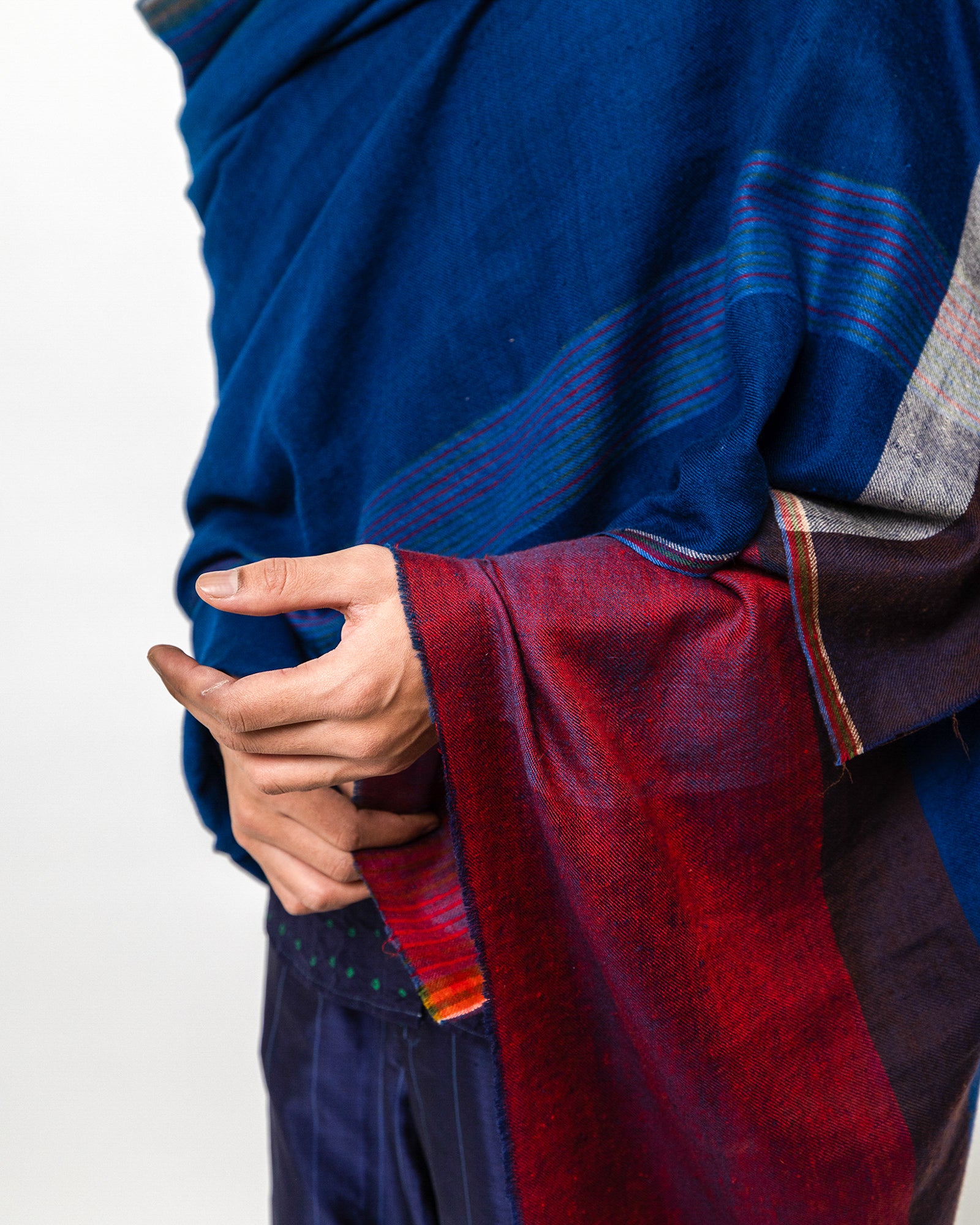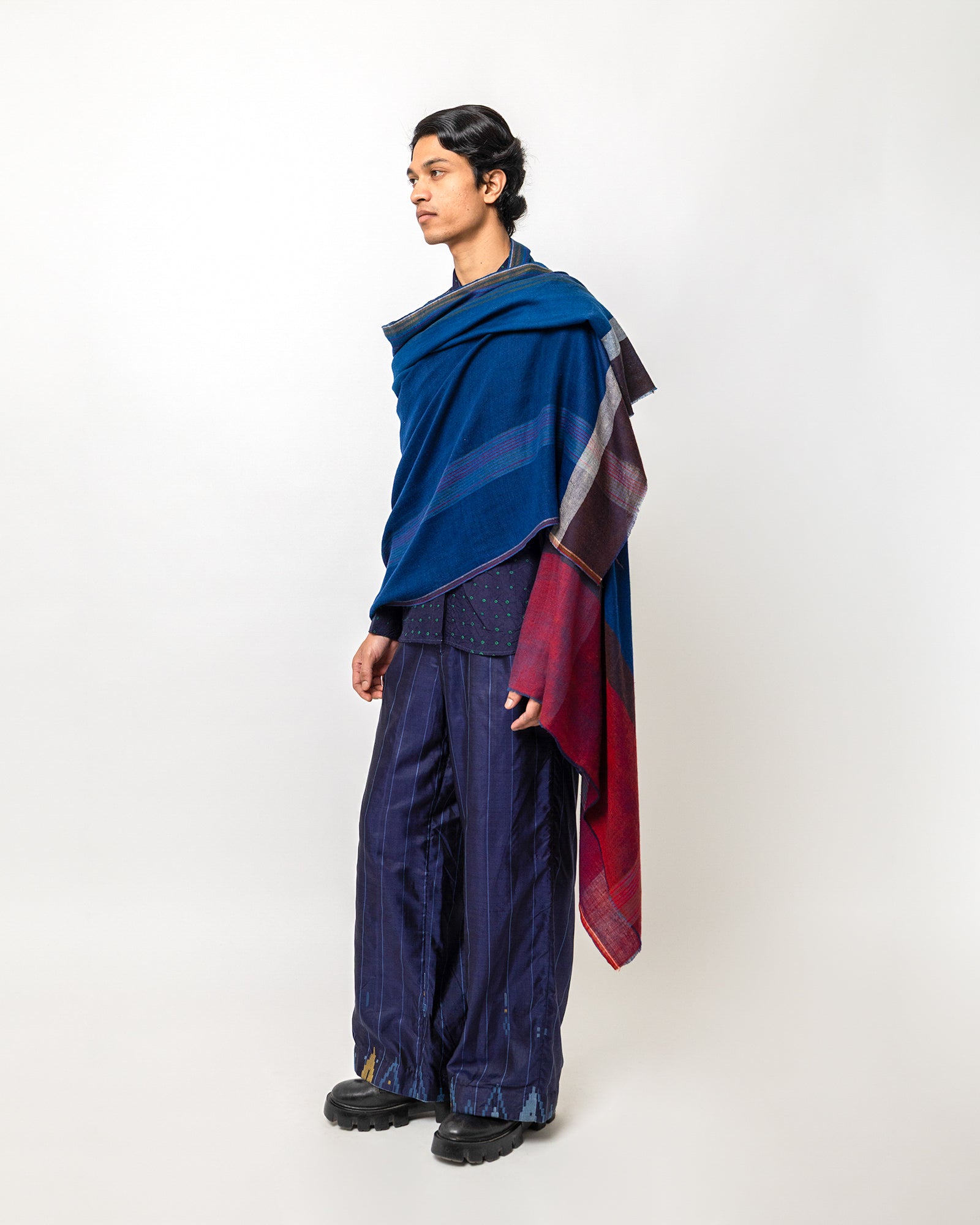The Iresh Scarf is woven in soft cashmere wool. Designed in a deep blue field framed with subtle tonal shifts of red, green, and charcoal, it carries a quiet, luminous depth. Lightweight and warm, the rectangular form drapes effortlessly—worn as a shawl, wrapped for layering, or styled as an everyday winter accessory.