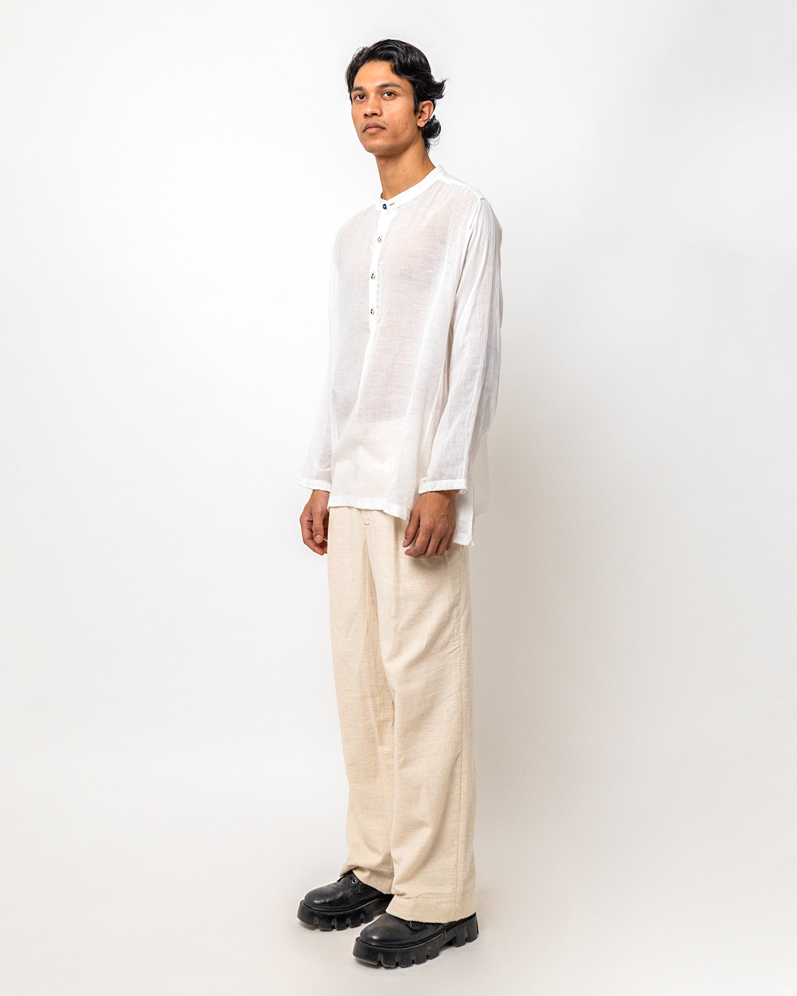 The Ishaan Embroidered Kurta made in handwoven cotton and detailed with subtle white-on-white hand embroidery. Designed in a relaxed, mid-thigh–length silhouette, it features a band collar, a half button-down placket, and full-length sleeves. Fine embroidered motifs trace the placket edge, the side seams, and the pocket finish, adding quiet texture to the pure white base.
