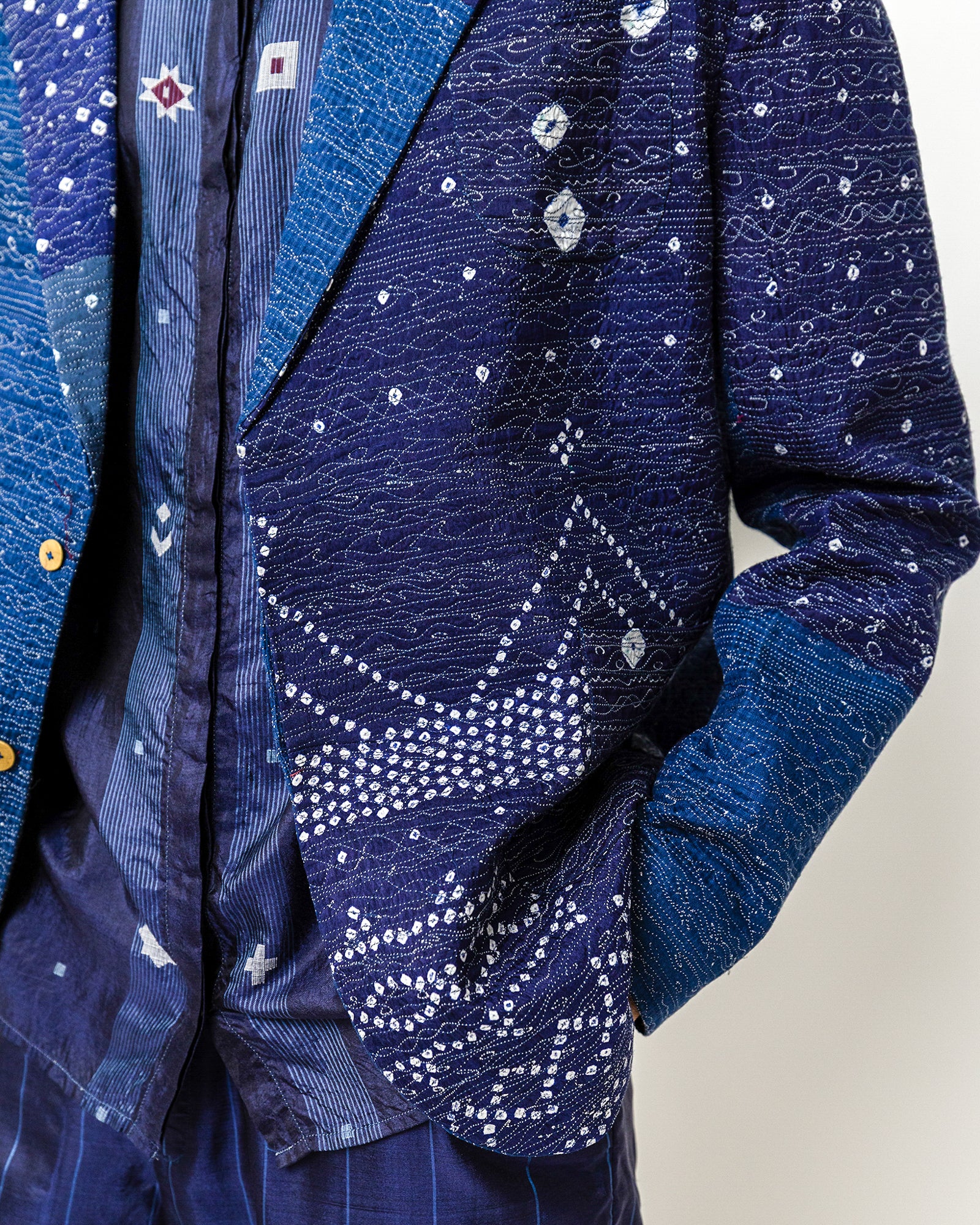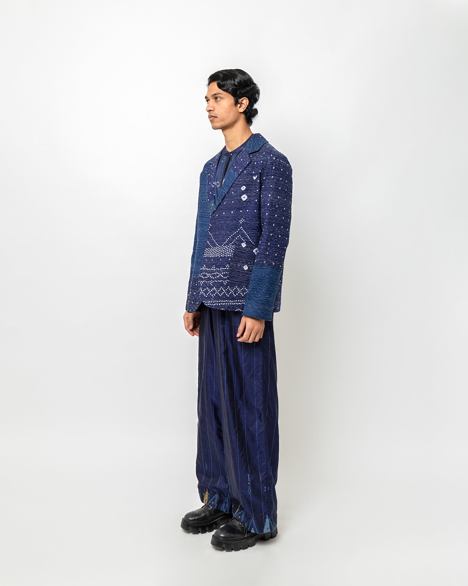 The Ishvak Jacket is crafted in Bandhani silk, combining traditional resist-dye motifs with contemporary tailoring. Designed in a relaxed tailored fit, it features a notched lapel, a two-button front, long sleeves, and two patch pockets—including one in a contrasting Bandhani panel. The indigo base is patterned with dotted and geometric Bandhani motifs placed across the jacket like a subtle patchwork. Fully lined with a dotted inner print in silk.