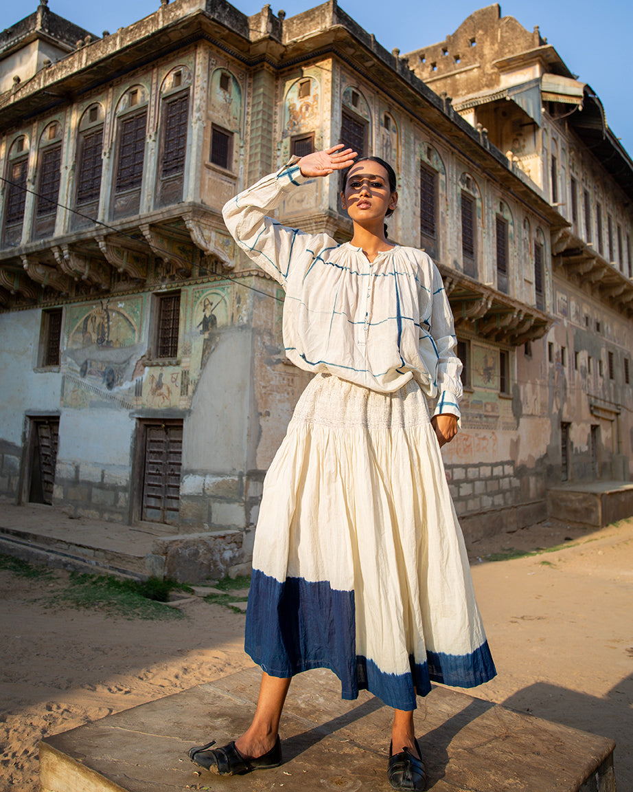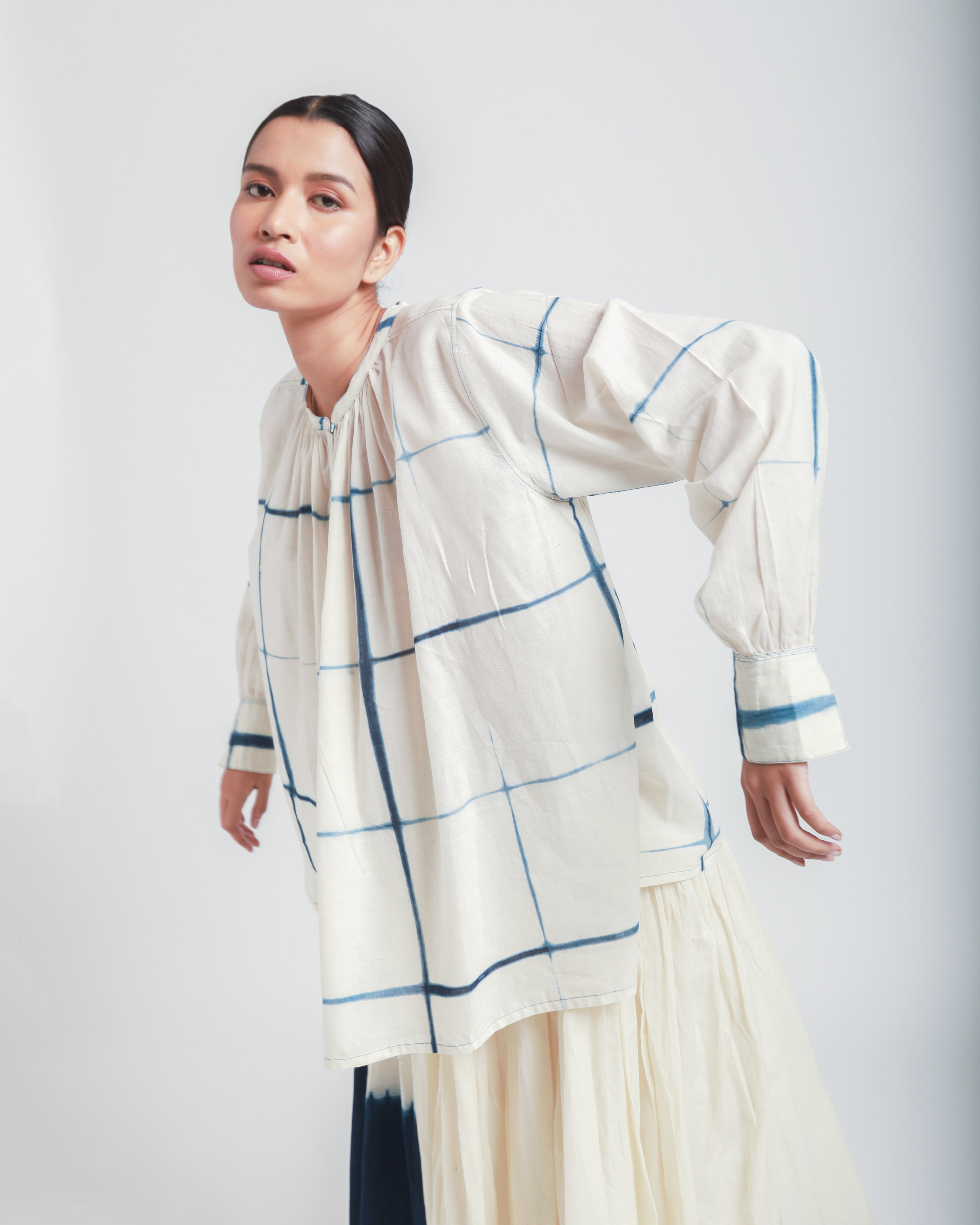 The Jabbar Shirt, crafted in soft cotton, features delicate gathers around the yoke for a gentle, voluminous silhouette. The contrasting indigo, created using the Shibori hand-dyeing technique, adds subtle structure and definition. Lightweight and airy, this graceful top is designed for easy, year-round wear.