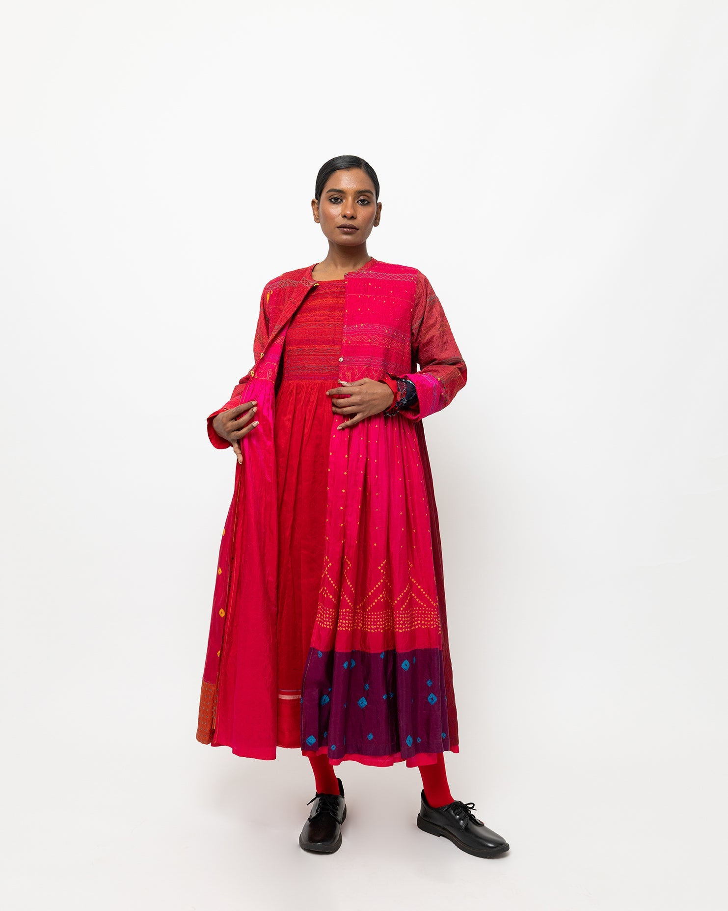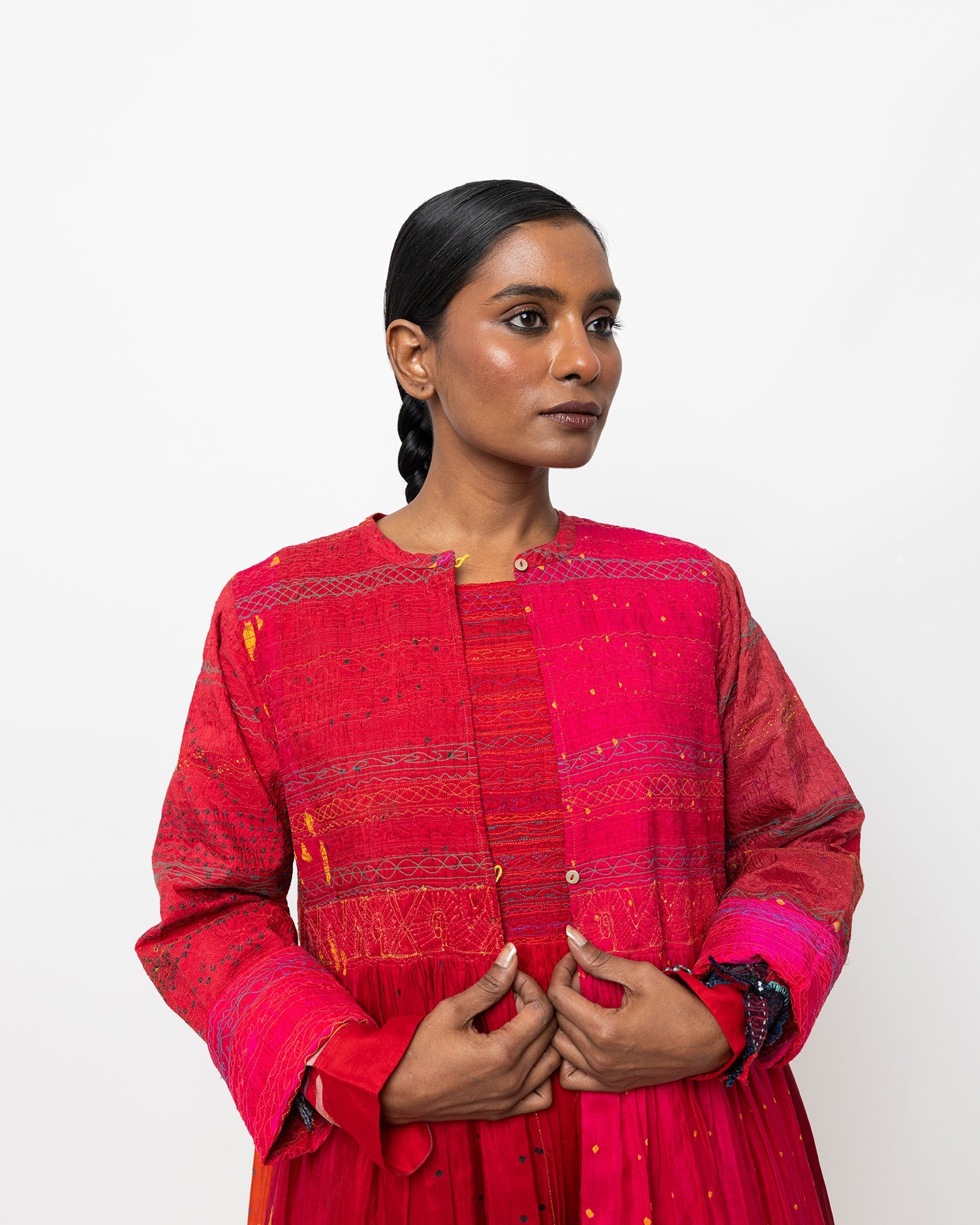 Crafted in tie-dyed silk, the Kael jacket features vibrant scarlet and magenta tones layered with delicate resist-dyed patterns. Designed with a refined banded neckline and a fluid, open-front silhouette, it offers expressive colour and effortless, lightweight layering.