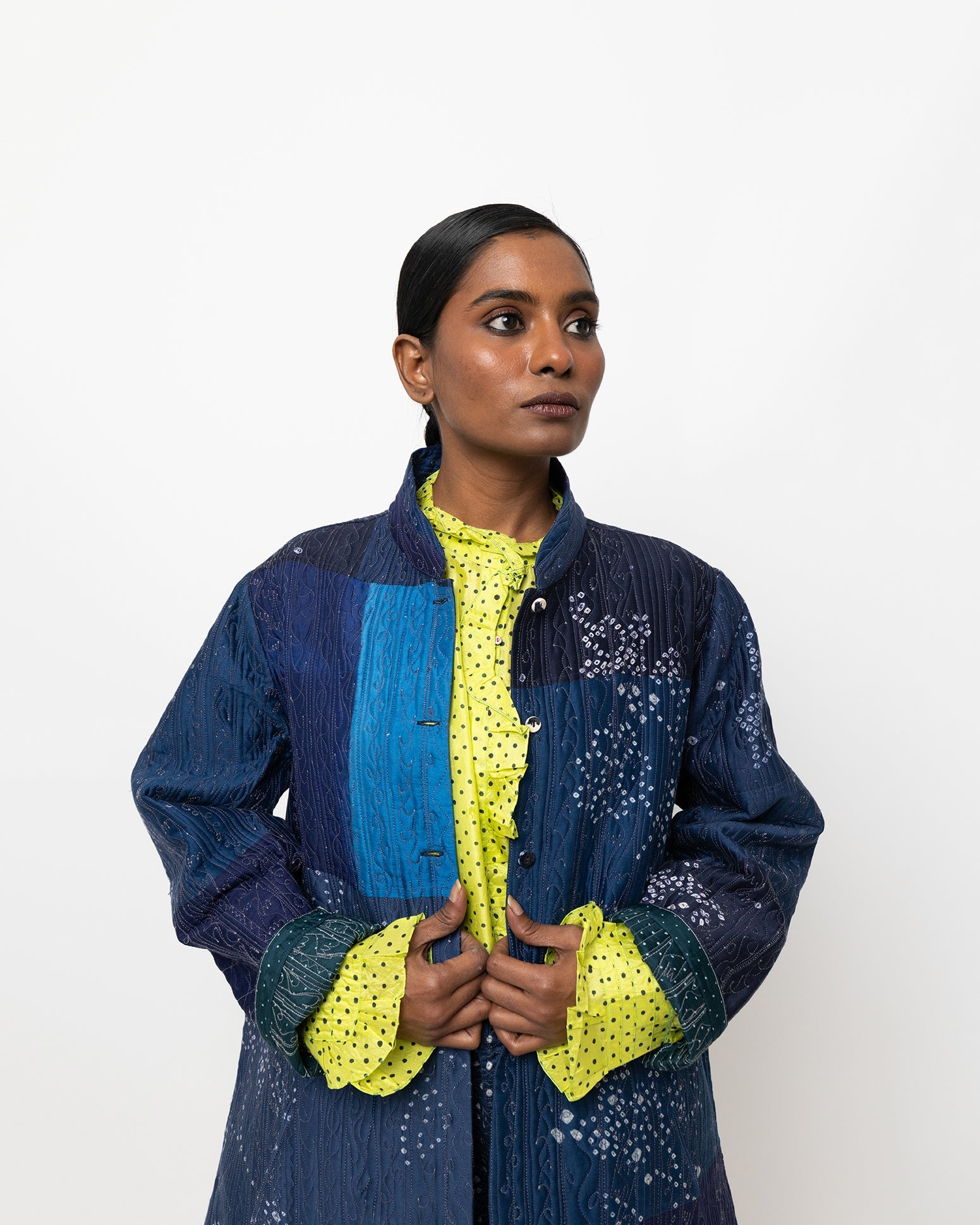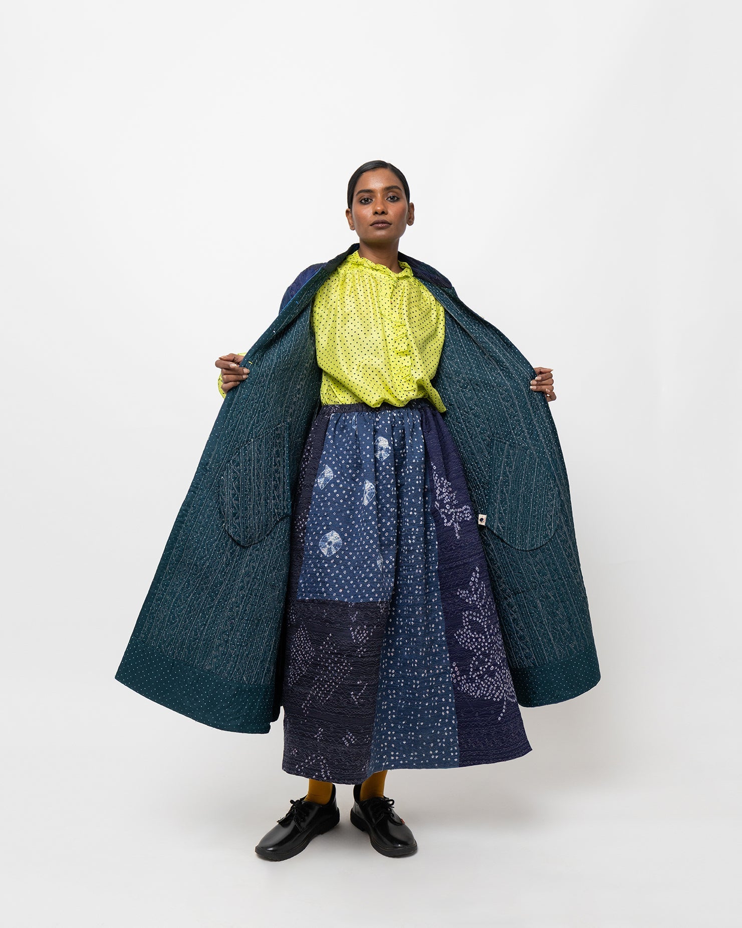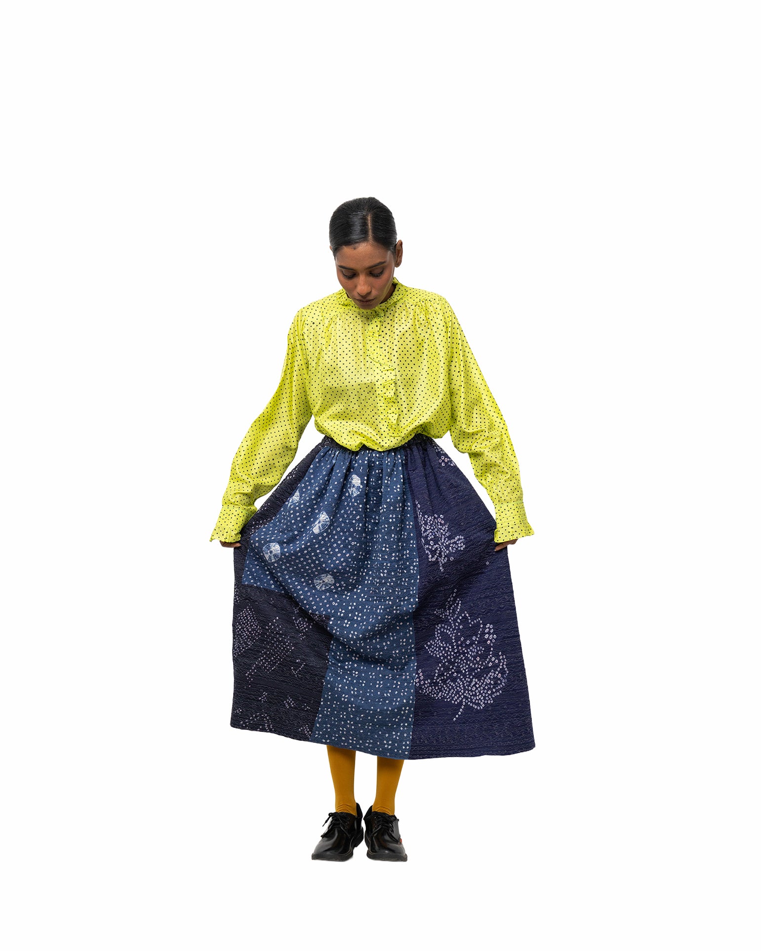 Ketaki shirt in Yellow discharge-dyed silk. Light and airy, it is made for a fluid, relaxed silhouette