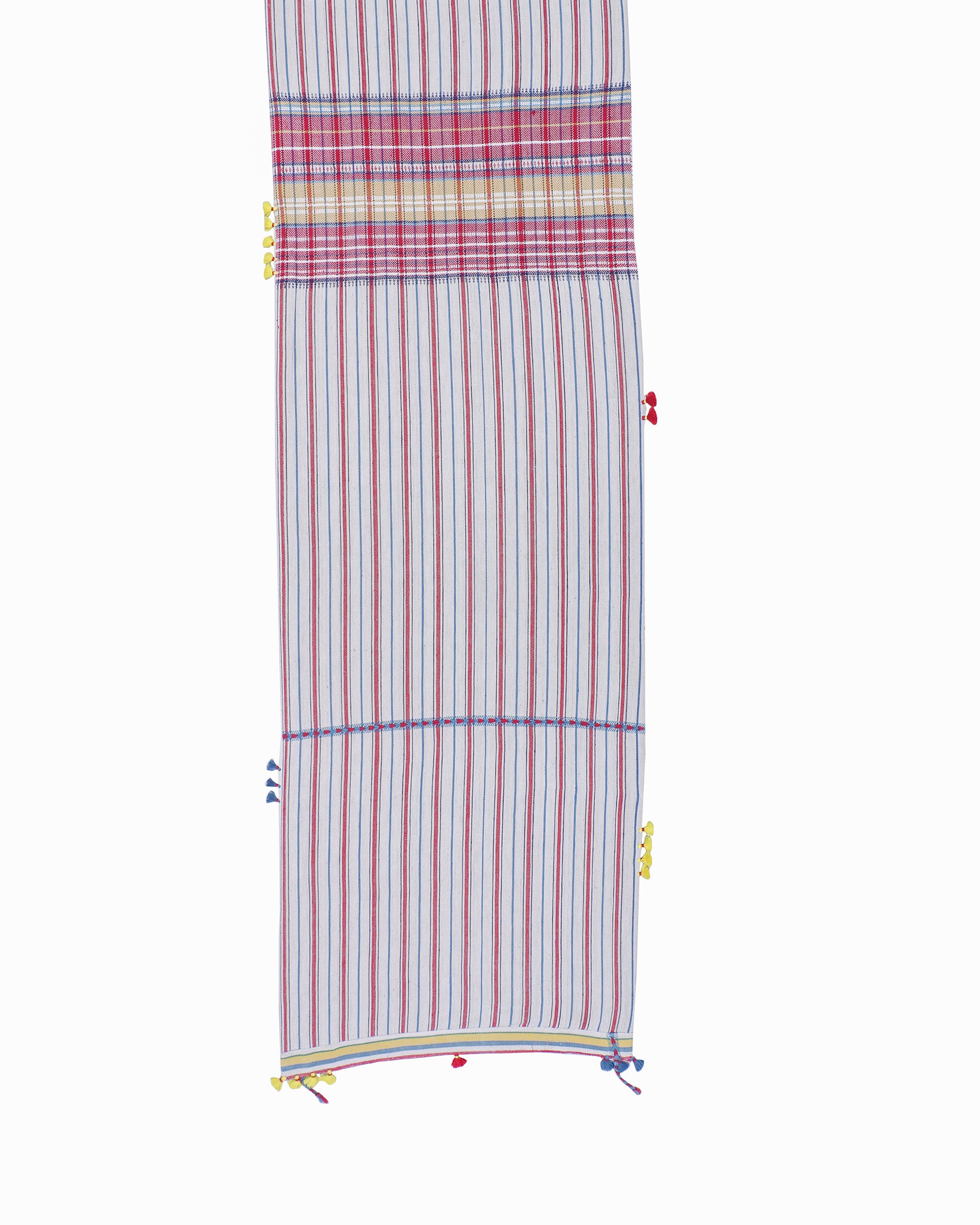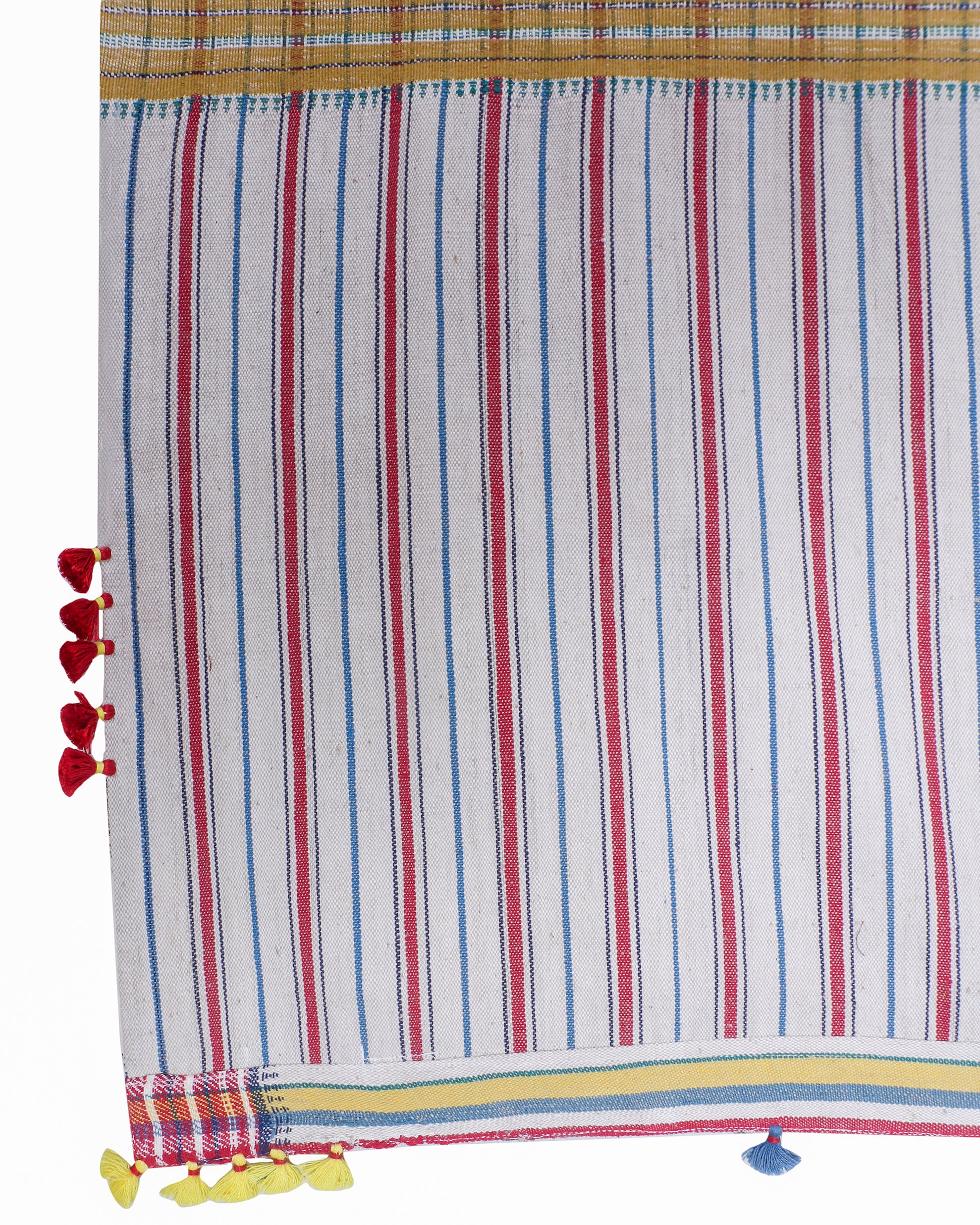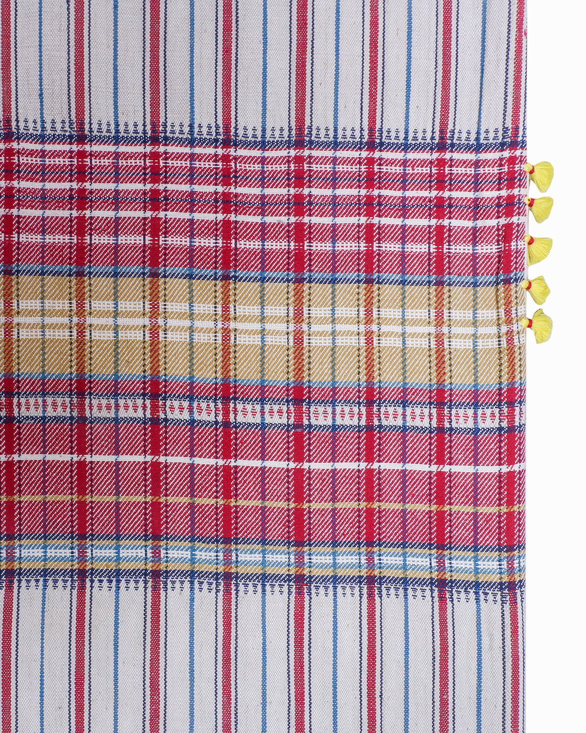This pure cotton runner, called 'Khaddar' is adorned with authentic Bhujodi weaving and finished with charming tassel edges. The weaving, rich in texture, tells a story of craftsmanship, while the tassels provide a fun contrast, making it a perfect complement rustic interiors. Drape it over a wooden console or lay it across a coffee table to infuse warmth and texture into your space. Pair with a vase of fresh blooms or rustic crockery for a welcoming, homey vibe. The neutral tones make it versatile for any room in your home.