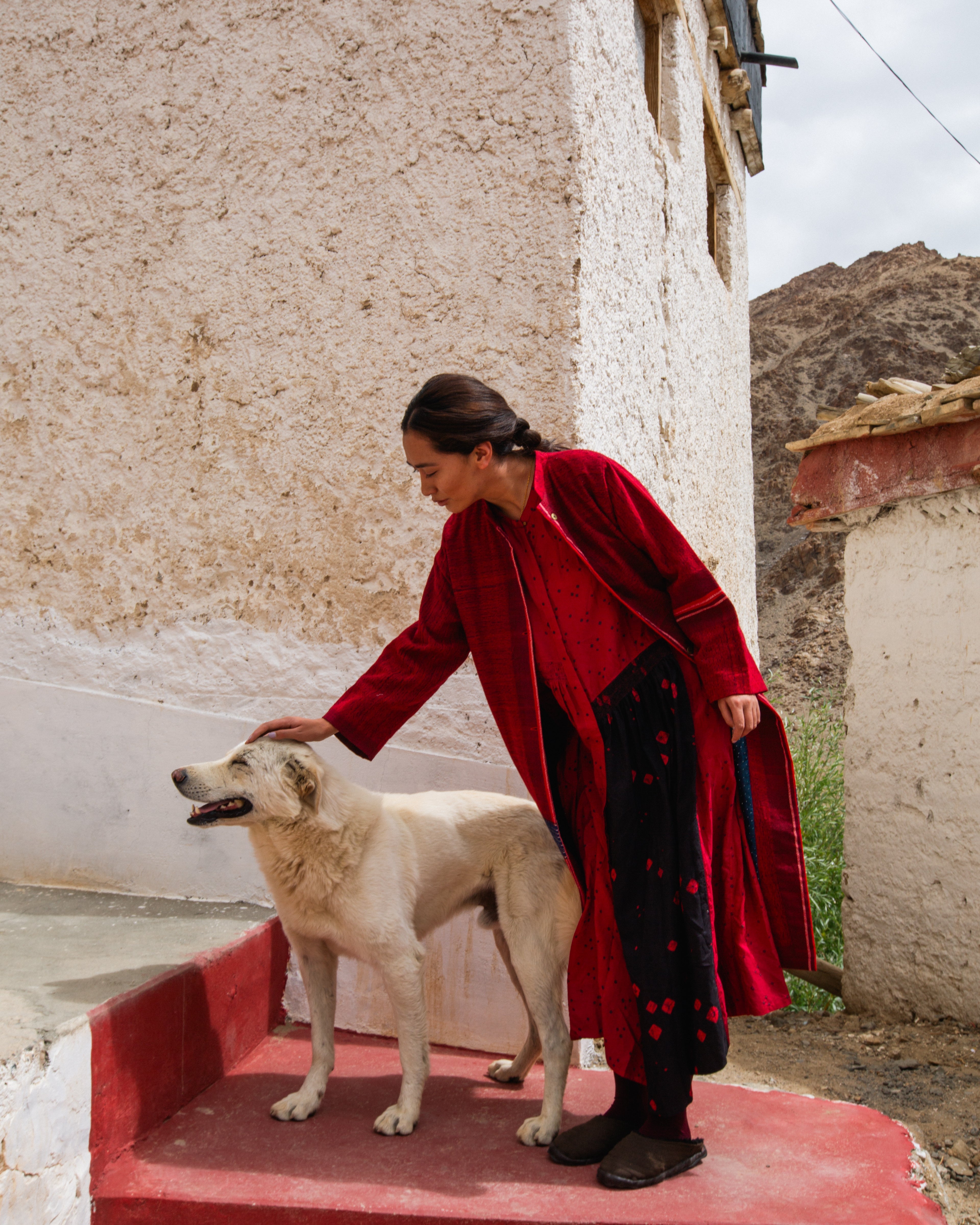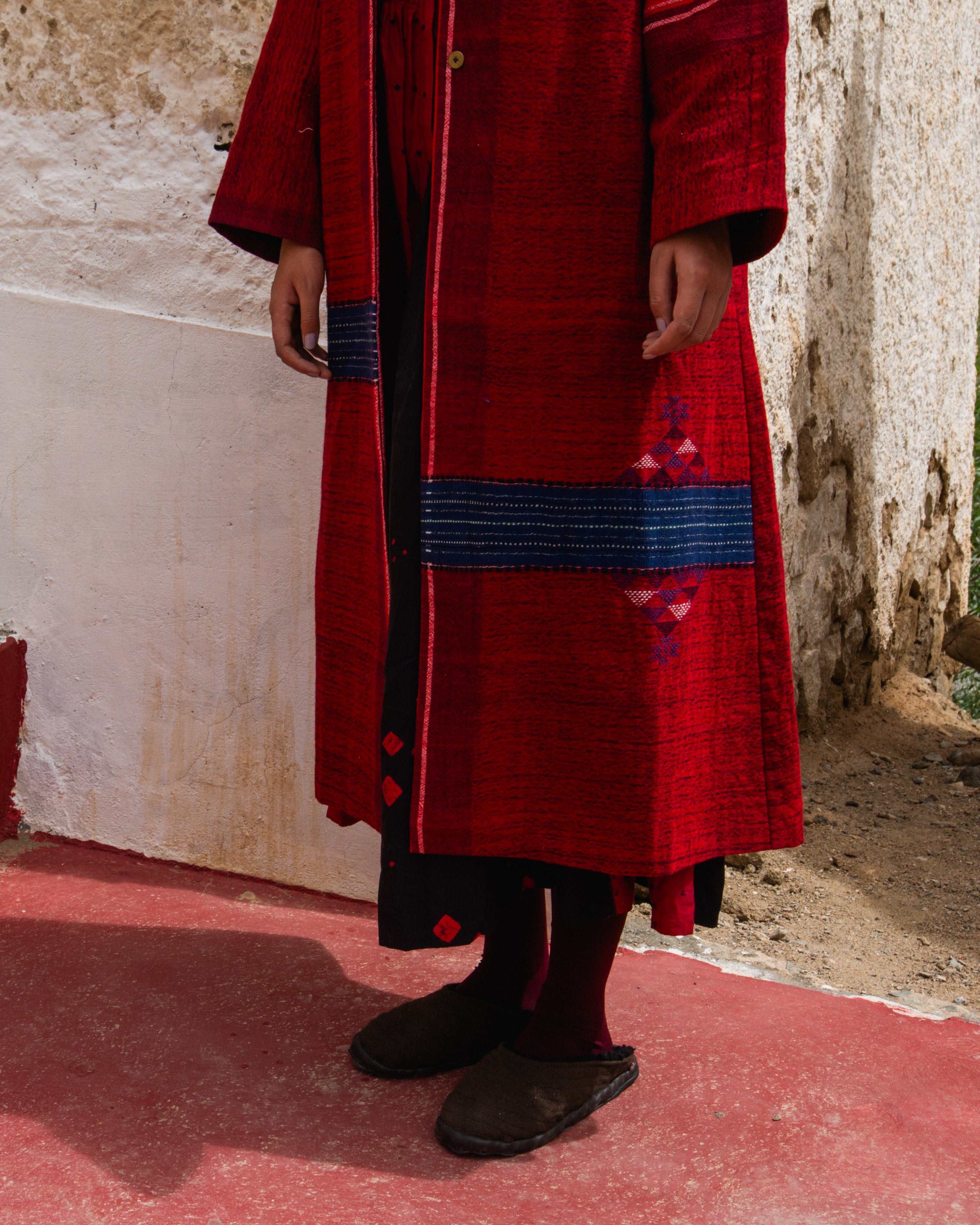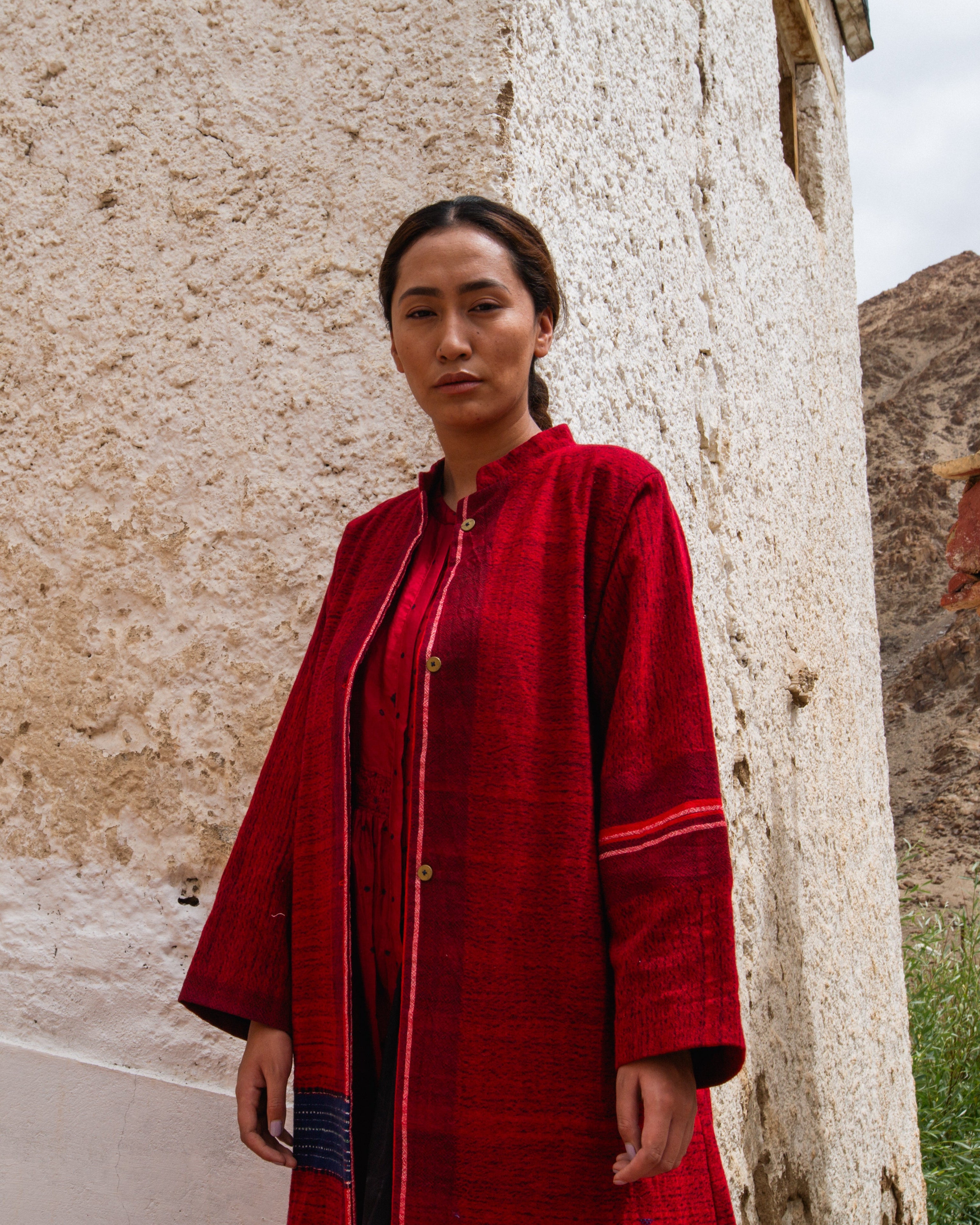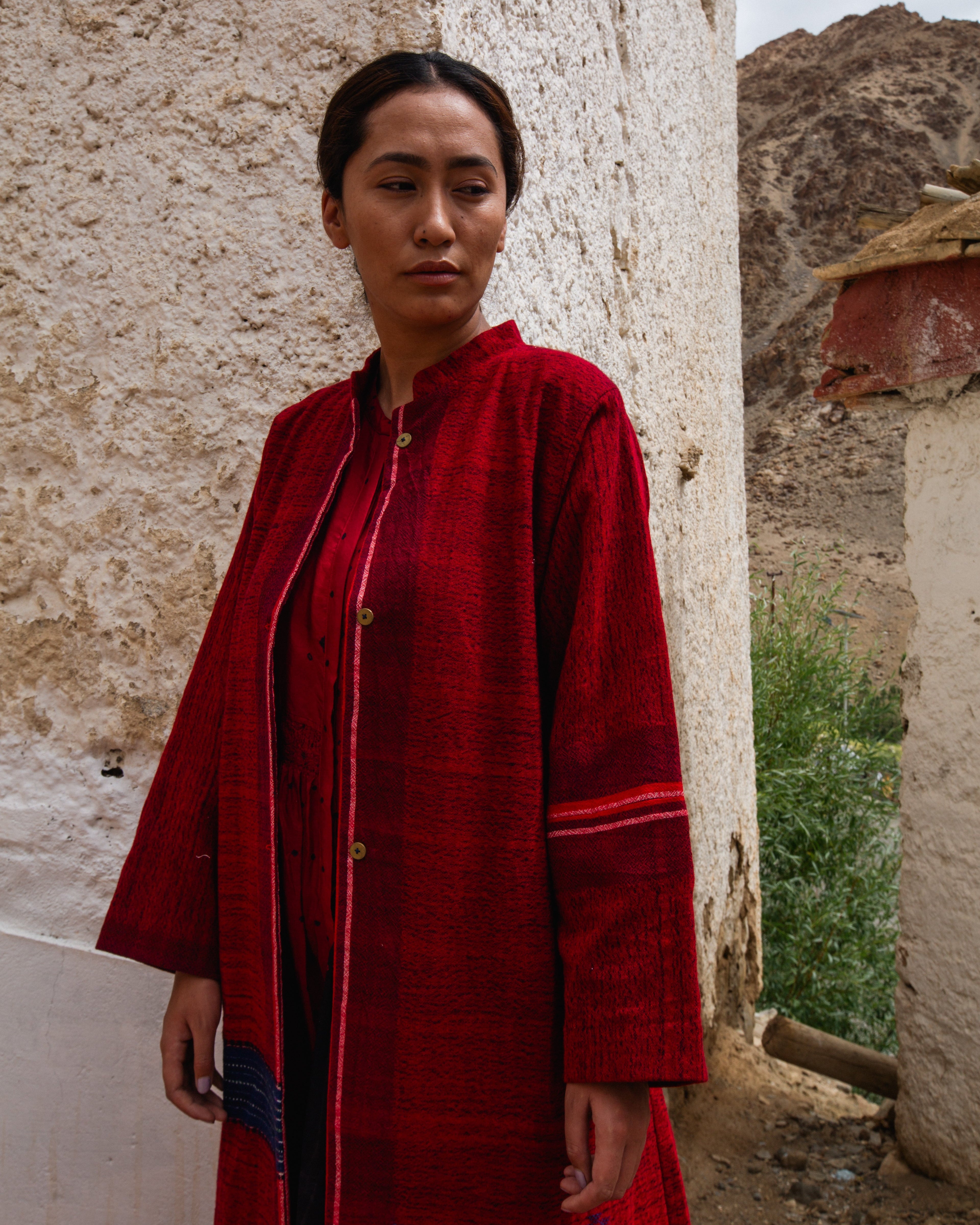Korzok Jacket in luxurious red merini wool, handwoven in Gujarat. It features a stand collar, hand-beaten brass buttons, and subtle blue accents, giving it a structured silhouette.