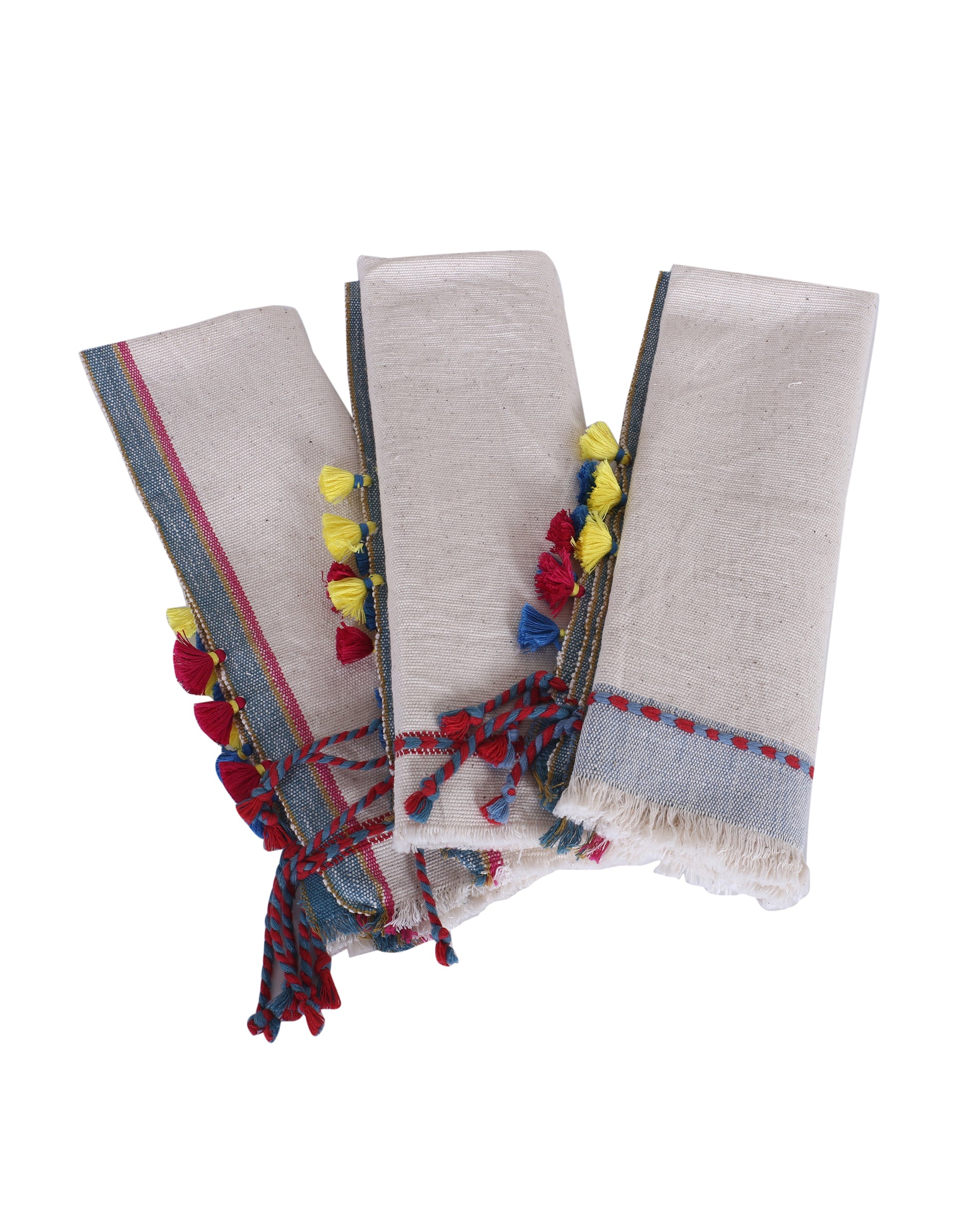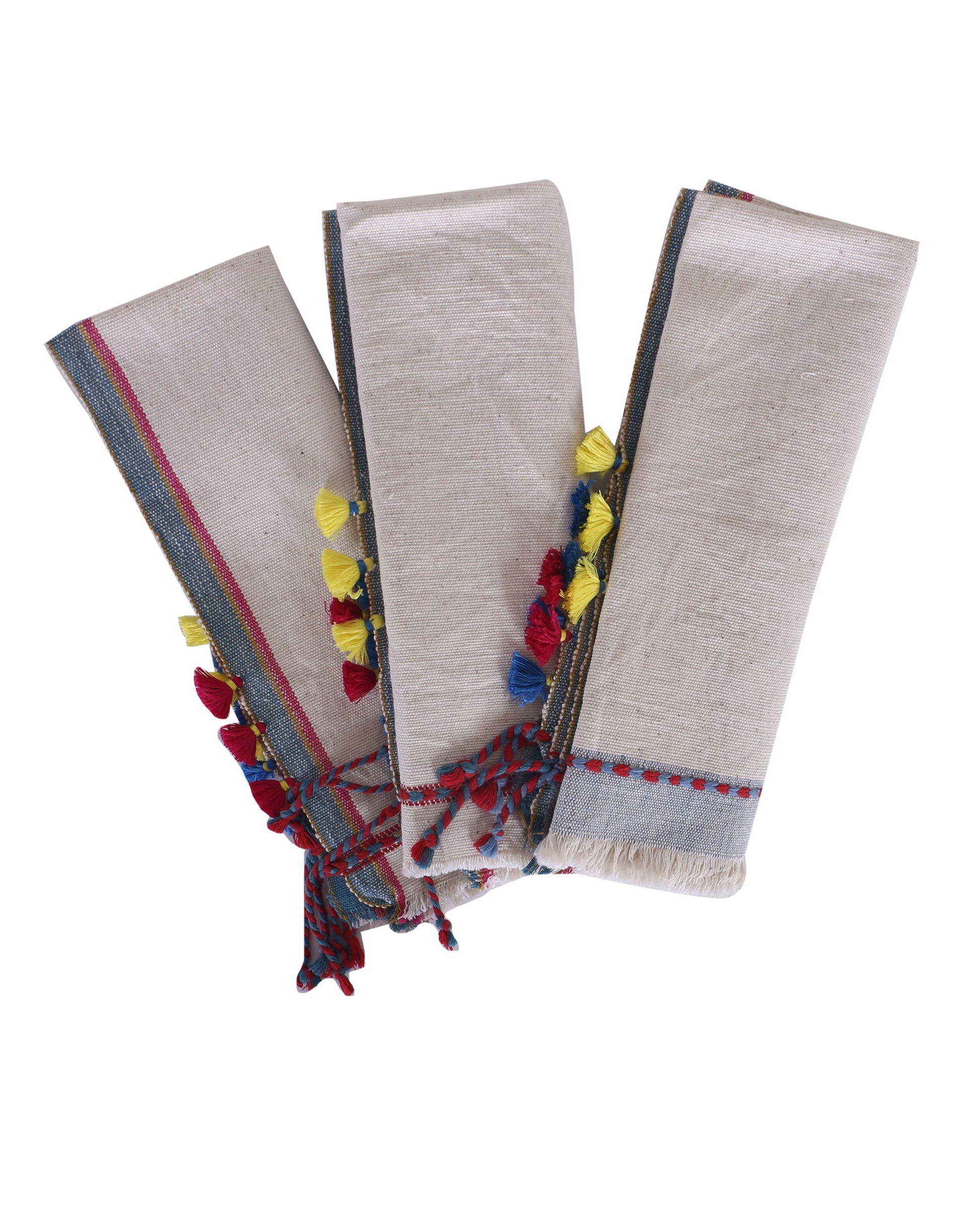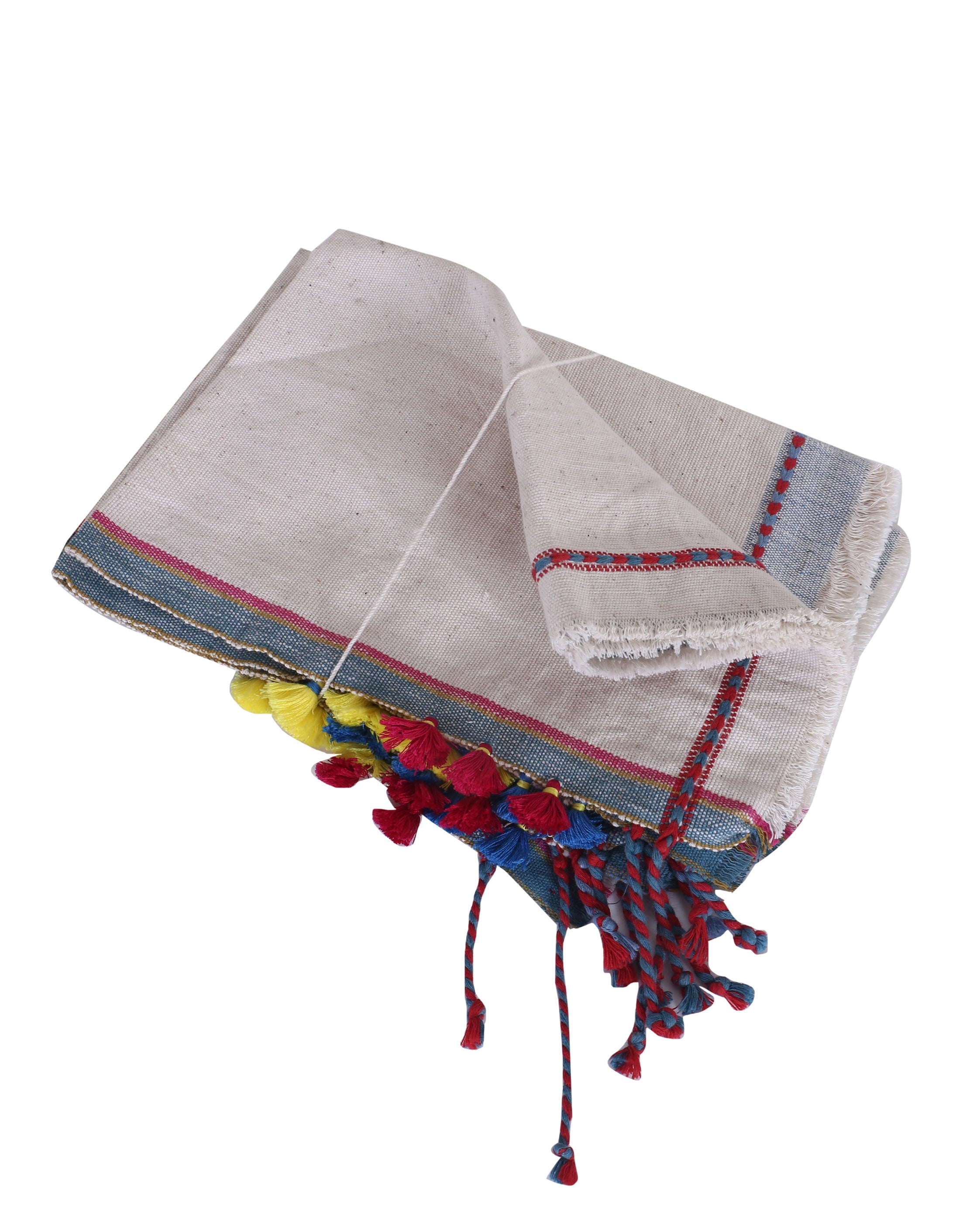 Kosa placemat is a testament to the craft of bhujodi weaving, which is created using 100% pure kala cotton, offering an interesting texture to it. The tactile stripes on the sides enhance its beauty, while hand-tied tassels on the edges complete the piece with a cheerful, crafted detail.