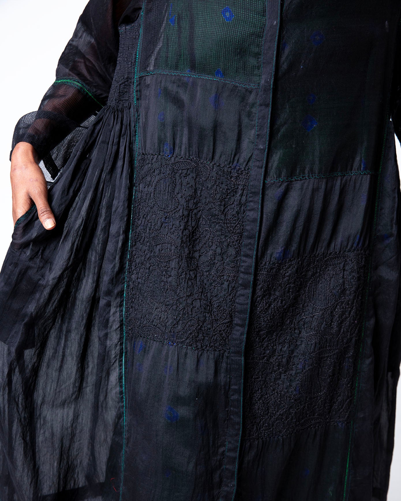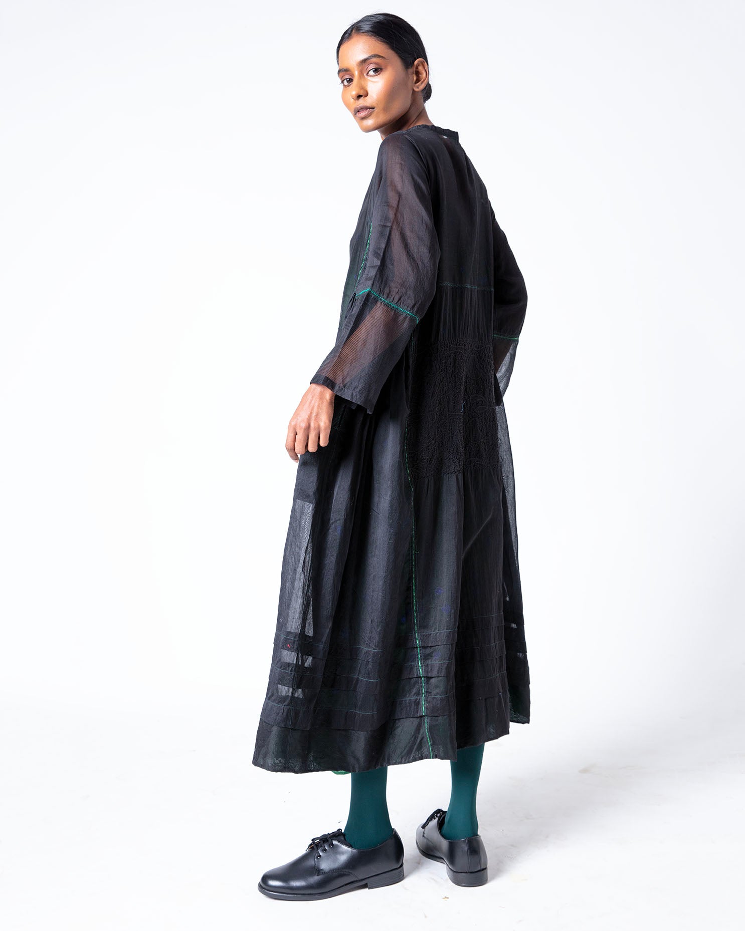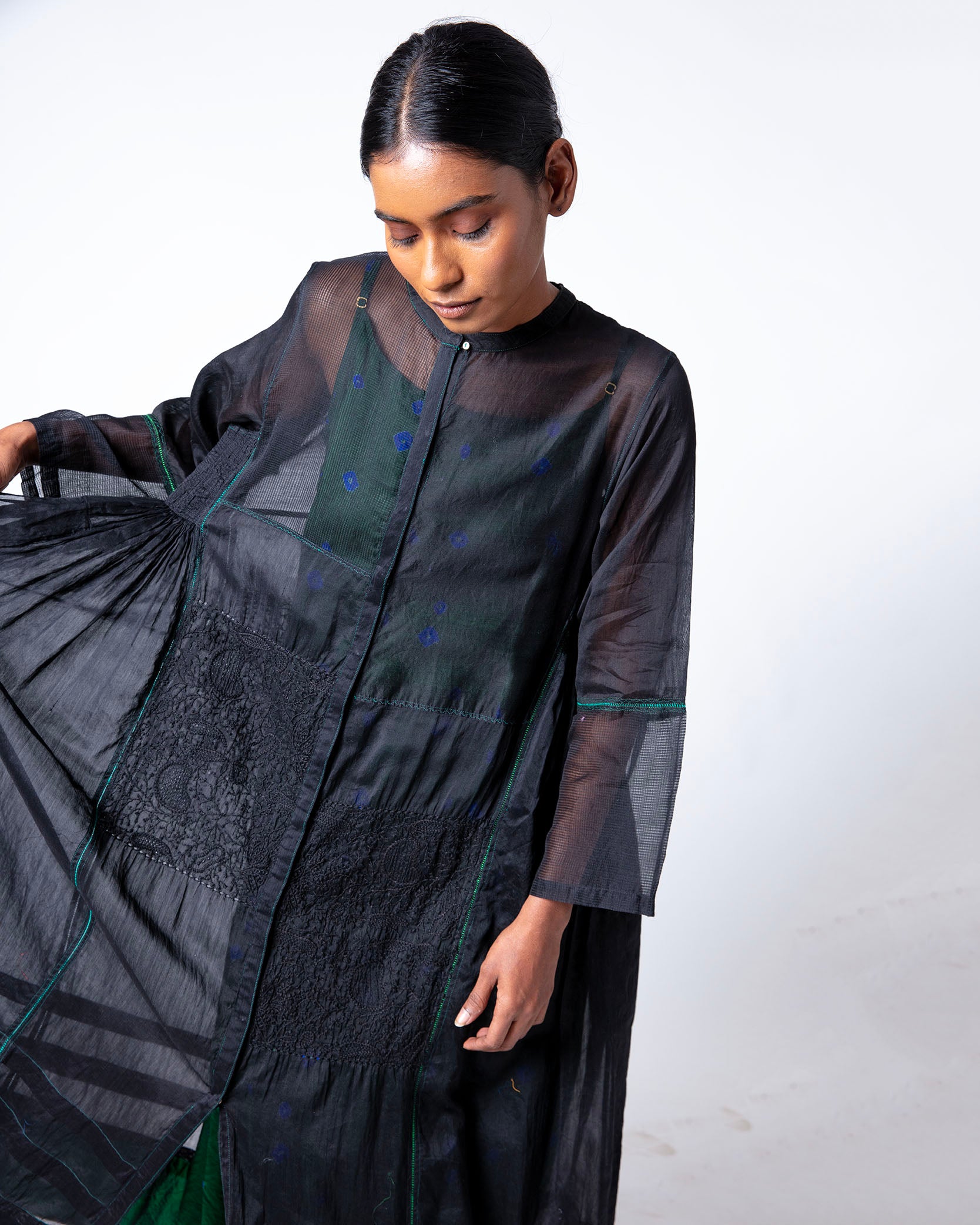 Kunzum Dress in black Chanderi ( cotton silk) , hand embroidered in Lucknow. It features embroidery on the lower half, a stand collar with full sleeves, and a relaxed fit.