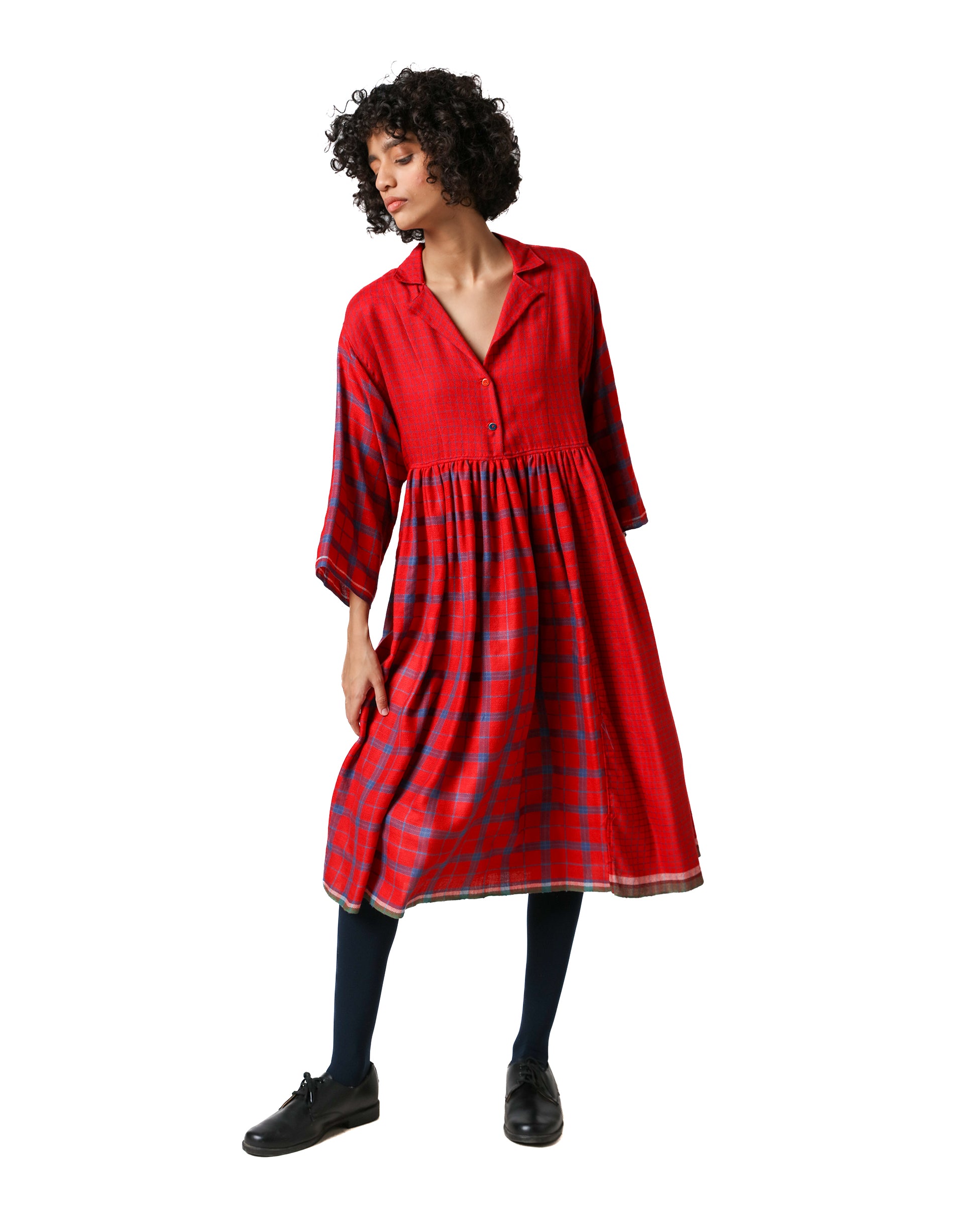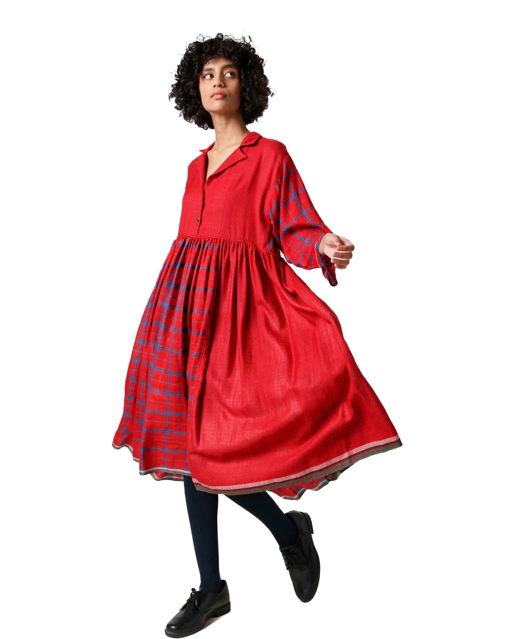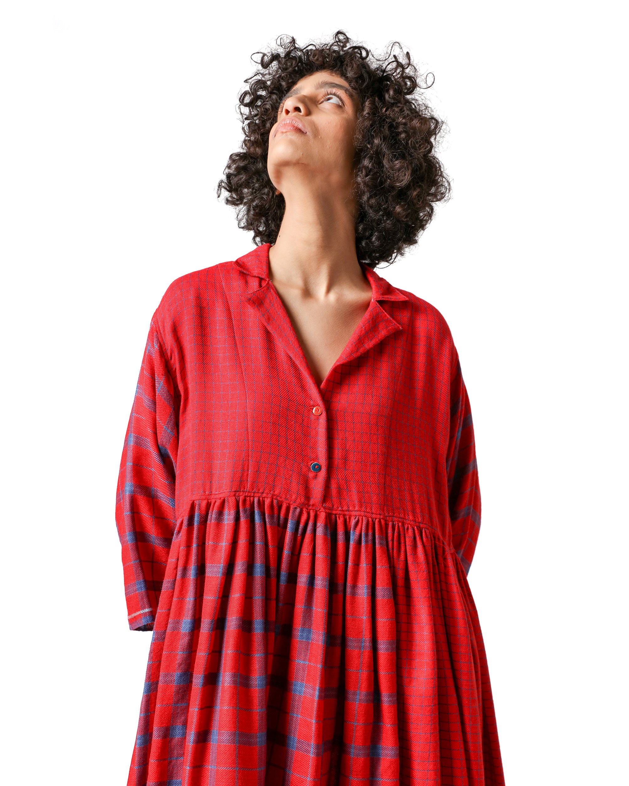 Lama Dress in red wool, featuring a collared V-neck and gathered waist. It has full sleeves, and true to size making it a relaxed fit.