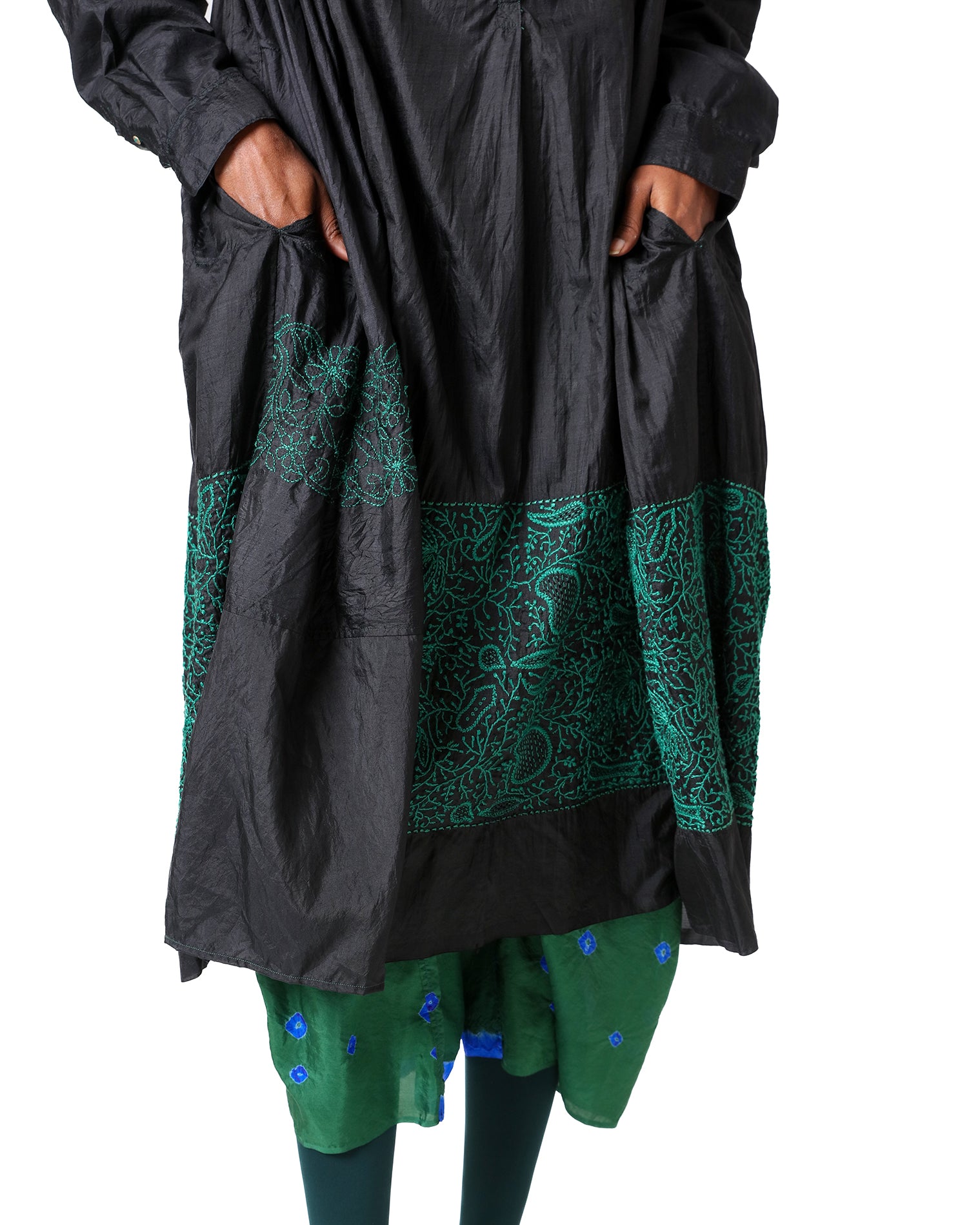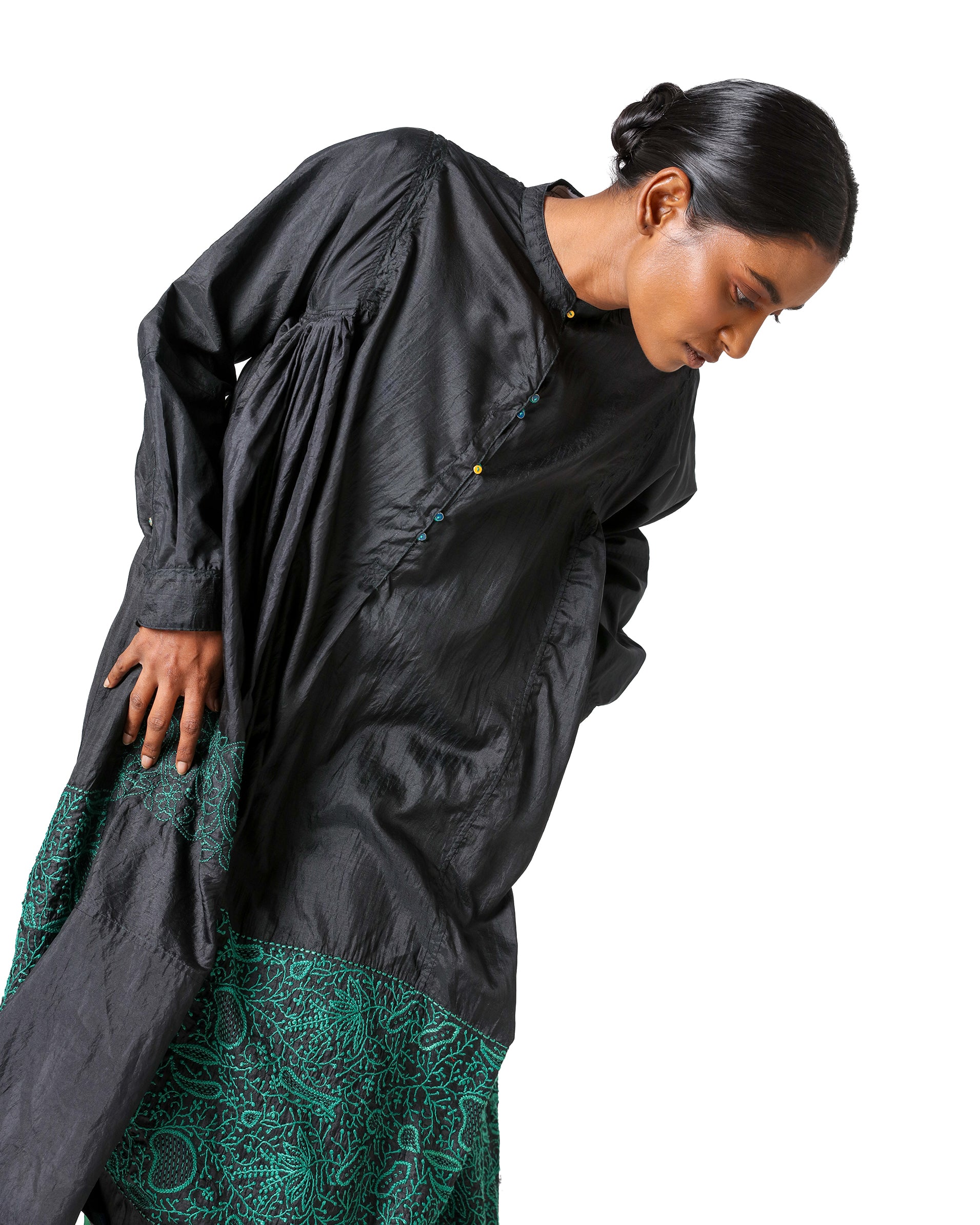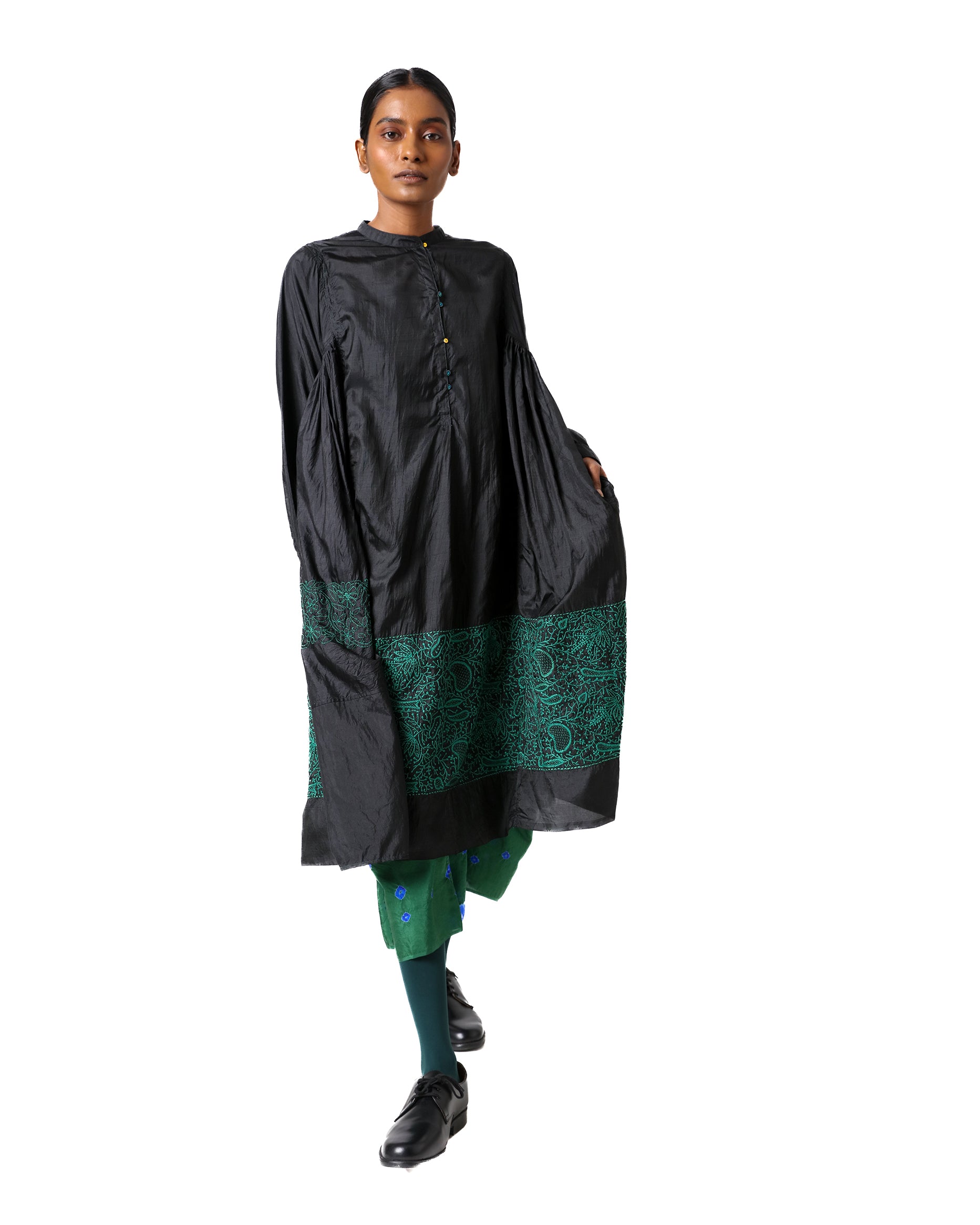 A timeless expression of sophistication, Lamayuru is a classic black silk dress elevated with thoughtful details. The tan collar and closed neckline bring a structured yet graceful appeal, while full sleeves and gathered detailing on both sides add softness and movement. A striking green embroidered panel on the lower half creates a beautiful contrast, and gold button detailing lends an understated elegance.