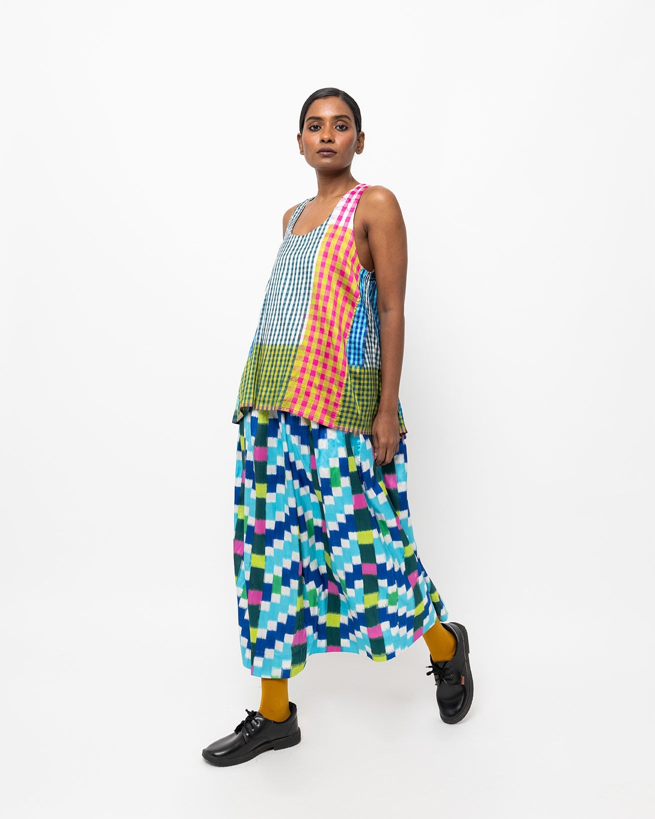 The Malar top is crafted in handwoven ikkat silk, bringing together vibrant checks in a lively patchwork of color. Designed with a relaxed, sleeveless silhouette, it falls softly with a light, fluid drape. Fresh and expressive, Malar pairs effortlessly with printed skirts, saris or solid trousers for an easy, contemporary look rooted in craft.