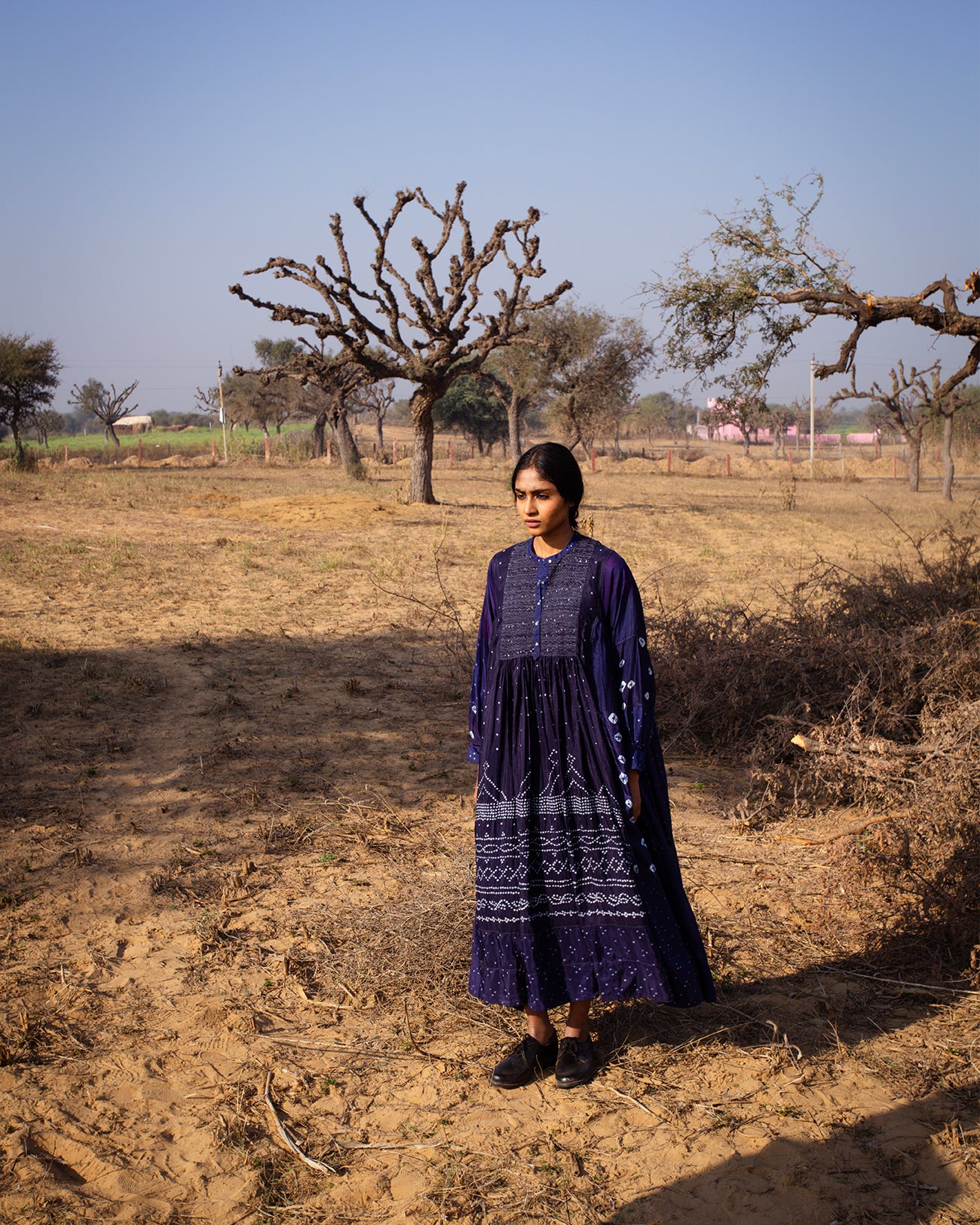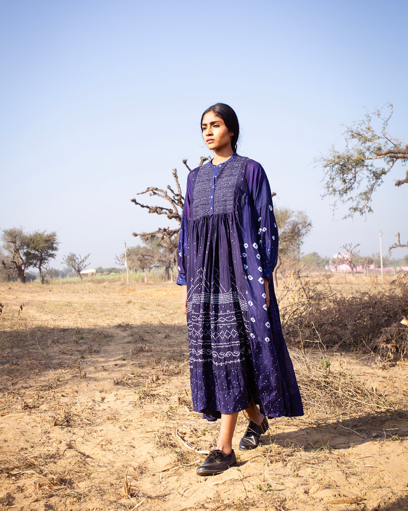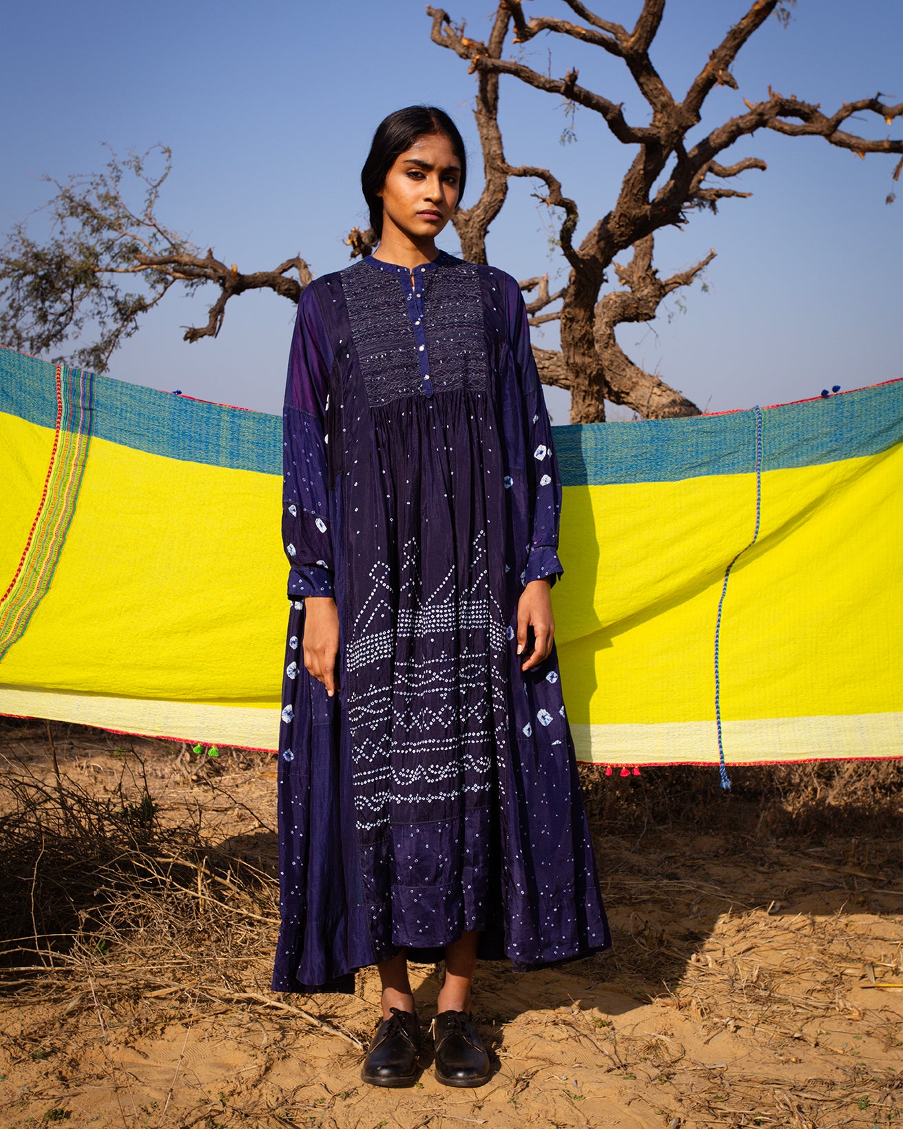 Crafted in lightweight bandhani silk, the Mandrella Dress is hand tie-dyed in Gujarat. It features smocking at the yoke and soft gathered flares on either side. The fit is loose for ease and comfort.