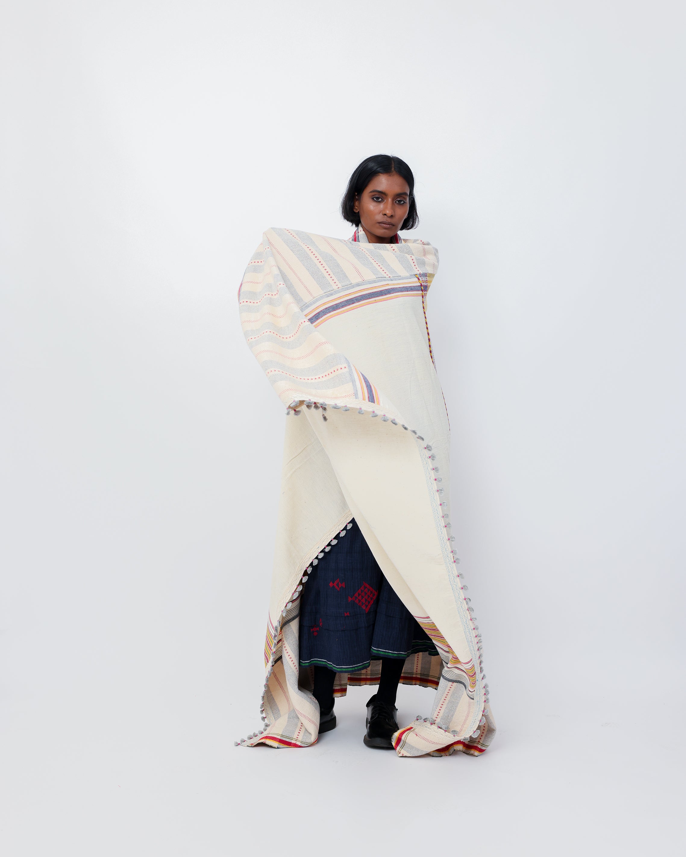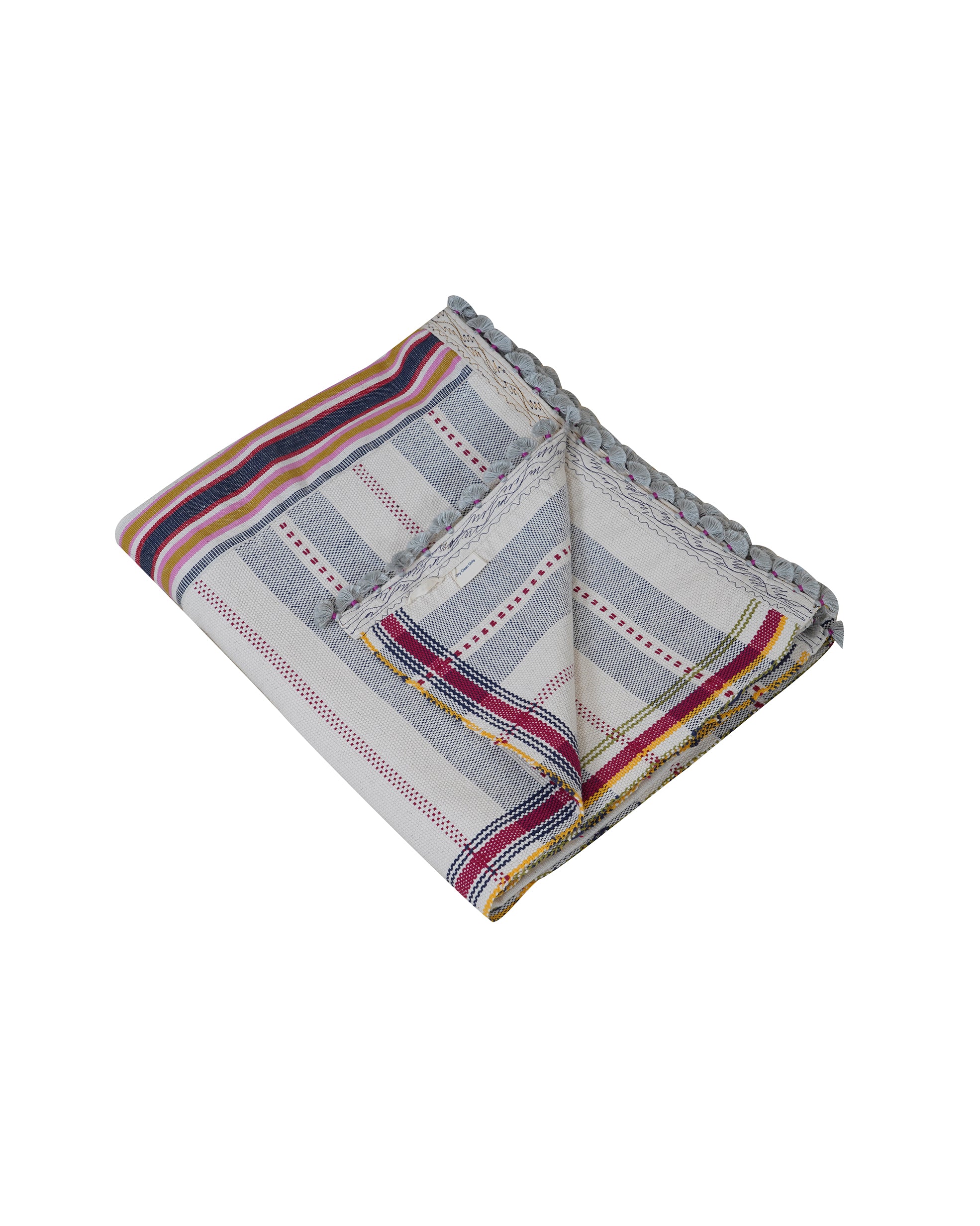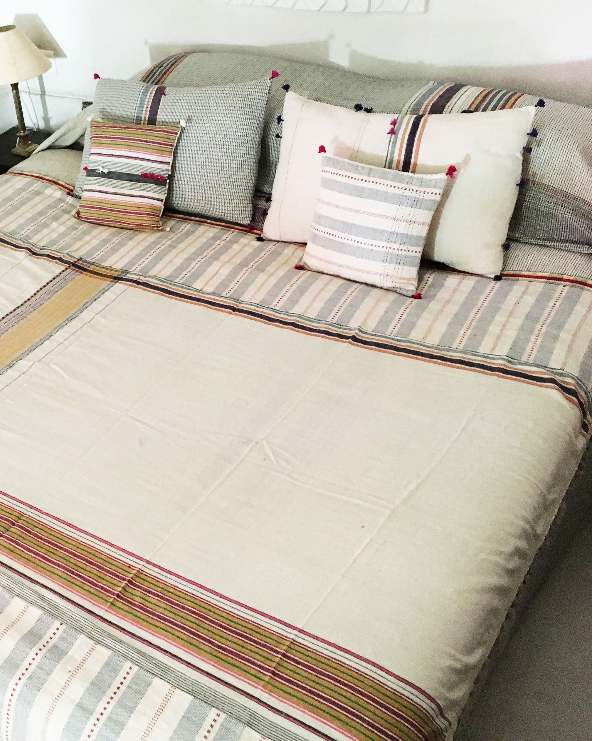 This Bhujodi bedcover, crafted in 100% cotton fabric i.e. 'Mandvi" showcases a blend of intricate stripes and supple woven textures, with delicate tassels that add a touch of character to the edges.