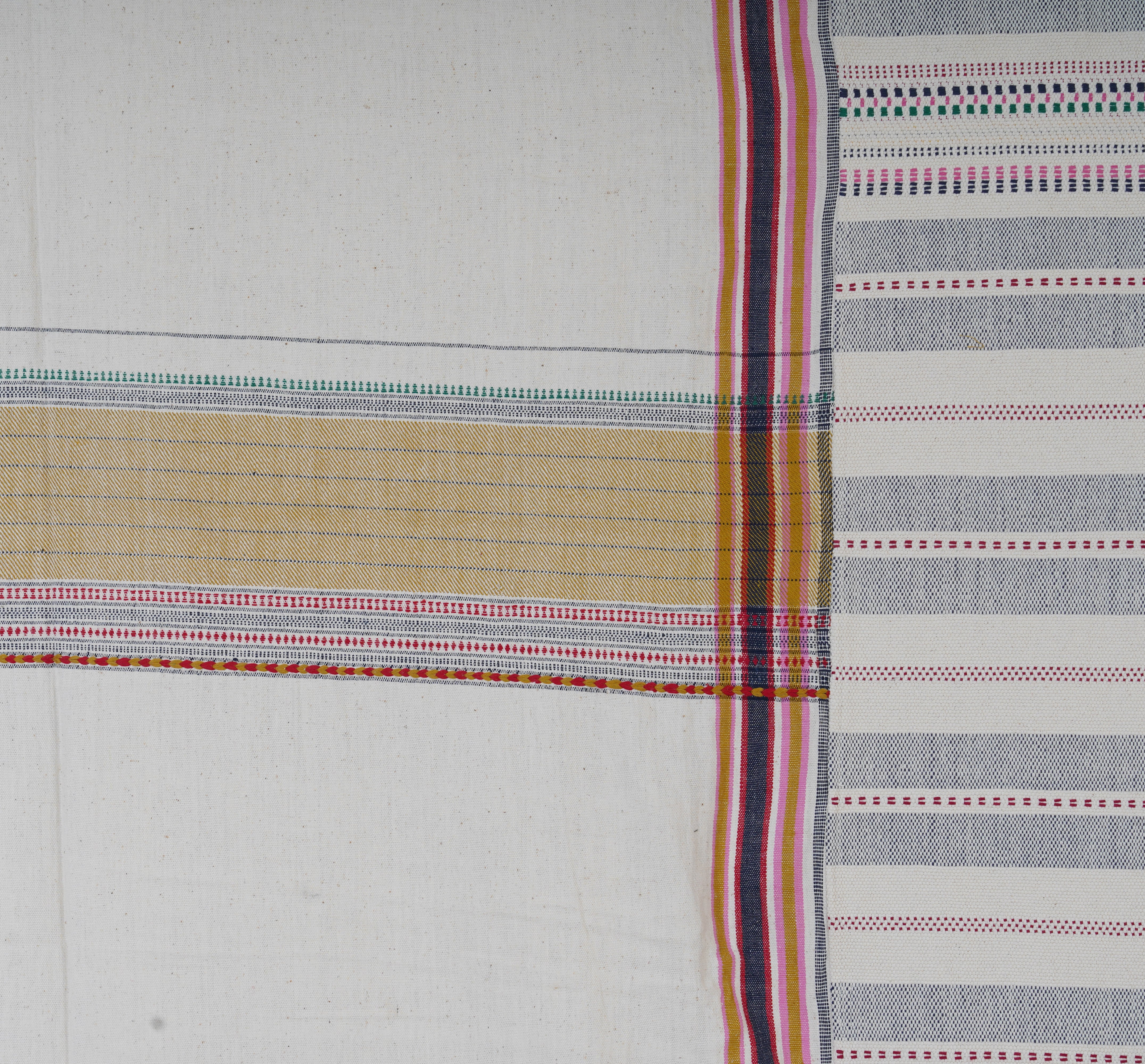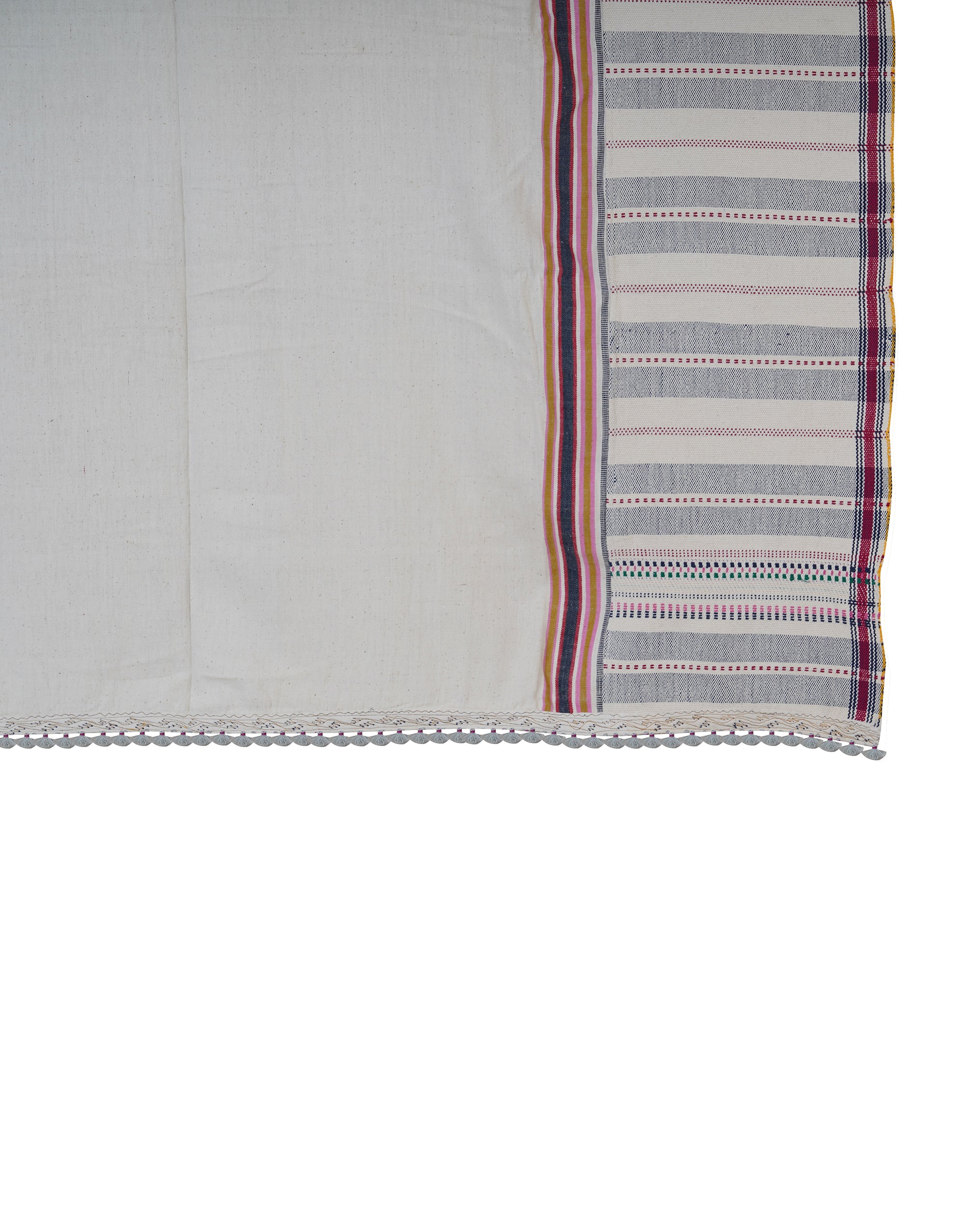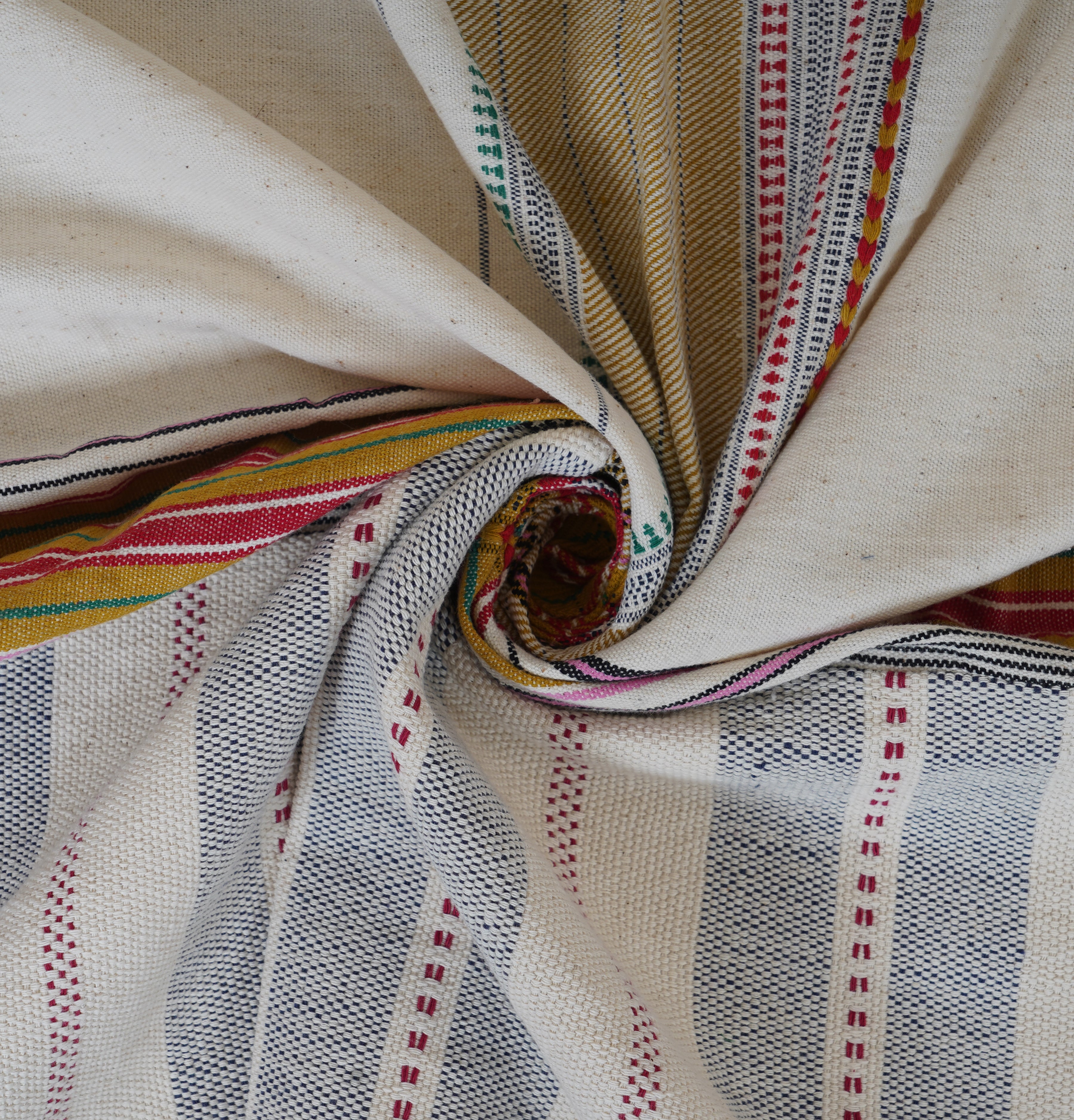This Bhujodi bedcover, crafted in 100% cotton fabric i.e. 'Mandvi" showcases a blend of intricate stripes and supple woven textures, with delicate tassels that add a touch of character to the edges.