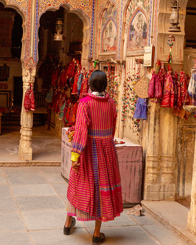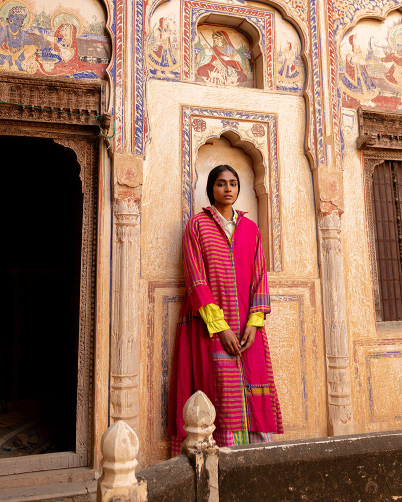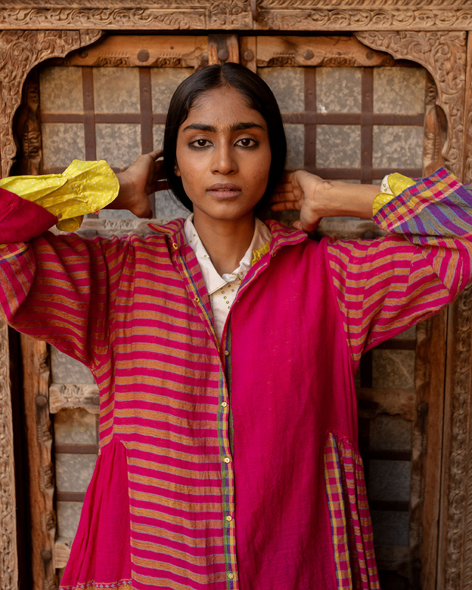 Mewar dress in handwoven merino wool in crimson pink from Gujarat, featuring a front opening and a classic shirt collar. Side gathers create a relaxed fit, while the structured front gives it a statement look. Designed as a dress but versatile enough for layering.