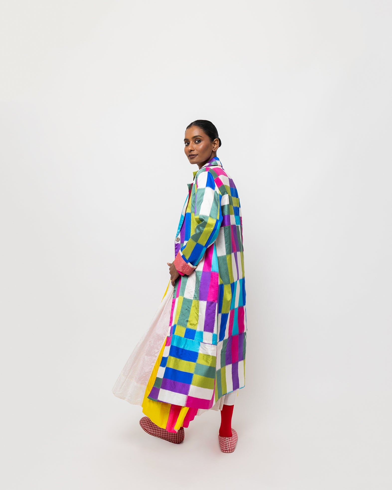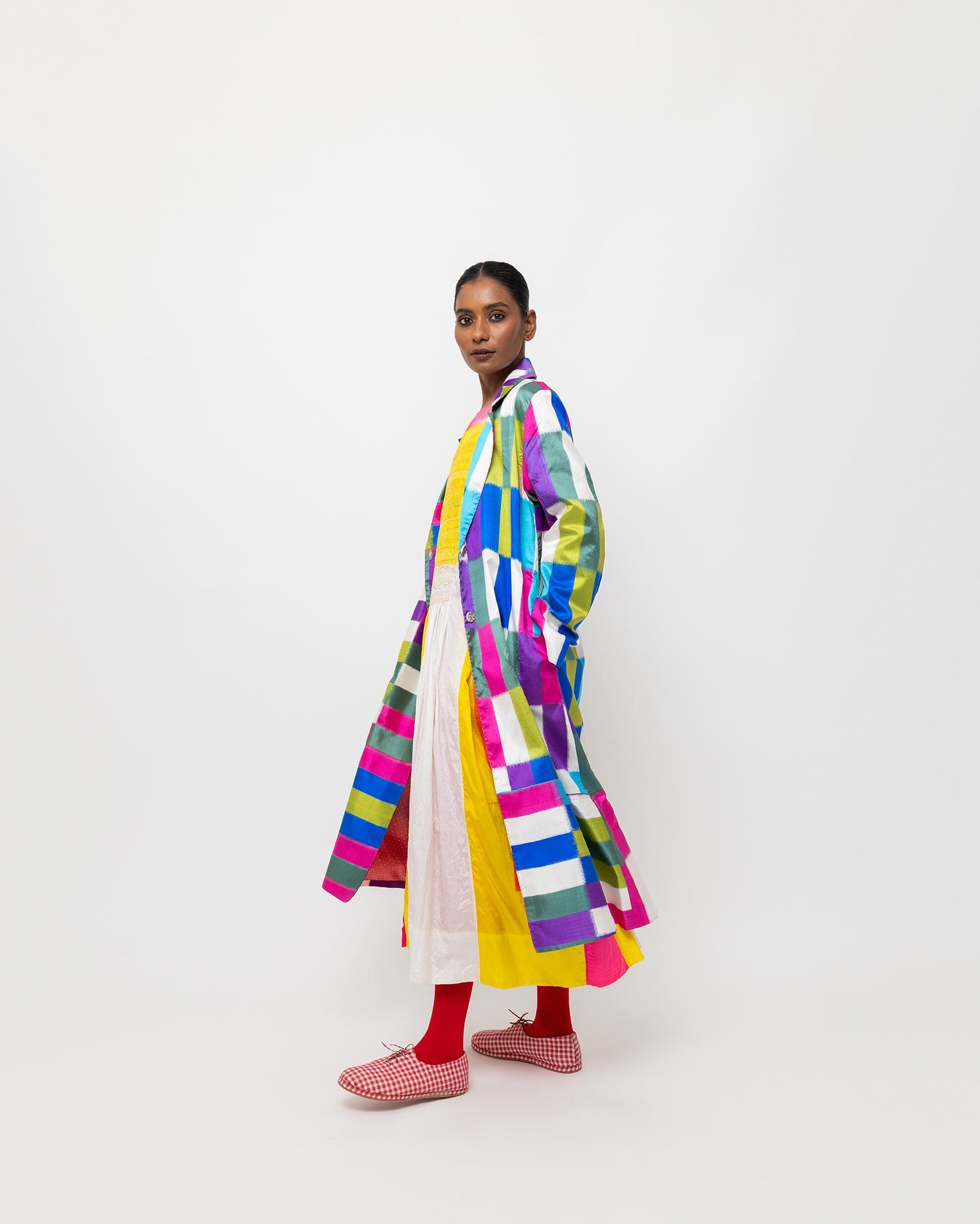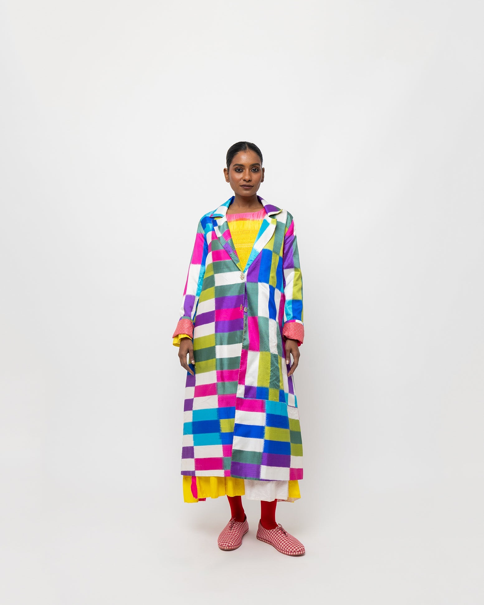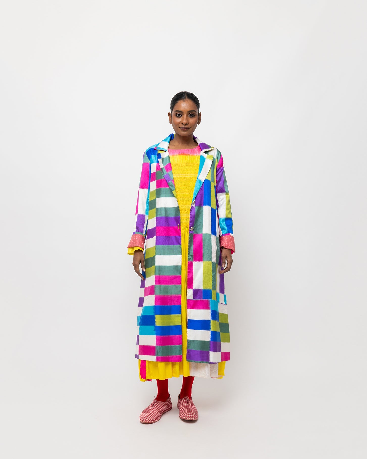 The Mosaic jacket is crafted in woven ikat silk, featuring a grid of multicolour patterns created on a single continuous yardage. Designed with a notched collar neckline, front button closure, and a relaxed straight silhouette, it is lightweight and suited for easy layering.