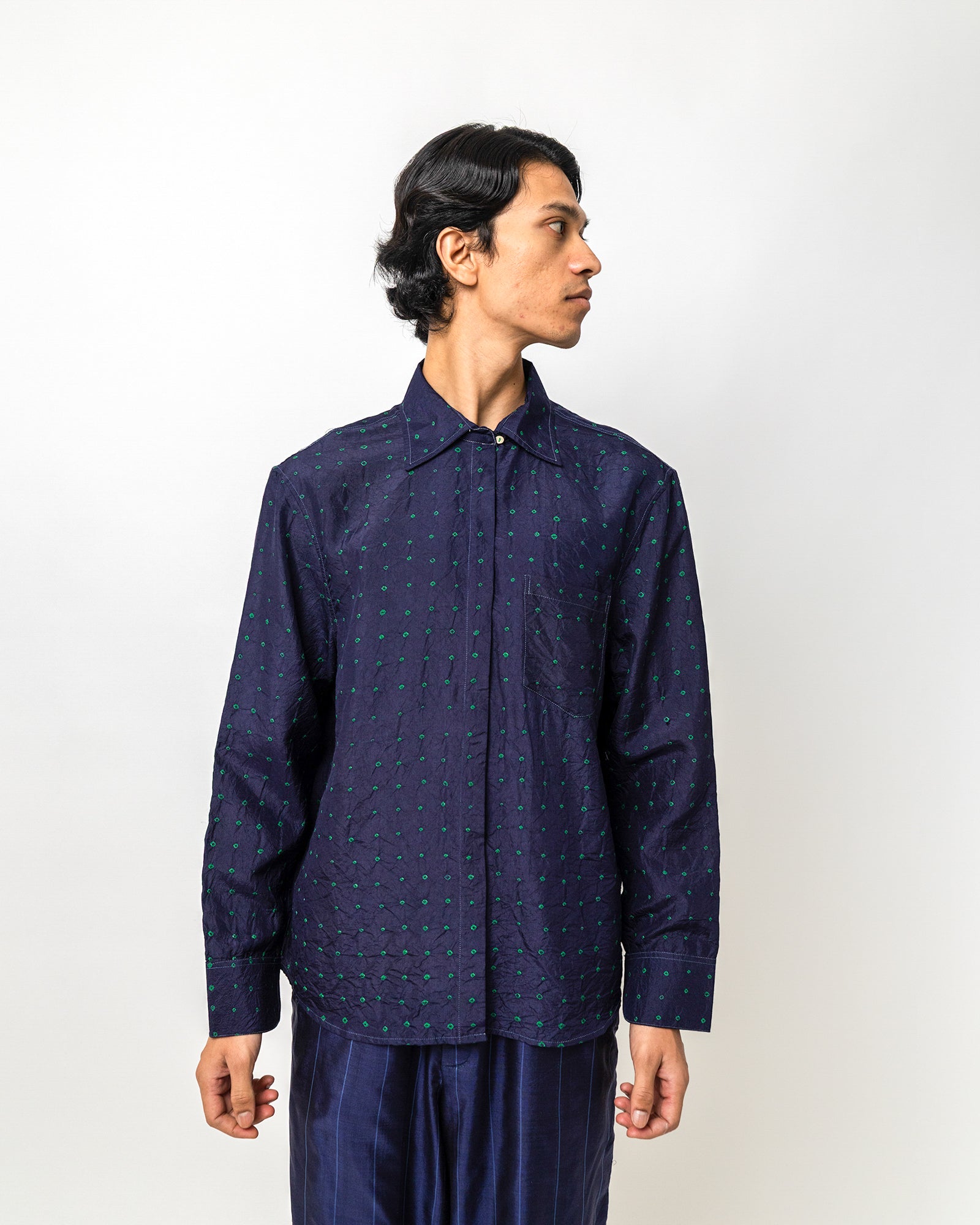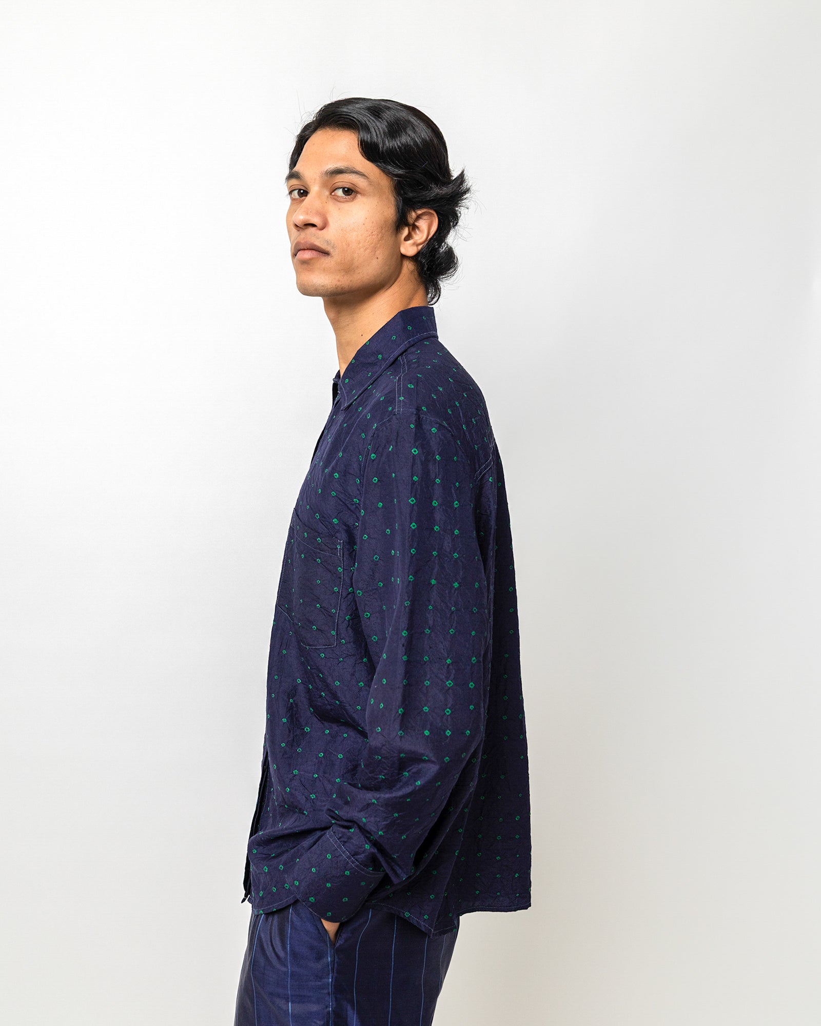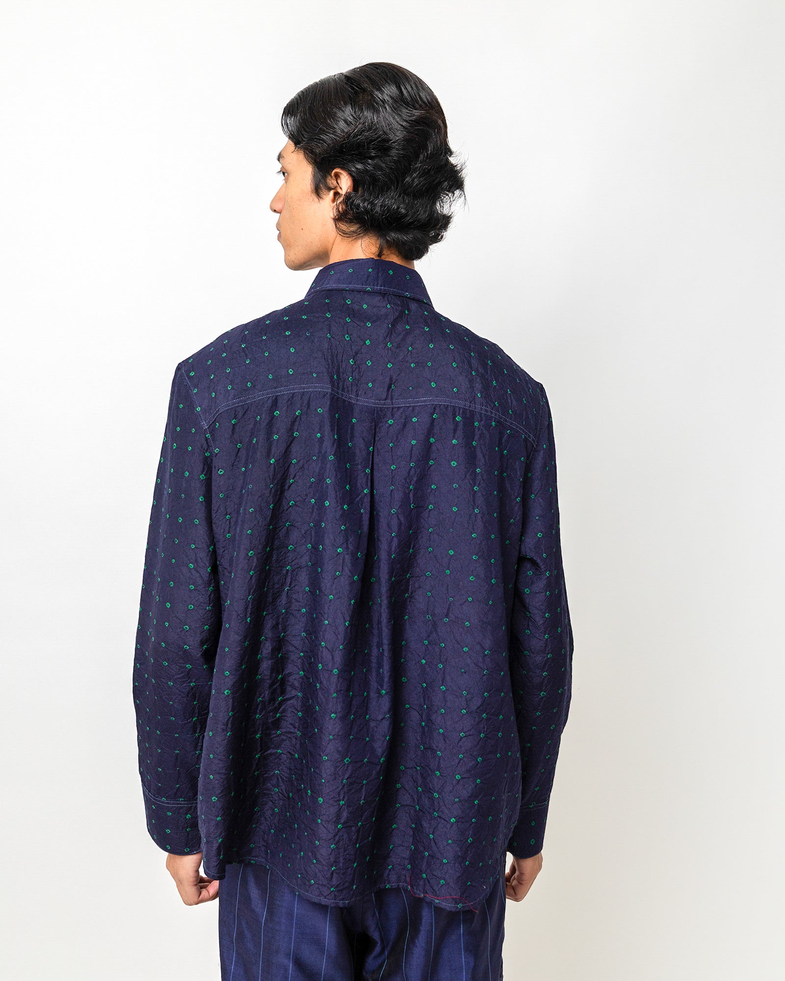 The Nadir Bandhani Shirt is crafted in silk and hand tie-dyed using traditional Bandhani techniques from Gujarat. Designed with full-length sleeves and a classic shirt collar, it features a regular fit and fine green dotted patterns across a deep navy base.