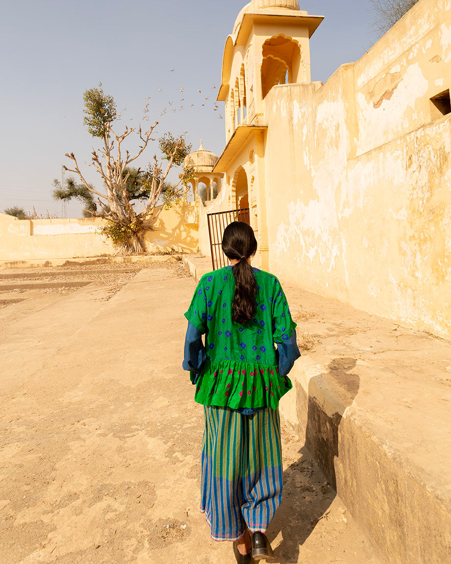 Nagaur Merino Pyjama in shades of blue, handwoven in Gujarat. The loose-fit trousers offer a comfortable and relaxed fit, making them a perfect go-to piece for vacation or casual wear.