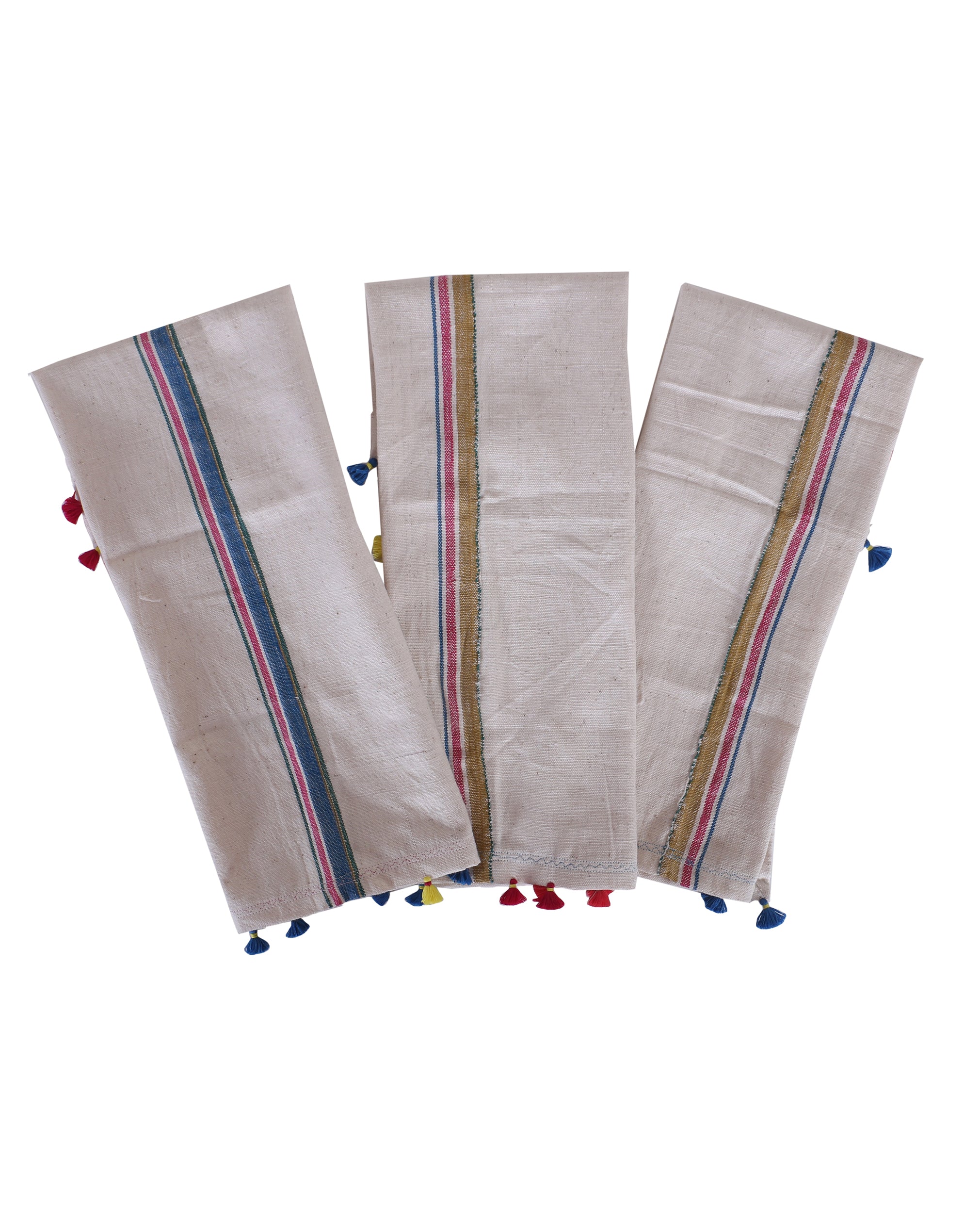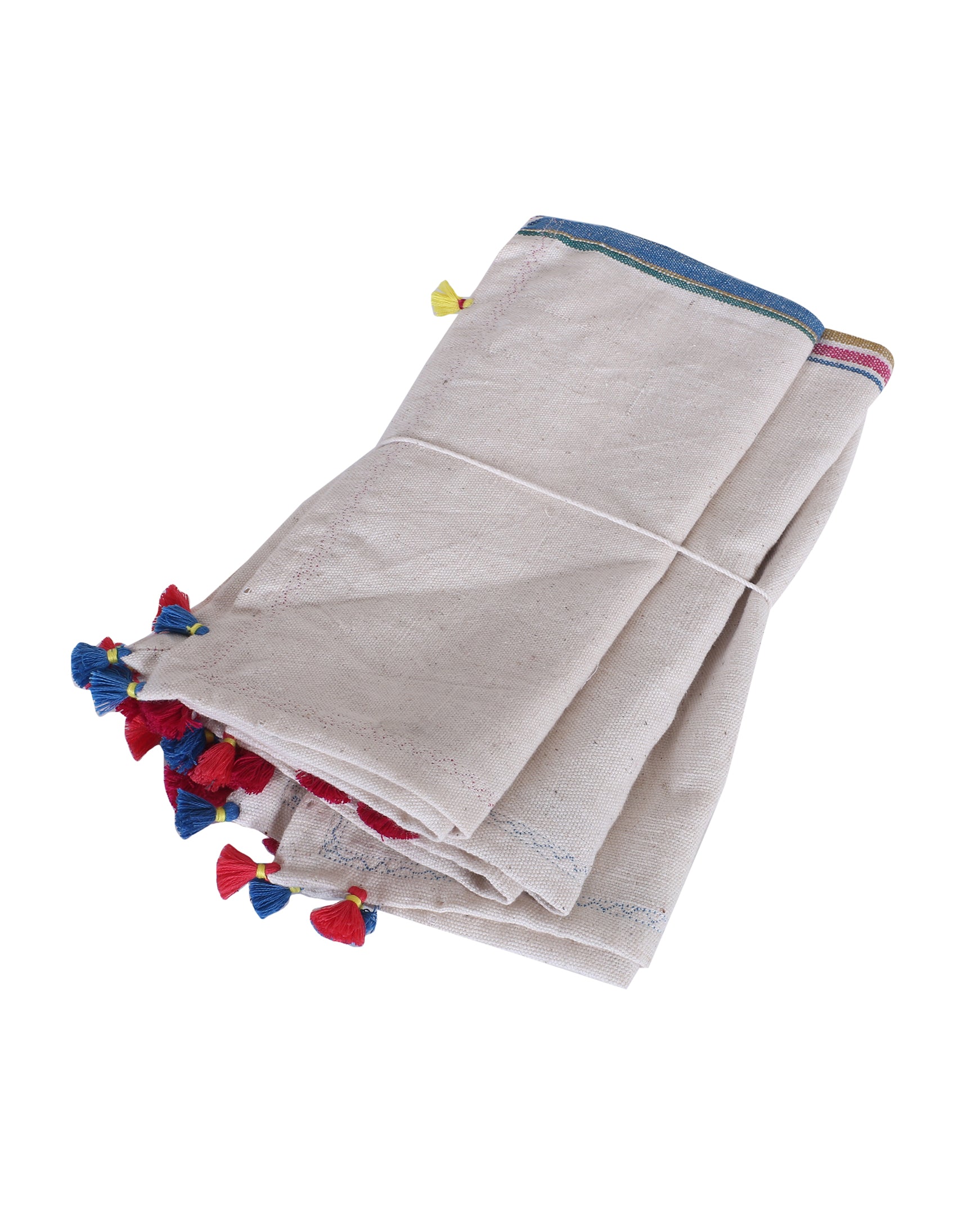 Crafted from soft, pure cotton and woven using the traditional Bhujodi technique, this set of four coasters brings both charm and functionality to your table. The combination of bold stripes and playful tassels at the edges creates a striking, yet balanced design. These lightweight coasters not only protect your surfaces but also add an artisanal touch to your décor. Pair them with rustic ceramic mugs or elegant glassware for an effortlessly chic look. Their versatility makes them ideal for both everyday use and special gatherings, adding texture and color to any setting.