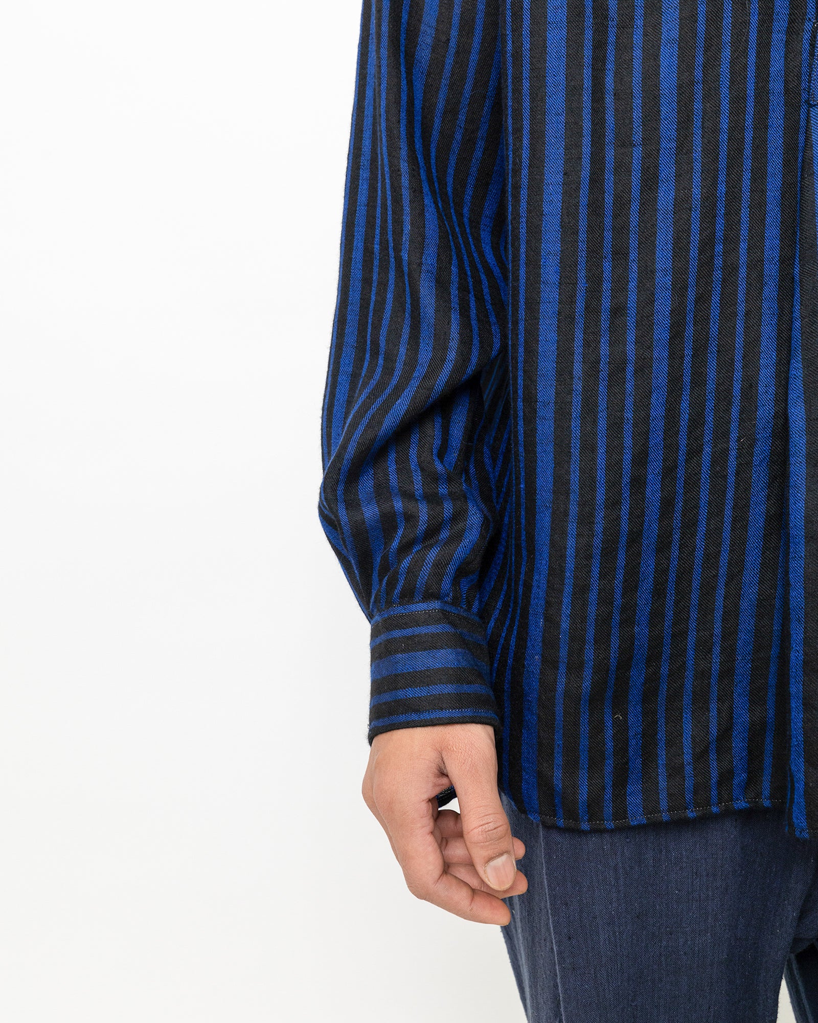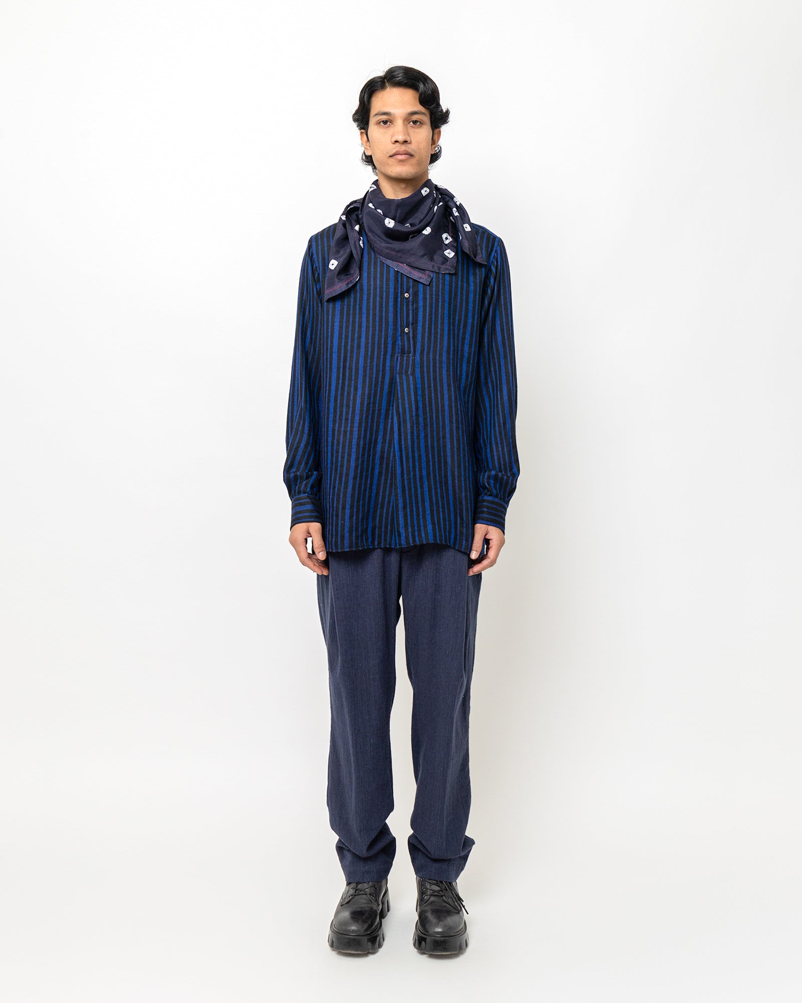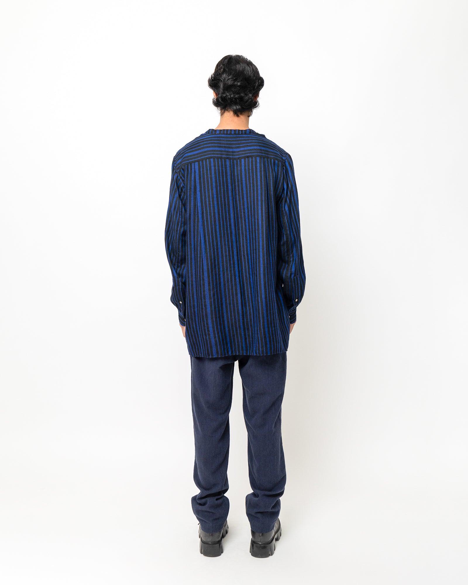 The Nalin Kurta is crafted in soft Cashmere wool, handwoven in deep navy and cobalt stripes. Designed in a relaxed, mid-thigh–length silhouette, it features full-length sleeves, a band collar, and a half button-down placket. Subtle side slits and a gently curved hem allow ease of movement, while the vertical striping lends a clean, elongated look.