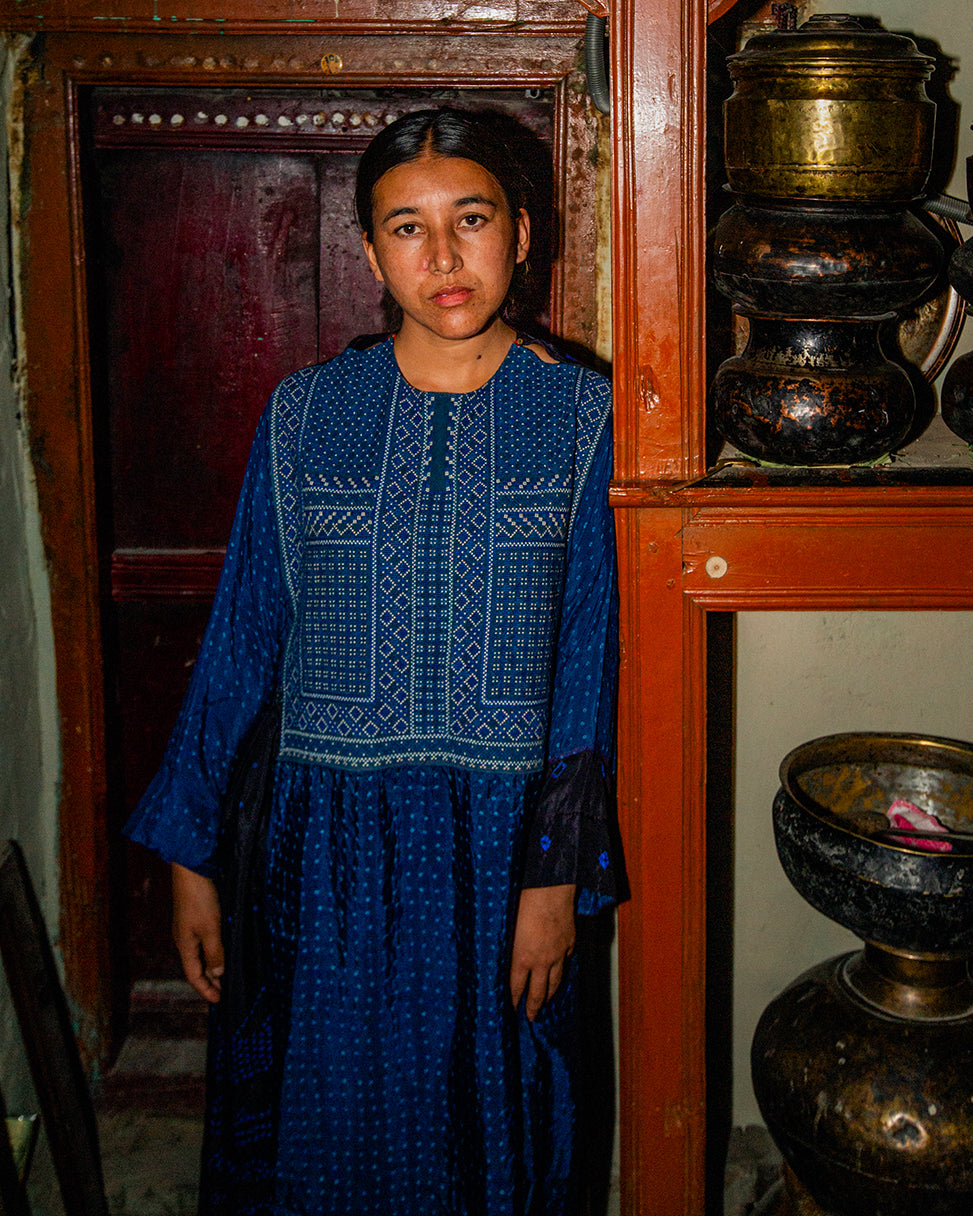Namgyal Dress in lightweight silk, featuring deep blue and black hues with delicate bandhani dots. It has a heavily hand embroidered yoke, a round neckline and full sleeves. It has A-line silhoutte making it a comfortable and relaxed fit.