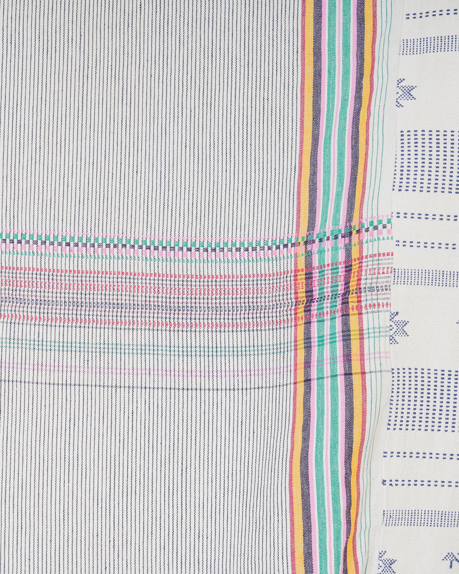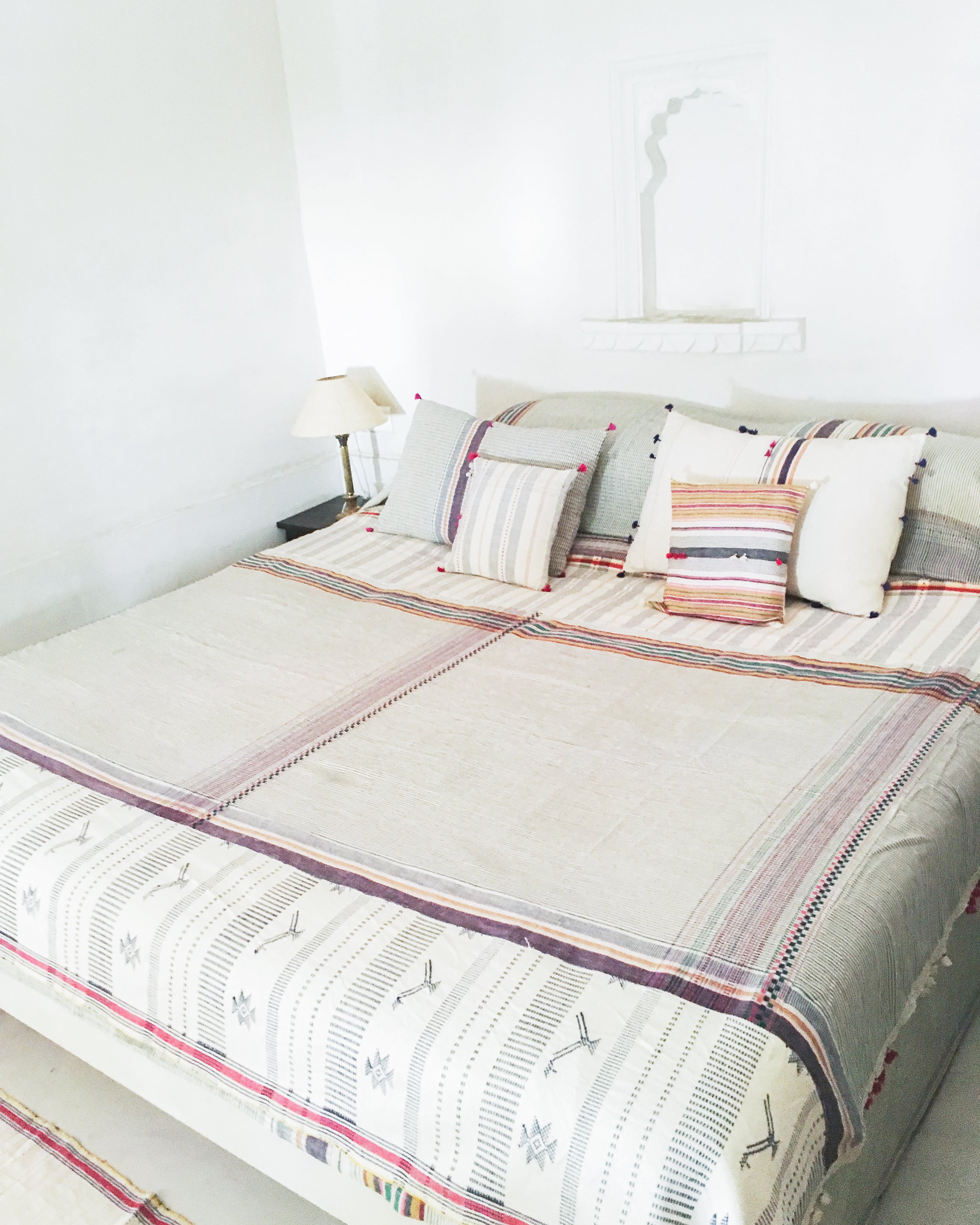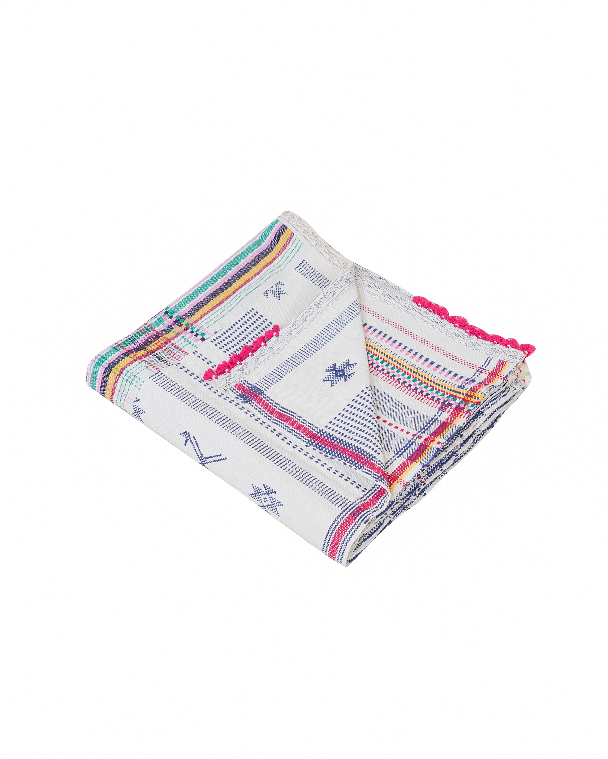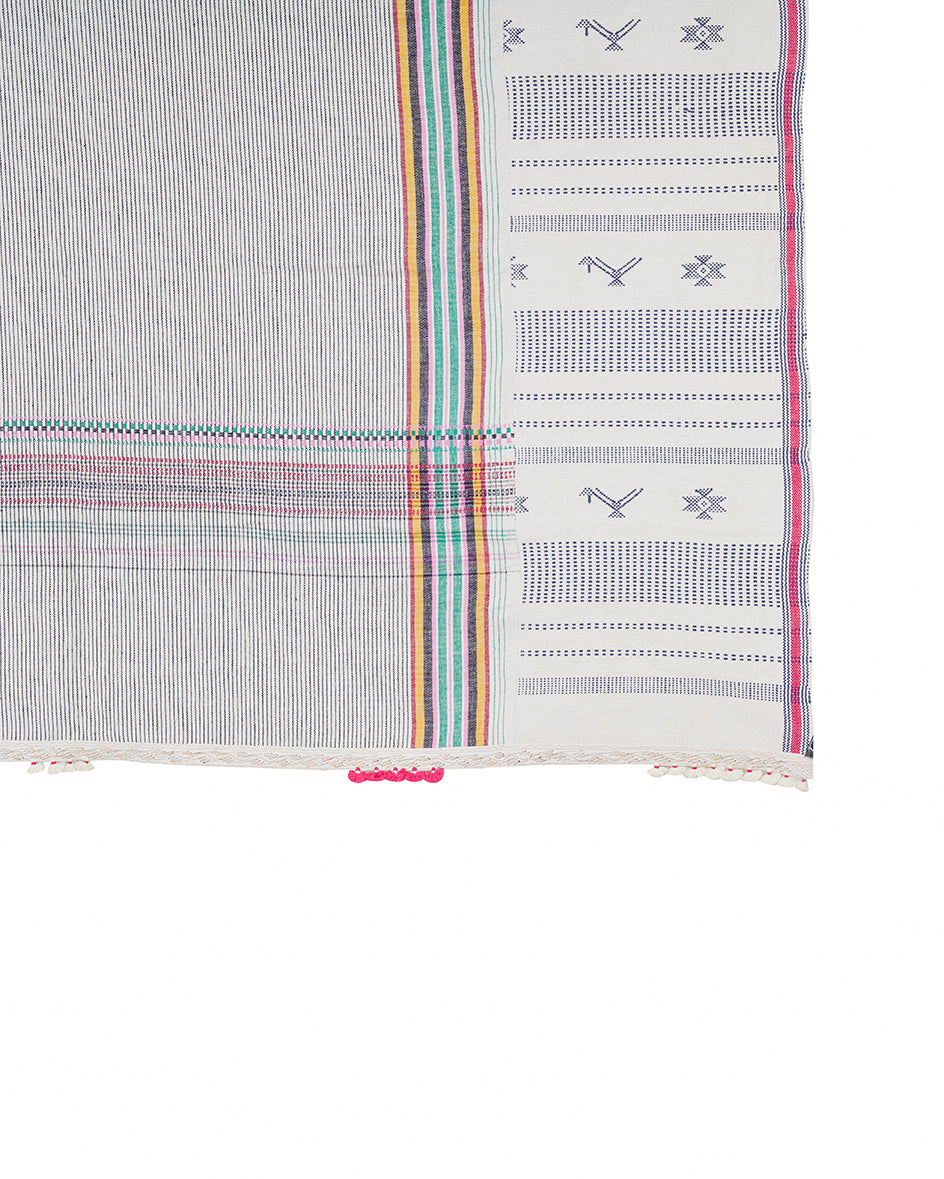 Naranpura' is a bedcover is defined by its geometric stripes and motifs alonbg with tassel embellishments, reflecting the skill and artistry of Gujarat’s weaving traditions. Woven in 100% cotton using the bhujodi weaving technique, this piece is a true reflection of Gujarat's craft traditions.